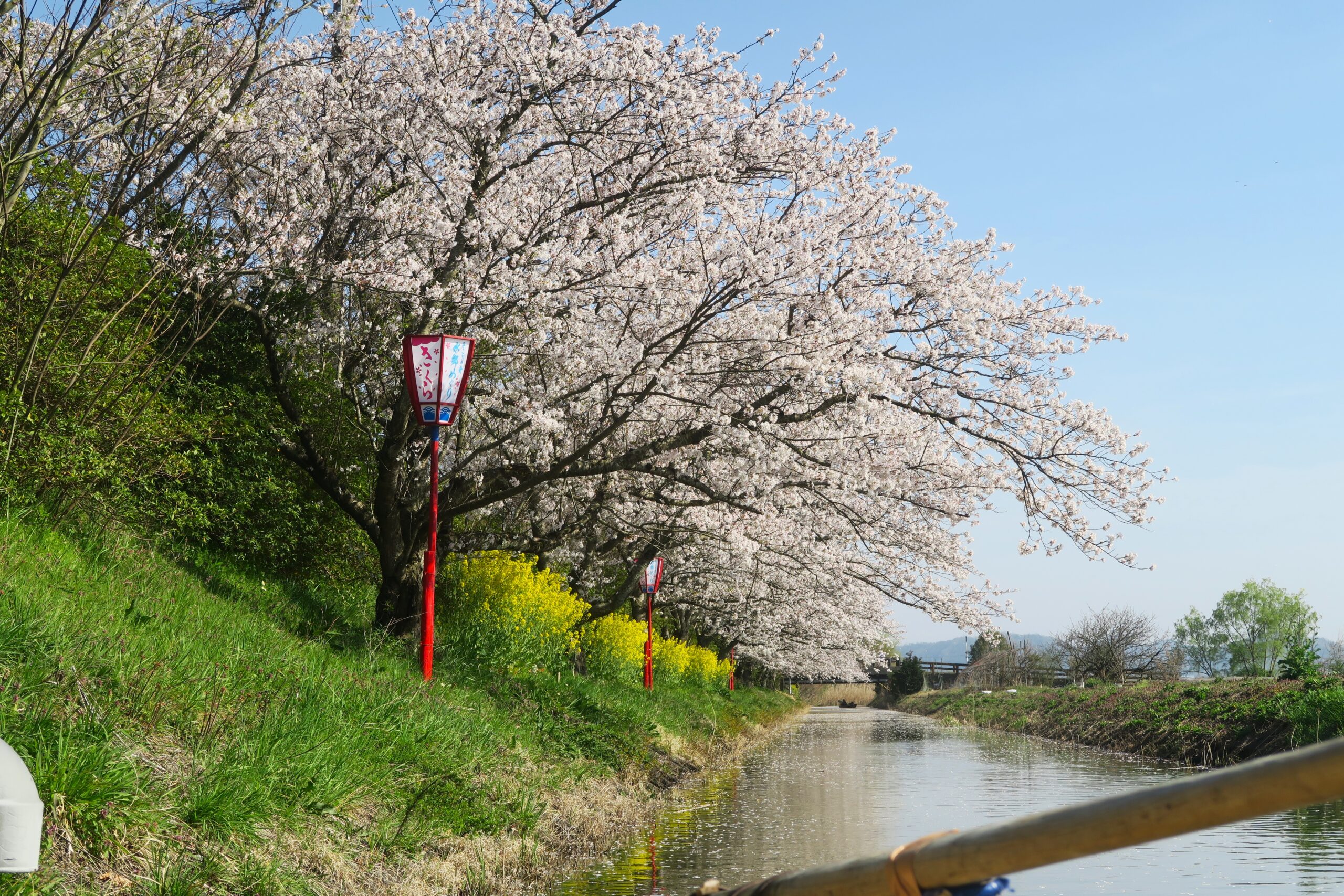 桜はコースのあちらこちらにありますが、このコースのメインとなる“桜と菜の花の競演”は、最初のヨシの群生を抜けて二つ目の橋・兼平橋をくぐって通称さくら堀という細い掘割りに入ったところから約40本のソメイヨシノが200mに渡り、頭の上に覆いかぶさるように咲いています。そしてその根元と土手には黄色い菜の花が彩を添えています。乗船せずに写真だけ撮るなら米塚橋が撮影スポットです。