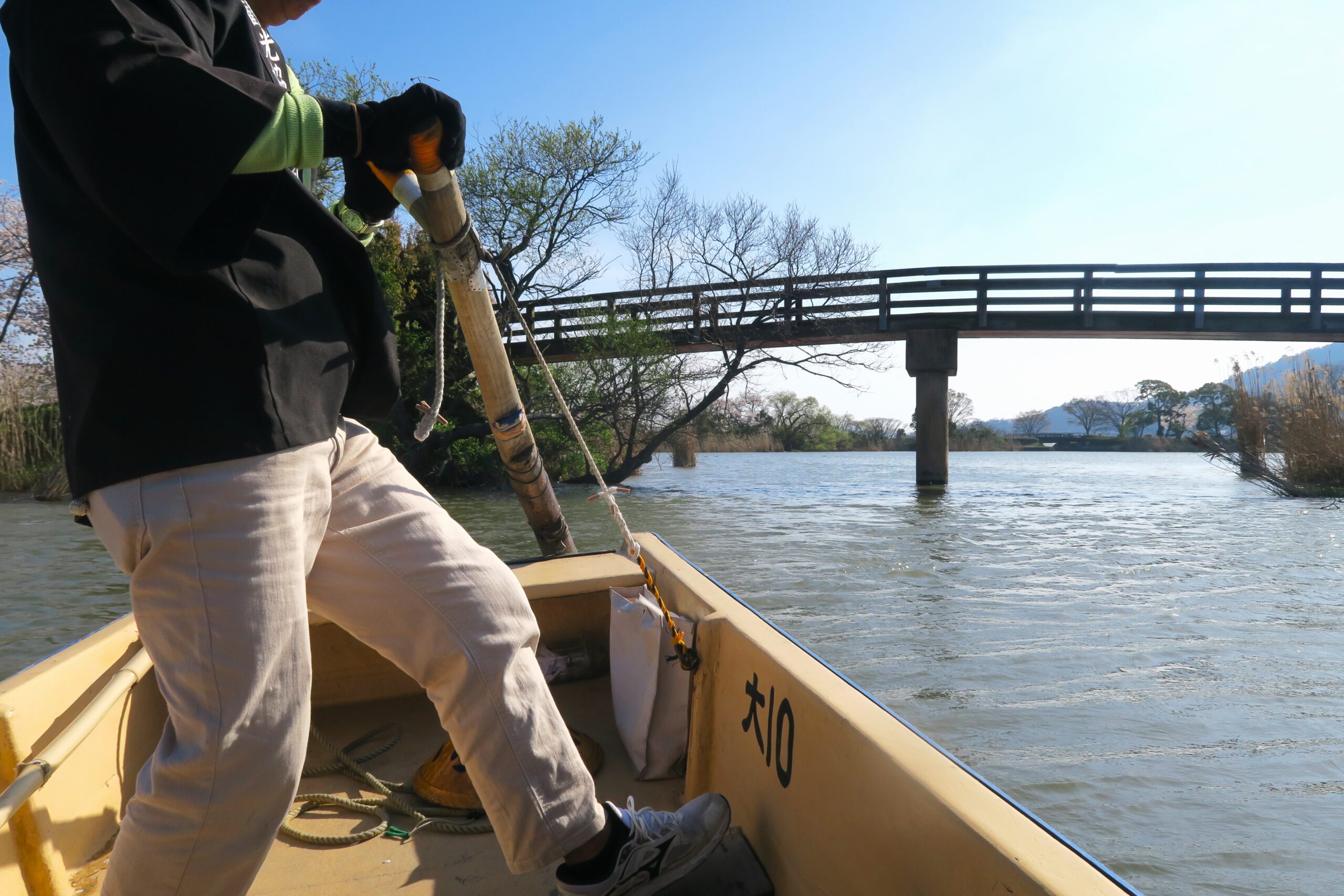 櫓だくでなく竿も巧に操る船頭さん。時代劇のロケ地など、見どころを教えてくれるのも楽しい。写真の6つ目橋のもどり橋は必殺仕事人などの時代劇のロケ地になる木橋です。コンクリートの橋脚はコンピューター処理で消されているらしいのですが。
