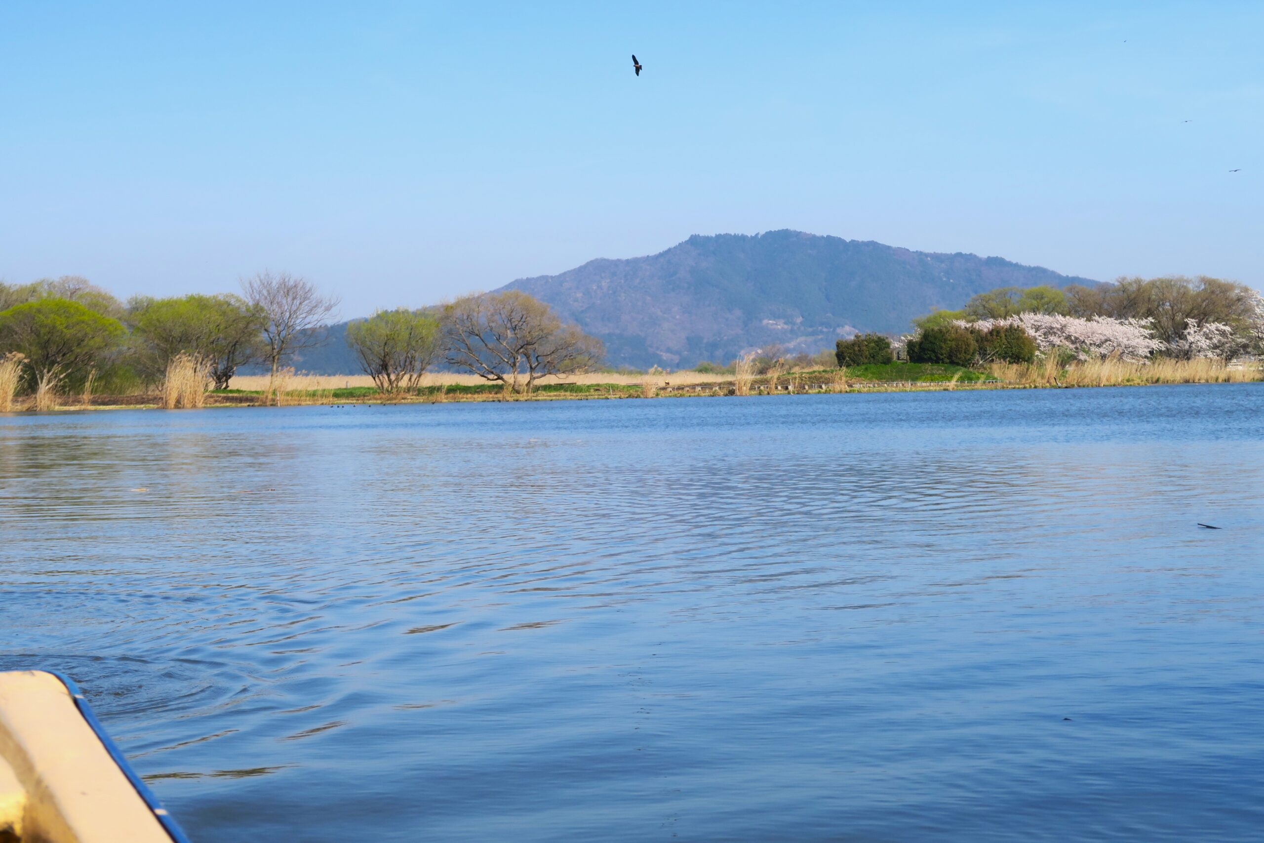 もどり橋をくぐり、舟に揺られながら、遠くの景色を眺めていると、豊臣秀次がこの地を居城として選んだのにもうなずけます。ここは近江八景のひとつに数えられる景勝地『春色 安土八幡の水郷』です。水辺にはアオサギなどの鳥や、亀が生息しています。聞こえてくるのは櫓をこぐ音と泳ぐ水鳥の鳴き声、湖岸には広大なヨシ原が続きヨシの葉を伝わる風の音。目の前には、前方に繖山、その手前に見える山が安土山でかつて戦国の覇者・織田信長が築いた安土城があった場所です。信長が城から西に見えるので「西の湖」とつけたといいます。いにしえの近江に思いを馳せます。