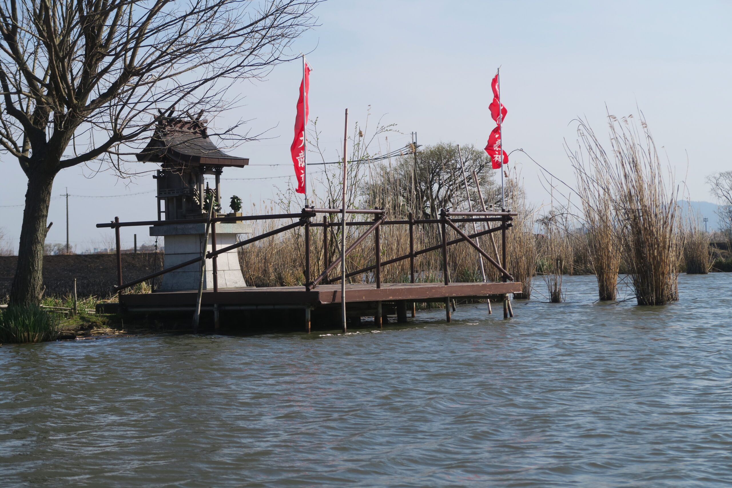 船頭さんの巧みに操る和船に揺られ、再びヨシ地帯の細い水路に戻ると、小さなお社が見えてきます。