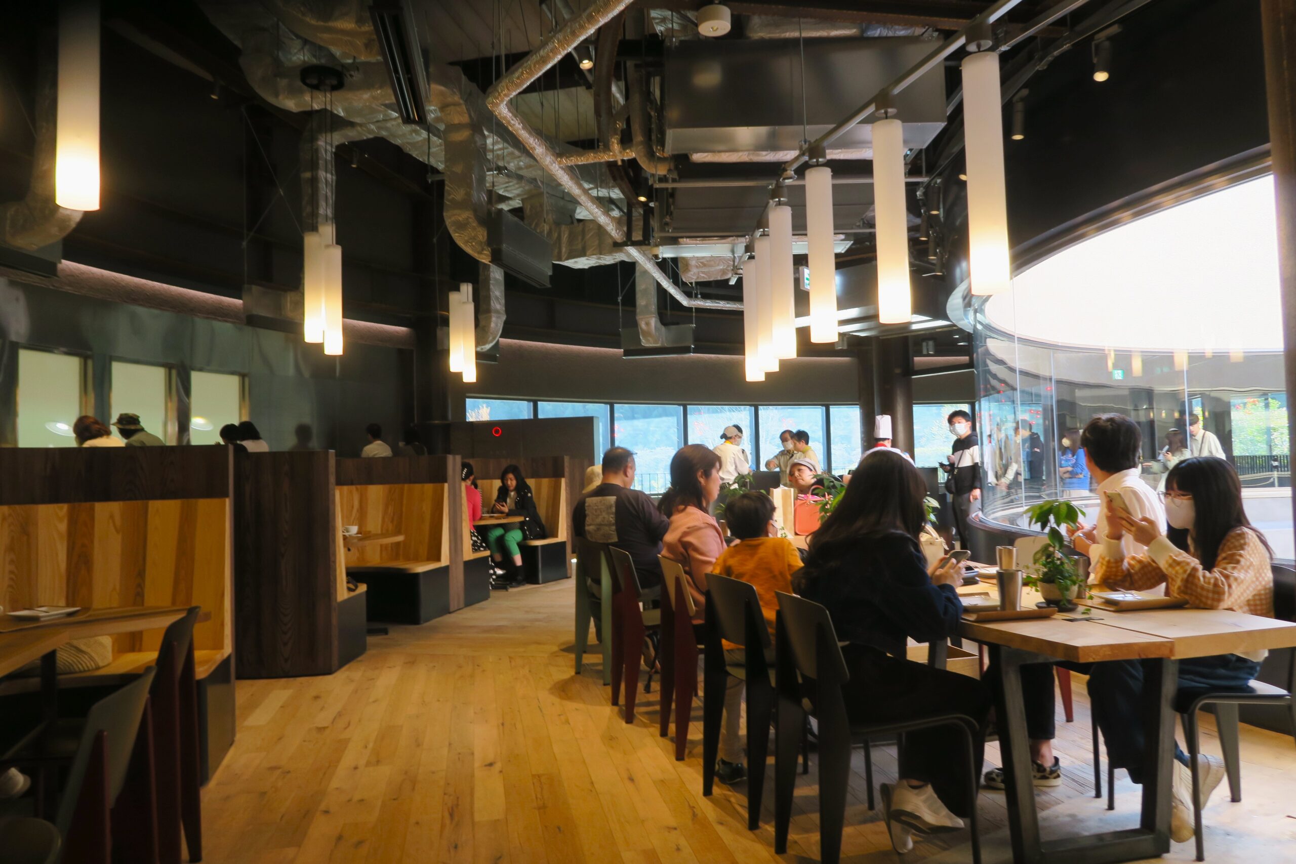 メインショップを正面に左回りに写真の右から栗の木を100本以上も使って建てられた「カステラショップ&カフェ」、ハットを被せたような本社オフィス、そしてその隣には2023年1月11日にオープンした「バームファクトリー」が建ちます。クラブハリエで最大規模を誇るバームクーヘンの新店舗は真上から見るとバームクーヘンの形になっているとのこと。建物は2階建てで1階がショップ、2階がバームファクトリーカフェになっています。