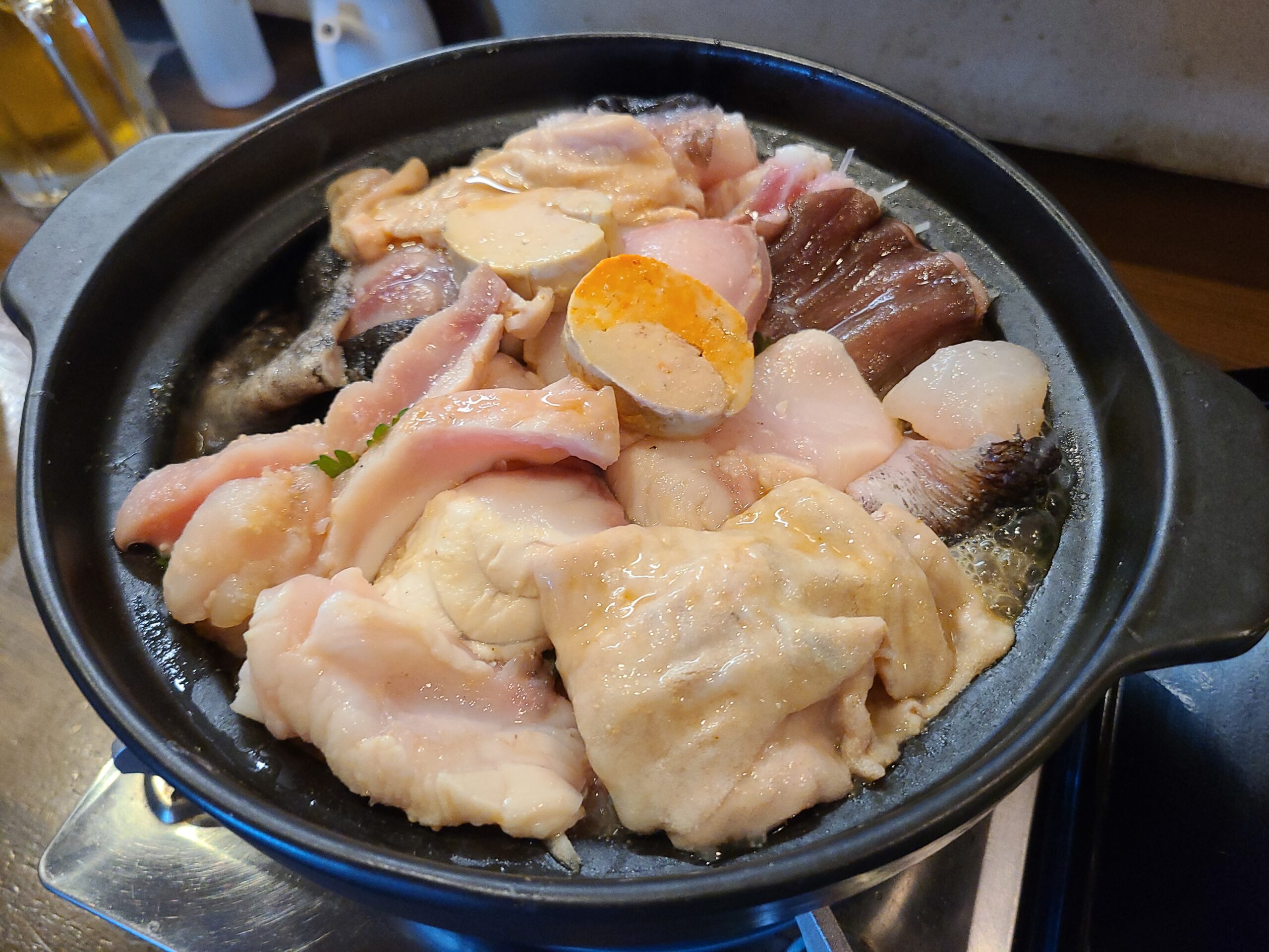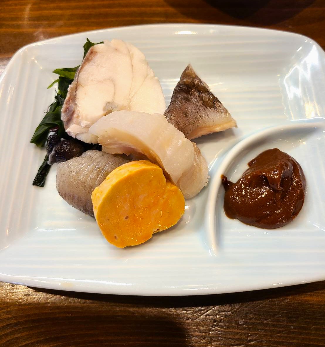 アンコウ鍋に必ずセットされるのがアンコウの供酢です。ゆでた身をあん肝と酢味噌であえたタレにつけて食べる郷土料理です。他にもアンコウの刺身と本日の刺身(ハマチ・カツオ・タイ)、アンコウの唐揚げがついています。