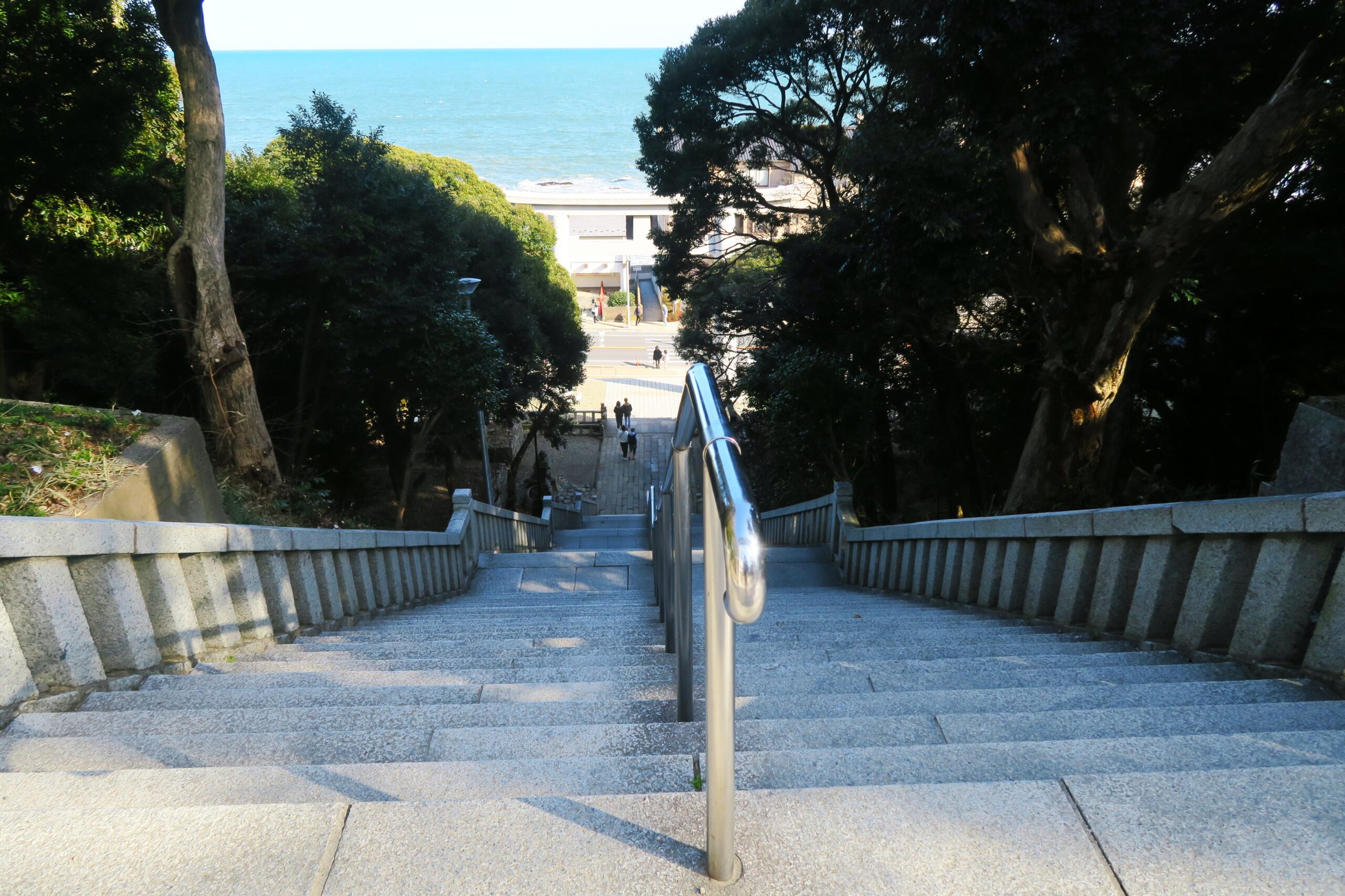 91段のちょっと急な階段をのぼります。アニメ「ガールズ&パンツァー」でⅣ号戦車が駆け下っていった階段で、聖地巡礼の定番スポットです。