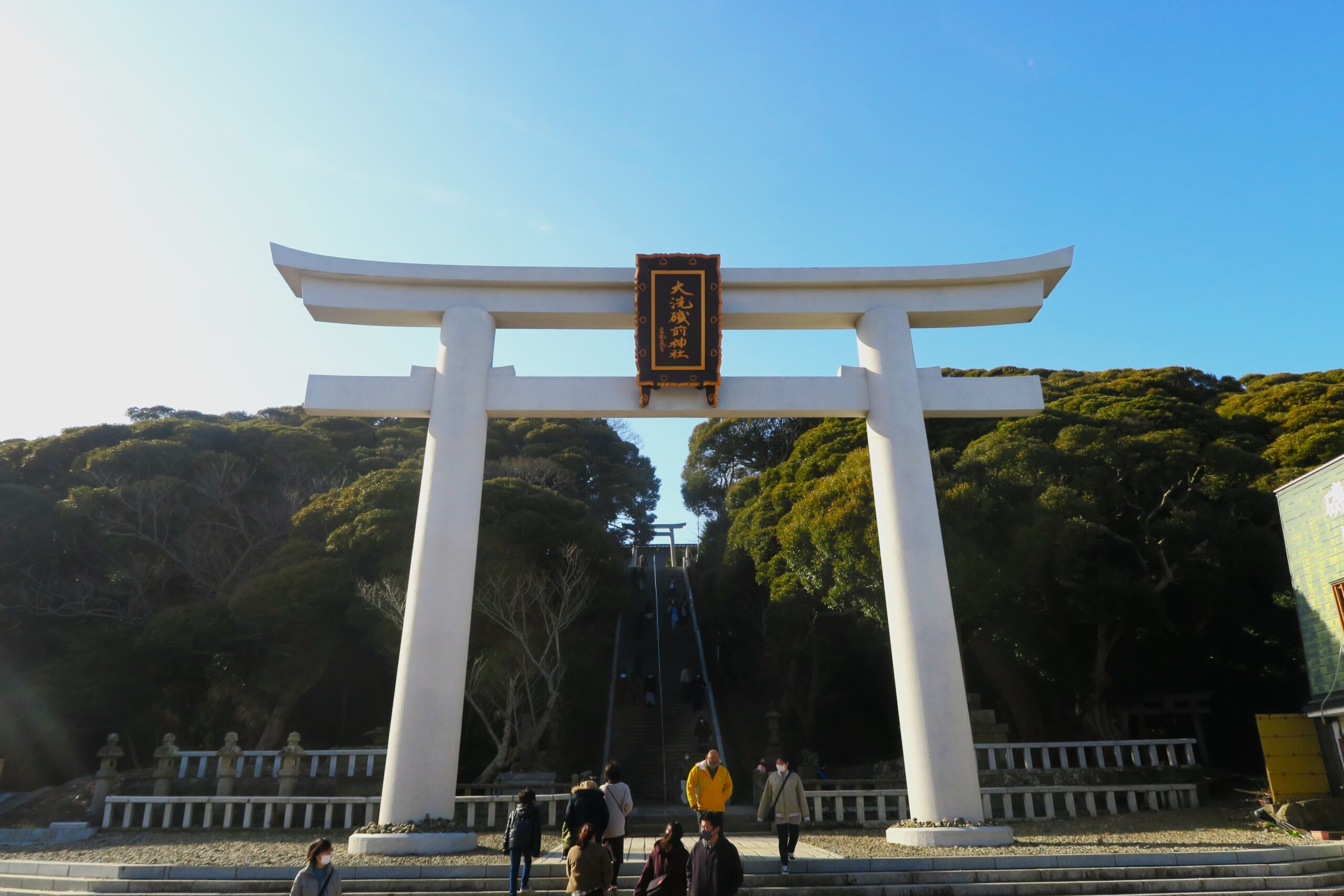大洗のもうひとつの目的が大洗海岸の人気スポット、「神磯の鳥居」。海岸に立つ鳥居で日の出の美しさが人気の撮影スポットです。鳥居が立つ海上の岩場は「神磯」と呼ばれ、1100余年前に大己貴命(大国主命)と少彦名命が降臨したと伝わる聖域です。空と海を背にした鳥居のたたずまいは神々しく、パワースポットとしても大人気。神磯の鳥居はゴツゴツとした岩礁にザザーン、ザザーンと当たって砕け散る白波の荒々しい波音と砂を洗う引き波のさらさらさら…というやさしい音とが交互に押し寄せ、耳に心地よく時間を忘れさせてくれます。水戸黄門こと水戸二代藩主徳川光圀も参拝の折に、「あらいその岩に砕けて散る月を一つになしてかへる波かな」とその景観を称えています。