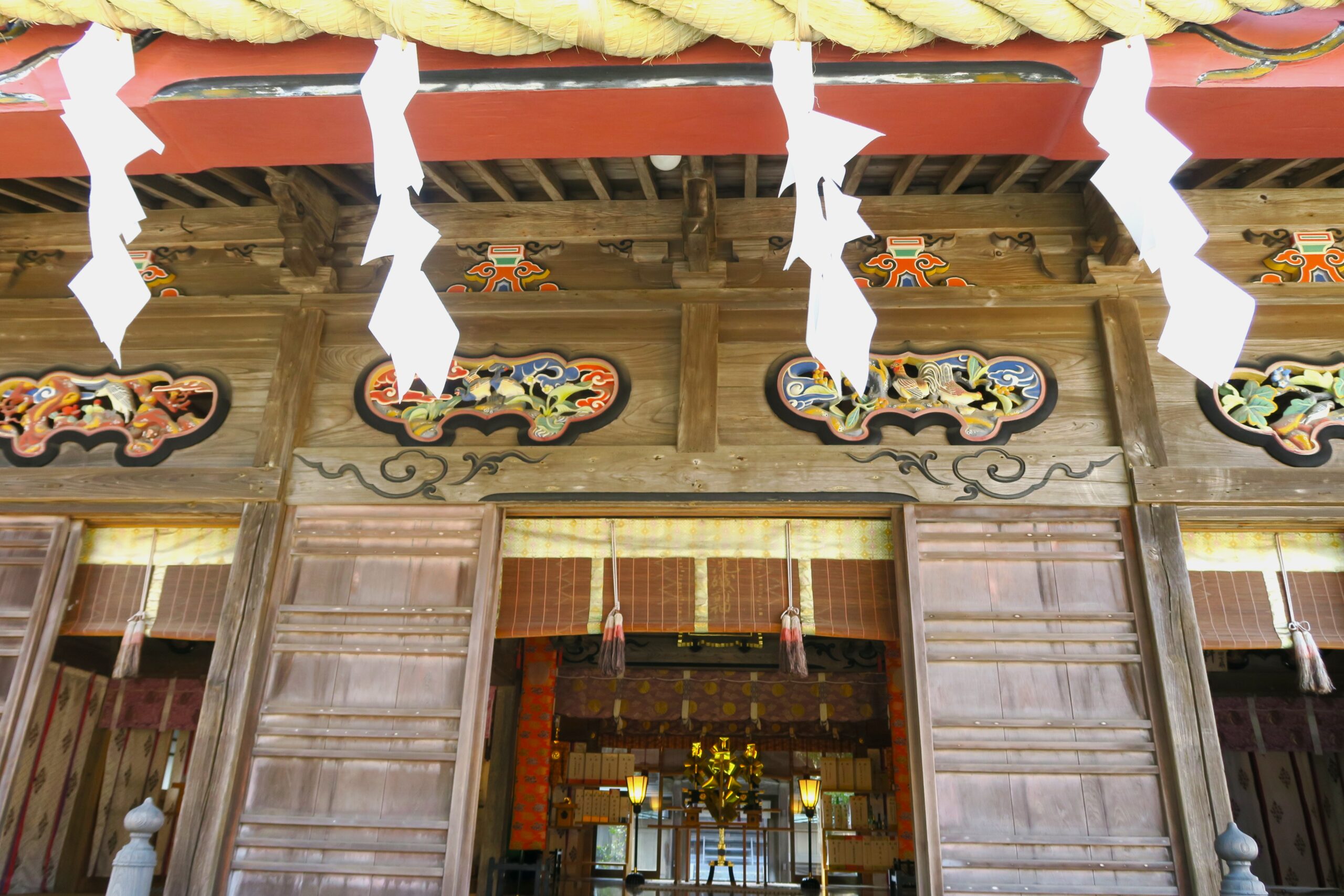 正面の赤い柱が目を引く拝殿ですが、欄間に14の彫刻があります。もともと拝殿は長方形の形をしていましたが、増築を繰り返され今の形(凸型)になり、外から見ることができるのは10枚になてしまいました。御祈祷等で拝殿に上がられた方だけが残りの4枚も見ることができます。どの欄間も鳥と植物が彫られていますが、なぜか一枚だけ鳥がいません。どこかに飛びたっていったという話もありますが、探してみるのもいいですよ。