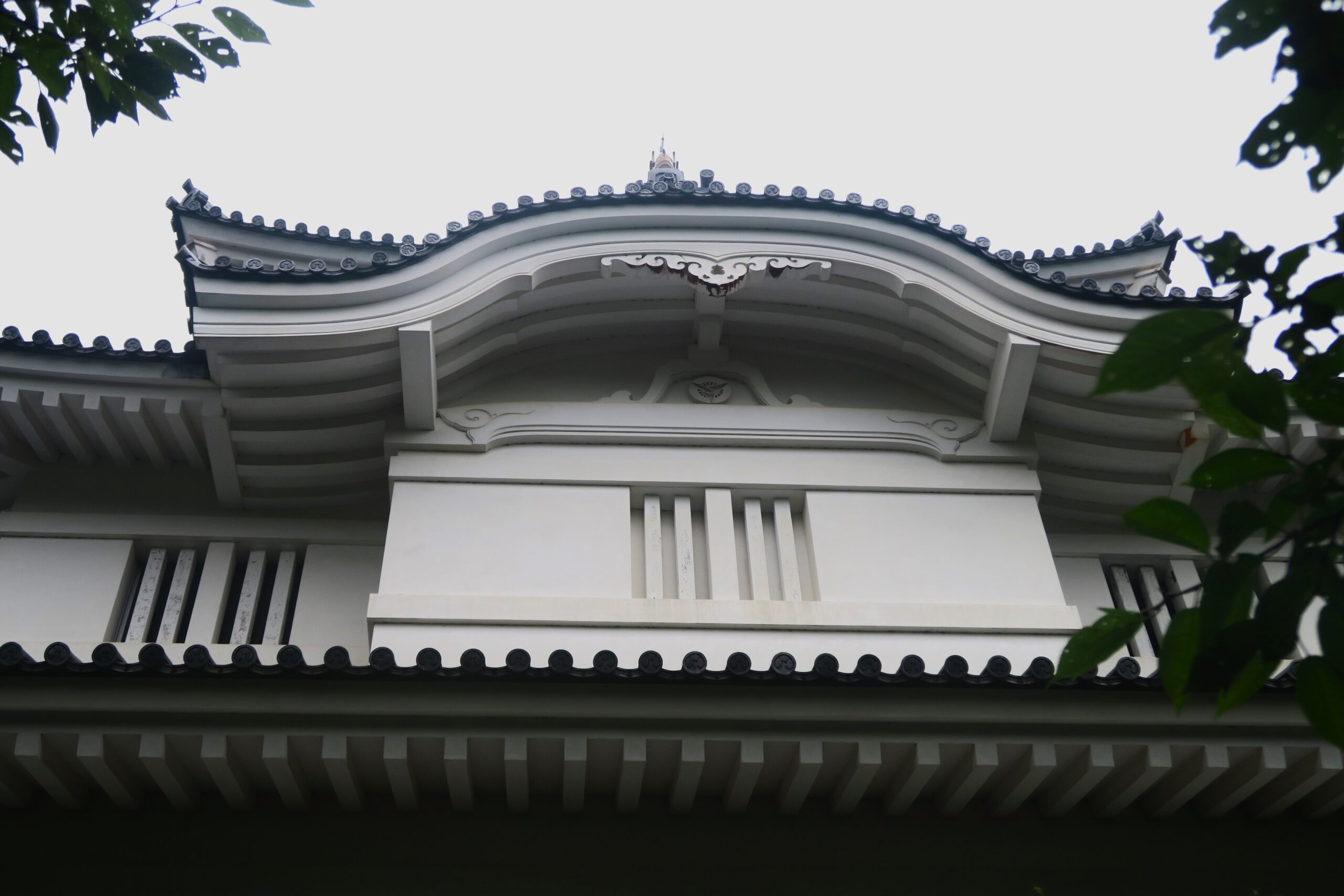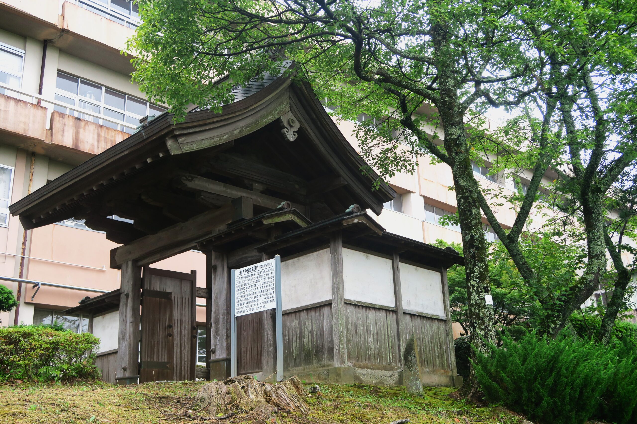 大多喜城を見上げる大多喜高校敷地脇には、大多喜城の建造物で唯一残る医薬門が移築されています。本柱が中心より前方にあり、控柱を付けた薬医門形で、天保13年の火災後に建築された二の丸御殿の門です。
