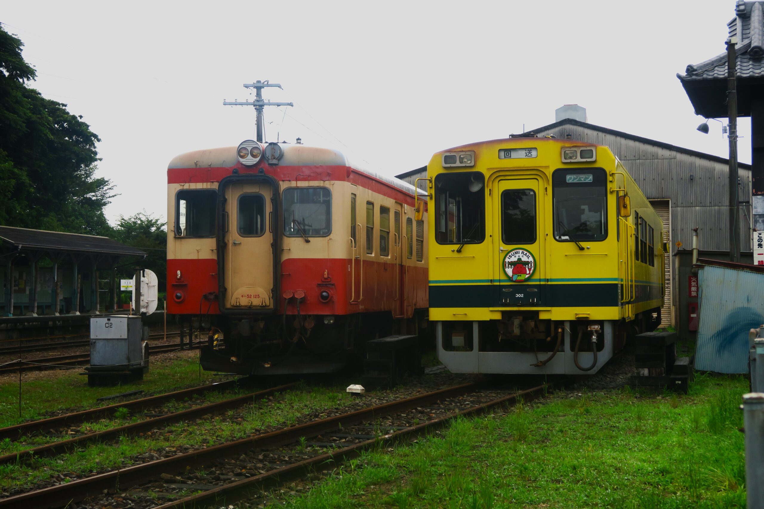 大多喜駅ははいすみ鉄道本社を有する有人駅であり、駅構内東側にはいすみ鉄道の車庫もあり、一般道沿いから間近でいすみ鉄道の車両を見ることができます。写真の黄色い車両がいすみ300形で、平成24年(2012)に導入された新型車両です。隣の国鉄一般色の車両は昭和40年(1965)に製造されたキハ52形125号車で、もともとはJR西日本の大糸線で活躍していましたが平成23年(2011)に引退、同年4月より観光急行列車として営業を開始した車両です。