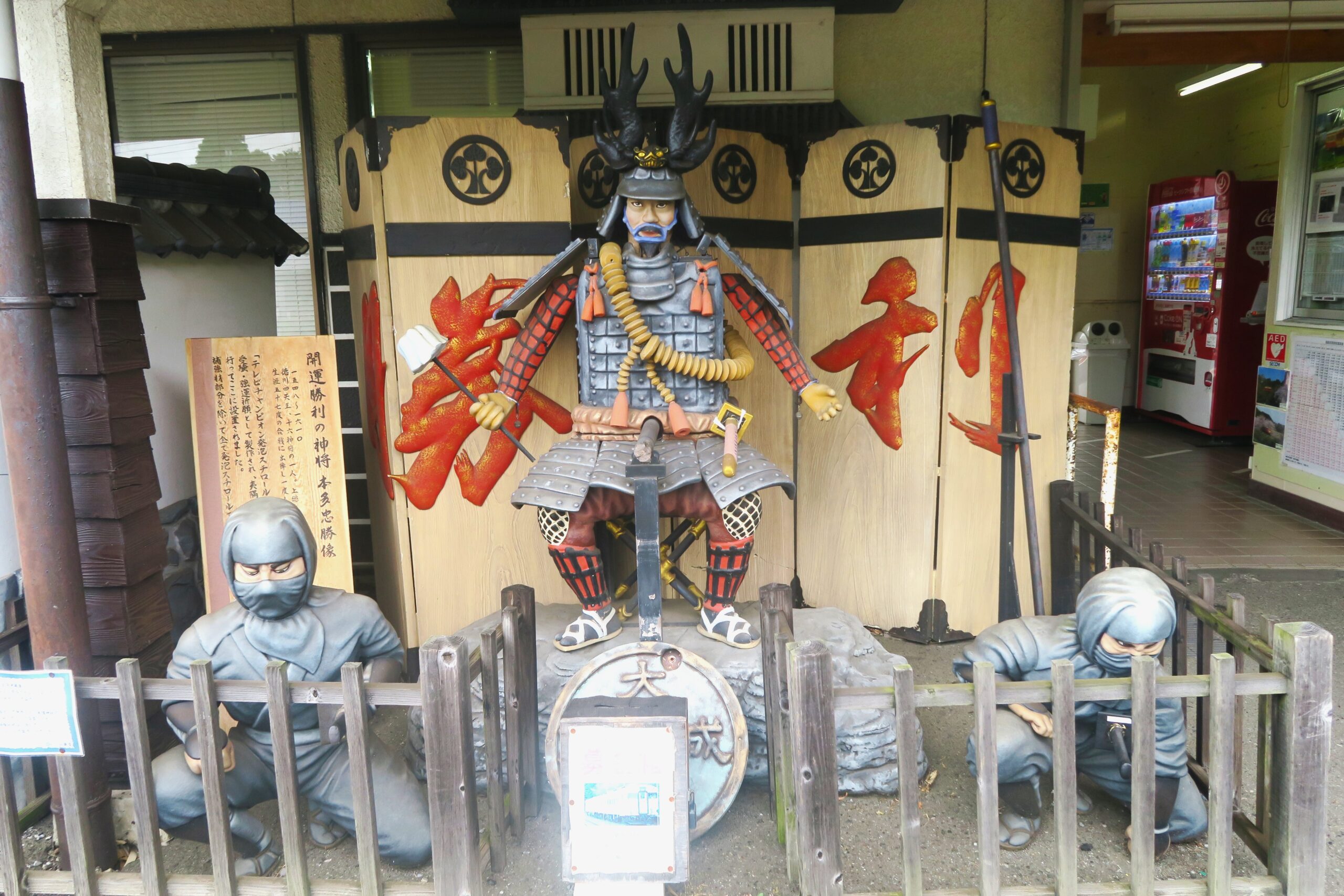 駅構内には忍者を従えた発泡スチロール製本多忠勝の武者人形が飾られています。でTVチャンピオン発泡スチロール王が制作したものです。「家康に過ぎたるものが二つあり 唐の頭に本多平八」。元亀3年(1572)の三方ヶ原の戦いで武田信玄に敗退した徳川家康軍の殿を務めた本多(平八郎)忠勝の武功を称えた落首です。、徳川四天王の一人である忠勝は57度の合戦に参加したが、一度もかすり傷一つ負わなかったと伝わる猛将で、豊臣秀吉から「東国一の勇士」とも賞賛されました。ちなみに落首にある「唐の頭」とは、中国(唐)から伝わったヤクの毛で作られた兜のことです。