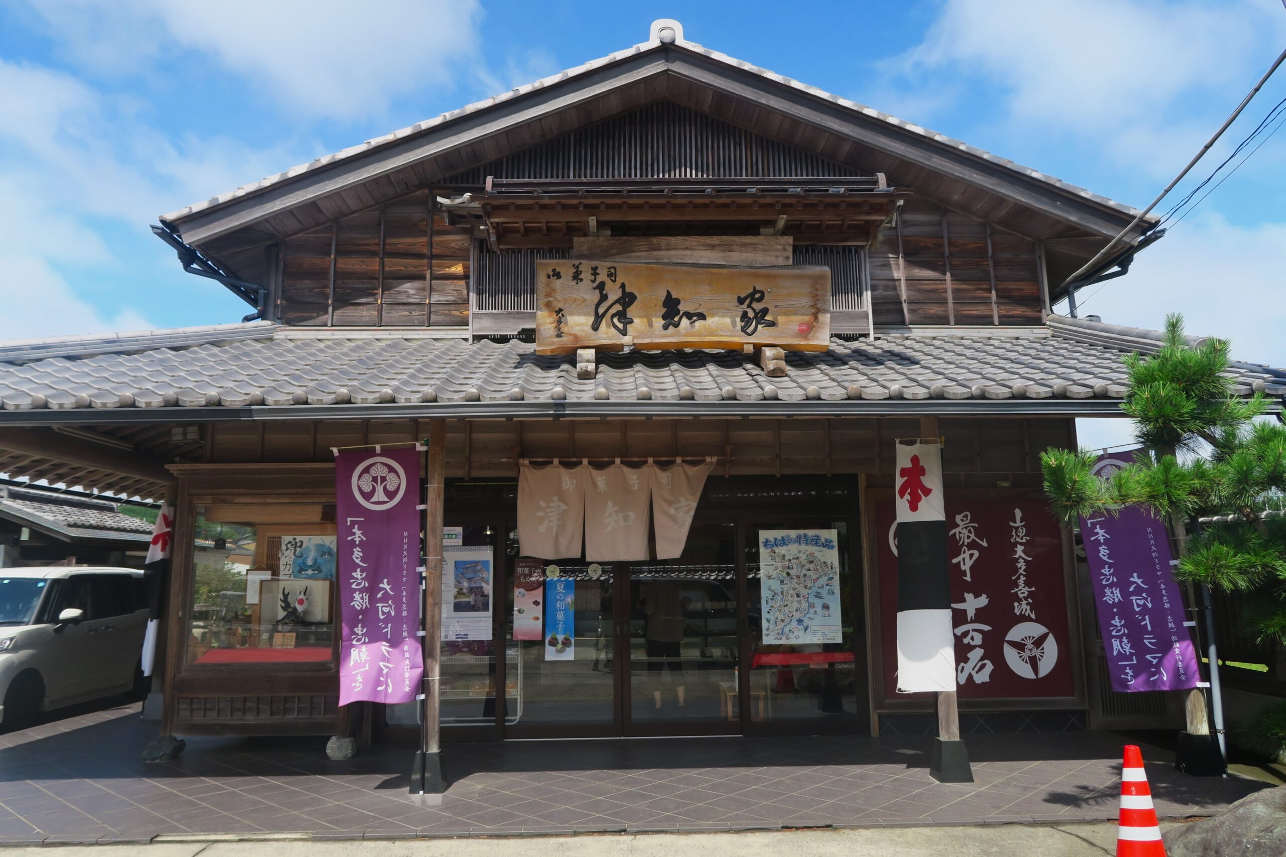 城下町通りとの交差点にあるのが大正8年(1919)創業の老舗和菓子店「御菓子司 津知家」です。昭和50年の大多喜城の開館に合わせて作られた「上総大多喜城最中十万石」が名物で、国産餅米から作った皮は二種類あり、本多家の立ち葵と最後の藩主・大河内松平家の三つ扇の家紋が描かれています(大多喜城の屋根瓦と同様)。厚さ3・5cm、北海道産の最高級小豆を使用したつぶ餡が皮からはみ出すほどたっぷり入った十万石にふさわしい最高級最中です。