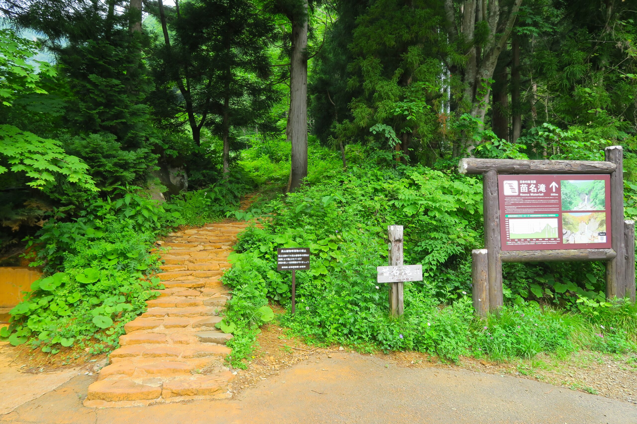 苗名滝は森林の中を歩いて癒しの効果を体験でき「森林セラピーロード」に指定された妙高高原自然歩道の出発点でもあります。白い濁り湯が特徴の燕温泉までの約16kmの道中では、妙高山麓の自然や文化を楽しめます。