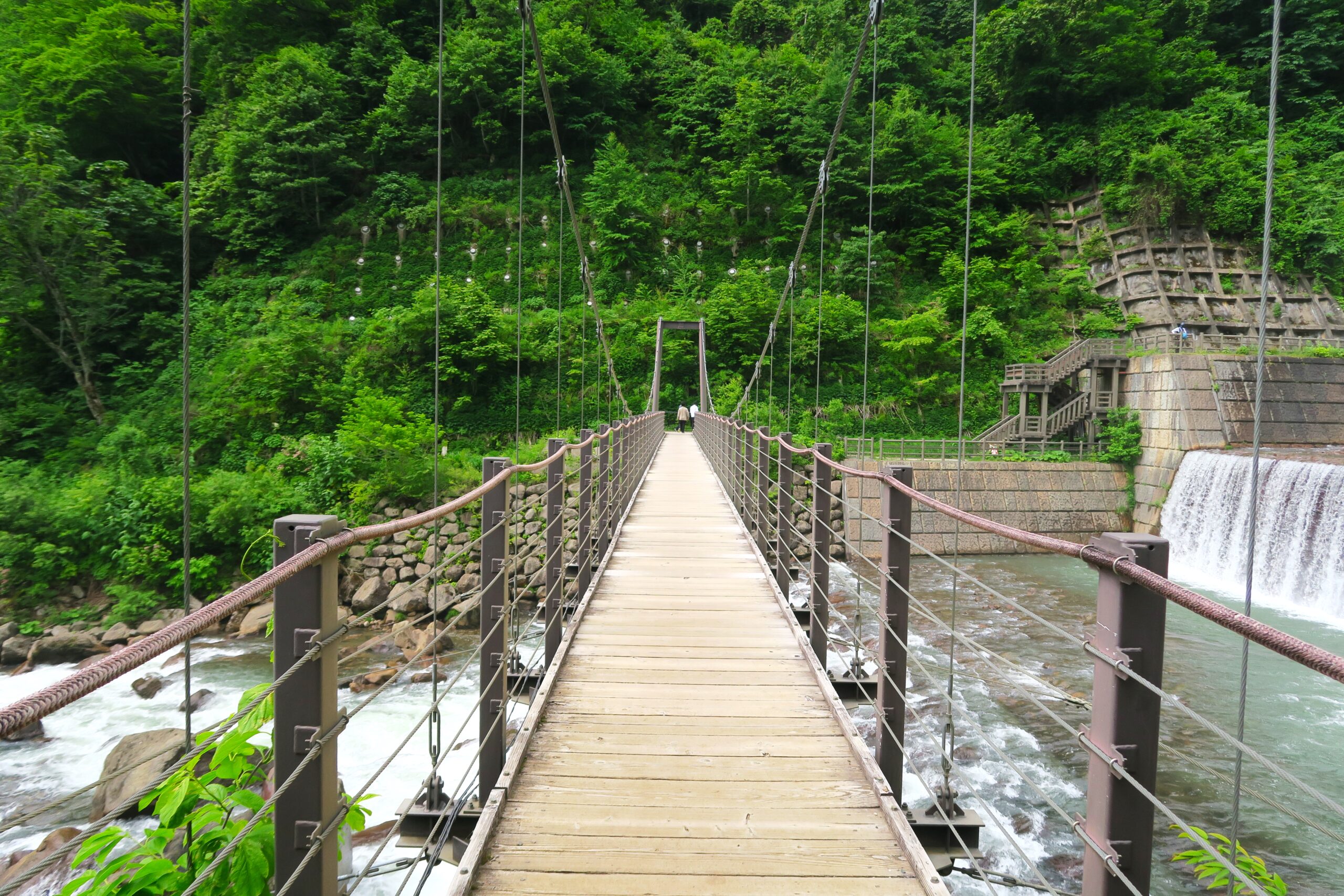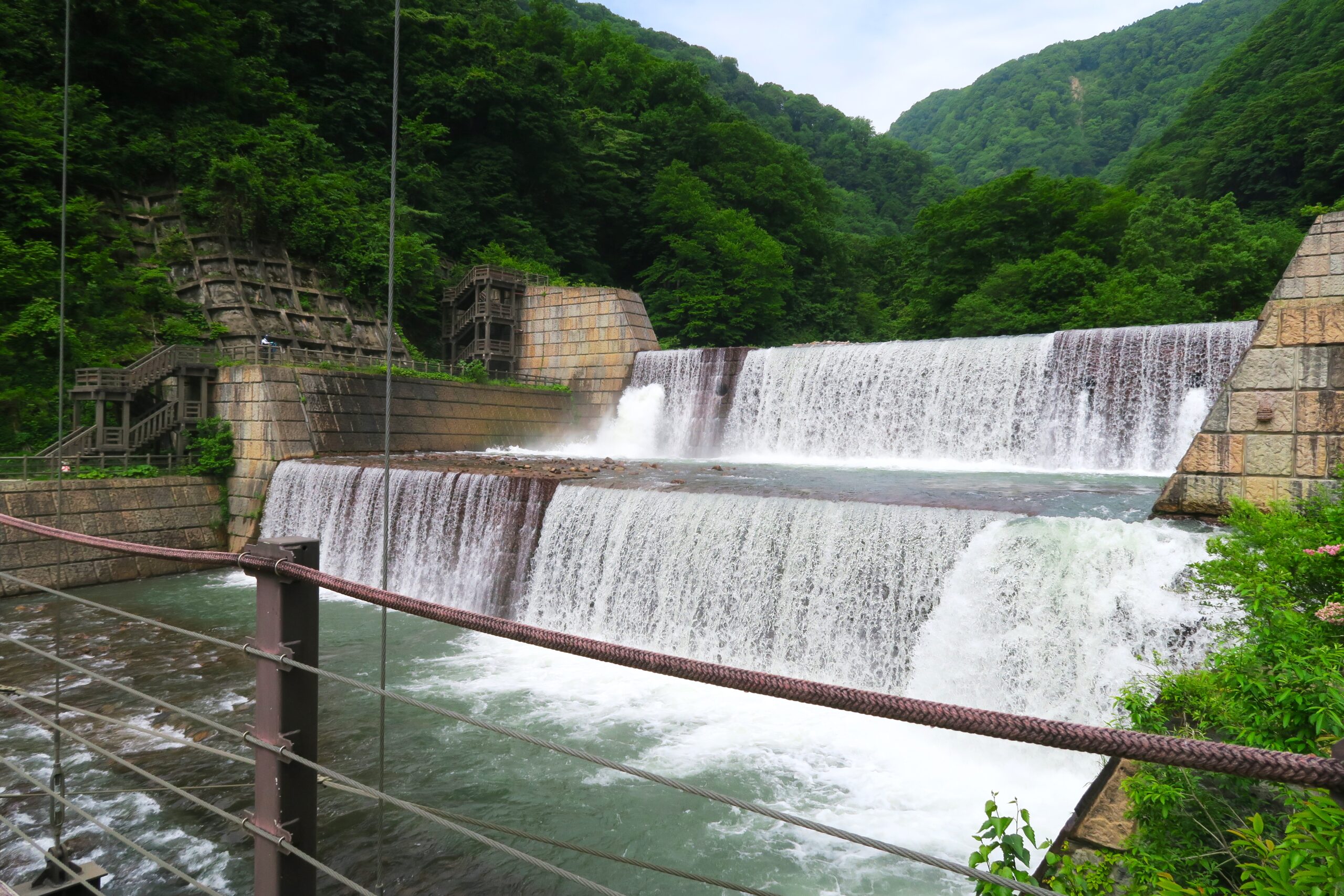 吊り橋上からは砂防堰堤を流れる関川の水しぶきが気持ちいいです。砂防堰堤を横に見ながら階段を上っていきます。遊歩道入口から苗名滝まで片道約15分の距離です。