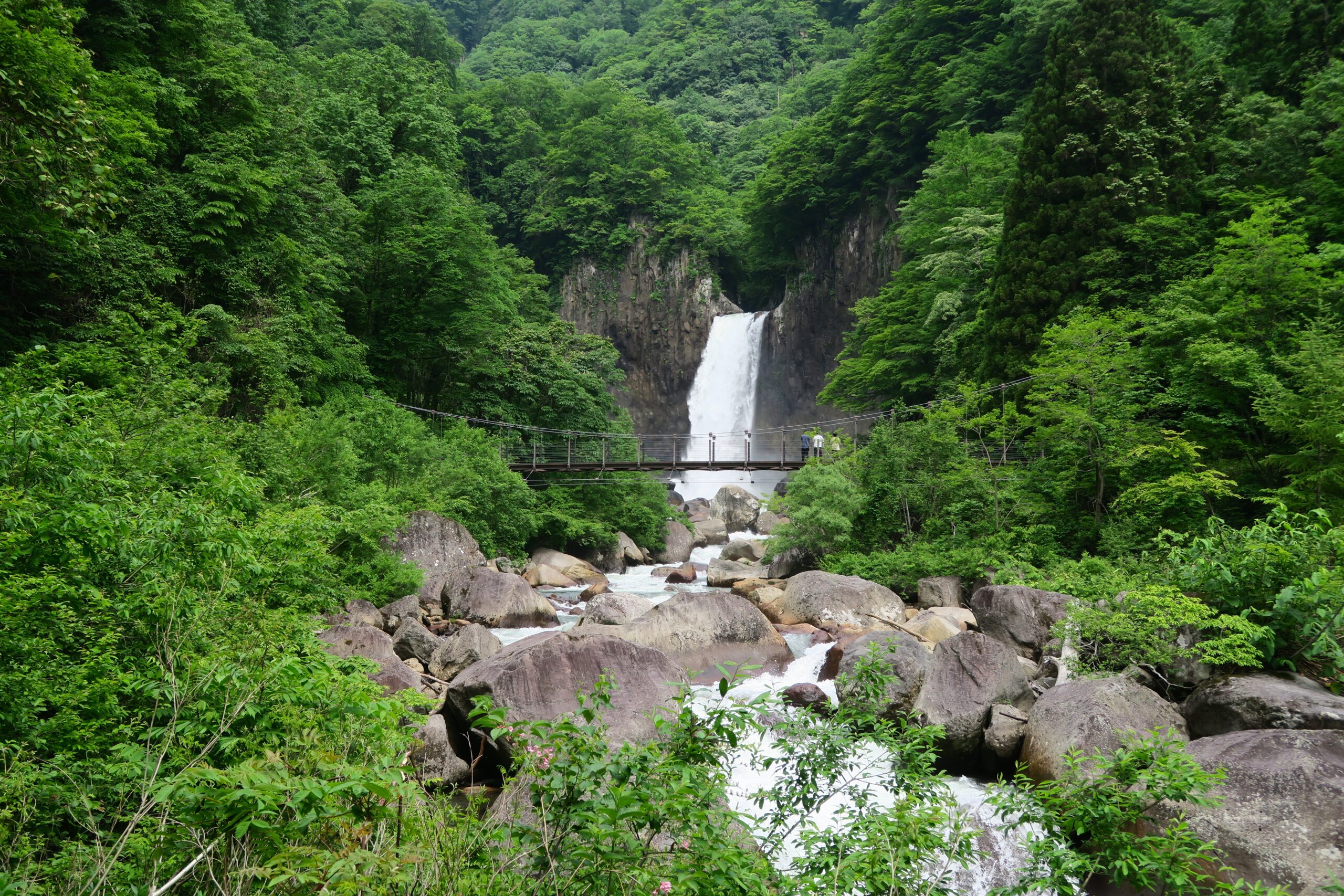 新潟県と長野県の県境となる関川にかかっている滝のため、二つの県で別々に滝を見てみると、目に映る景色が違うという面白味があります。滝の近くにある吊り橋を渡り、滝の下から眺められる新潟県側(滝に向かって右手)からは、水しぶきをあげて落ち込む迫力のある様子を間近で楽しめます。大きな岩伝いに川の中央まで行くことができますが、足元には十分注意が必要ですよ。