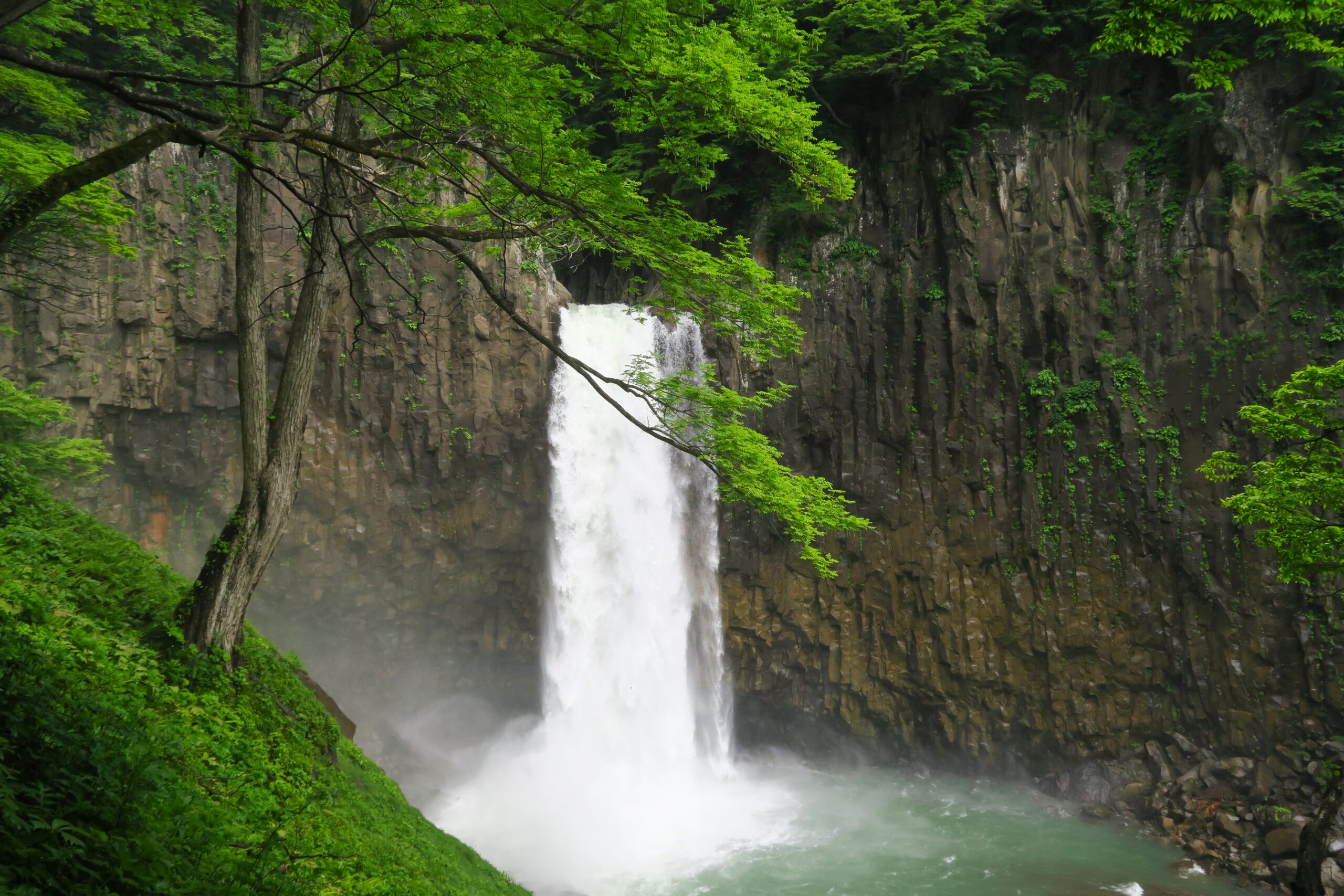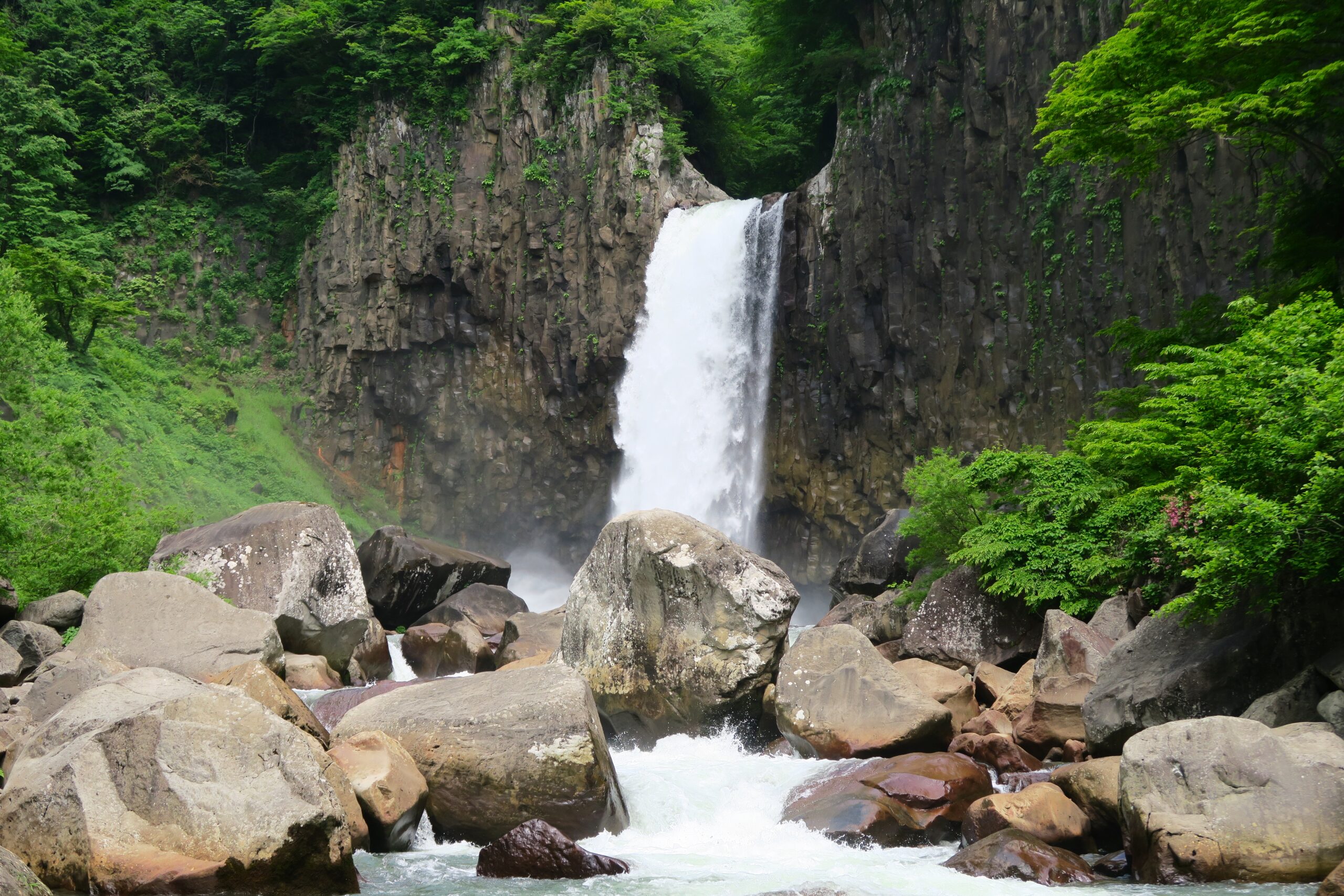 「苗名滝」は、関川にかかる落差55mの滝です。年間を通じて水量が多く、柱状節理がよく発達し、玄武岩の断崖から轟音と水しぶきをあげて落ち込む様は迫力満点で、体全体で感じられます。苗名滝は地震滝とも呼ばれていて、滝から落ちる水音が四方に渡って地響きのように聞こえるのが名前の由来とか。その後、「なゑ」が古語で地震を意味していることや、周辺の高田平野が稲作の盛んな地であったため、現在の苗名滝という名前に変わったともいいます。