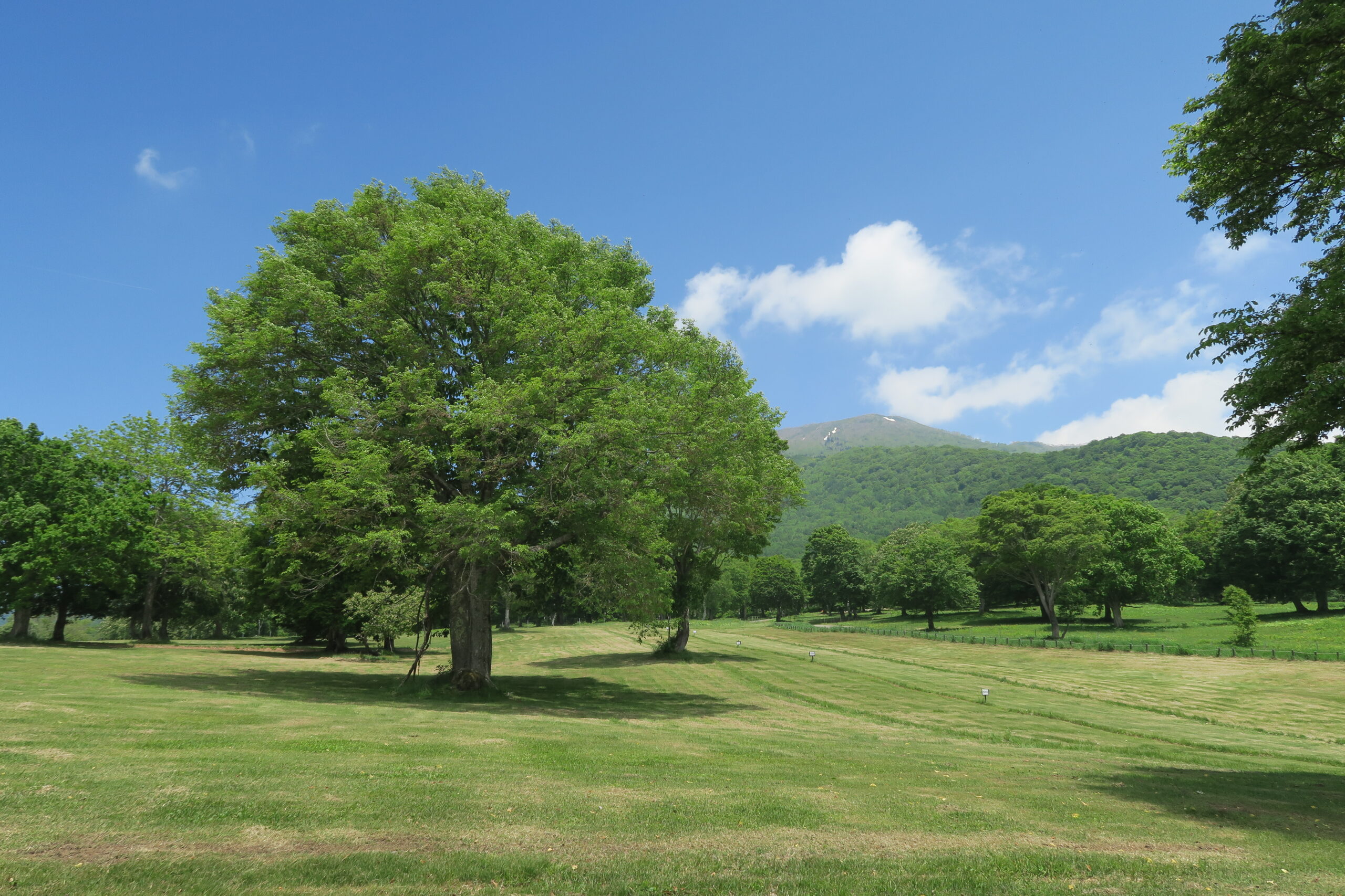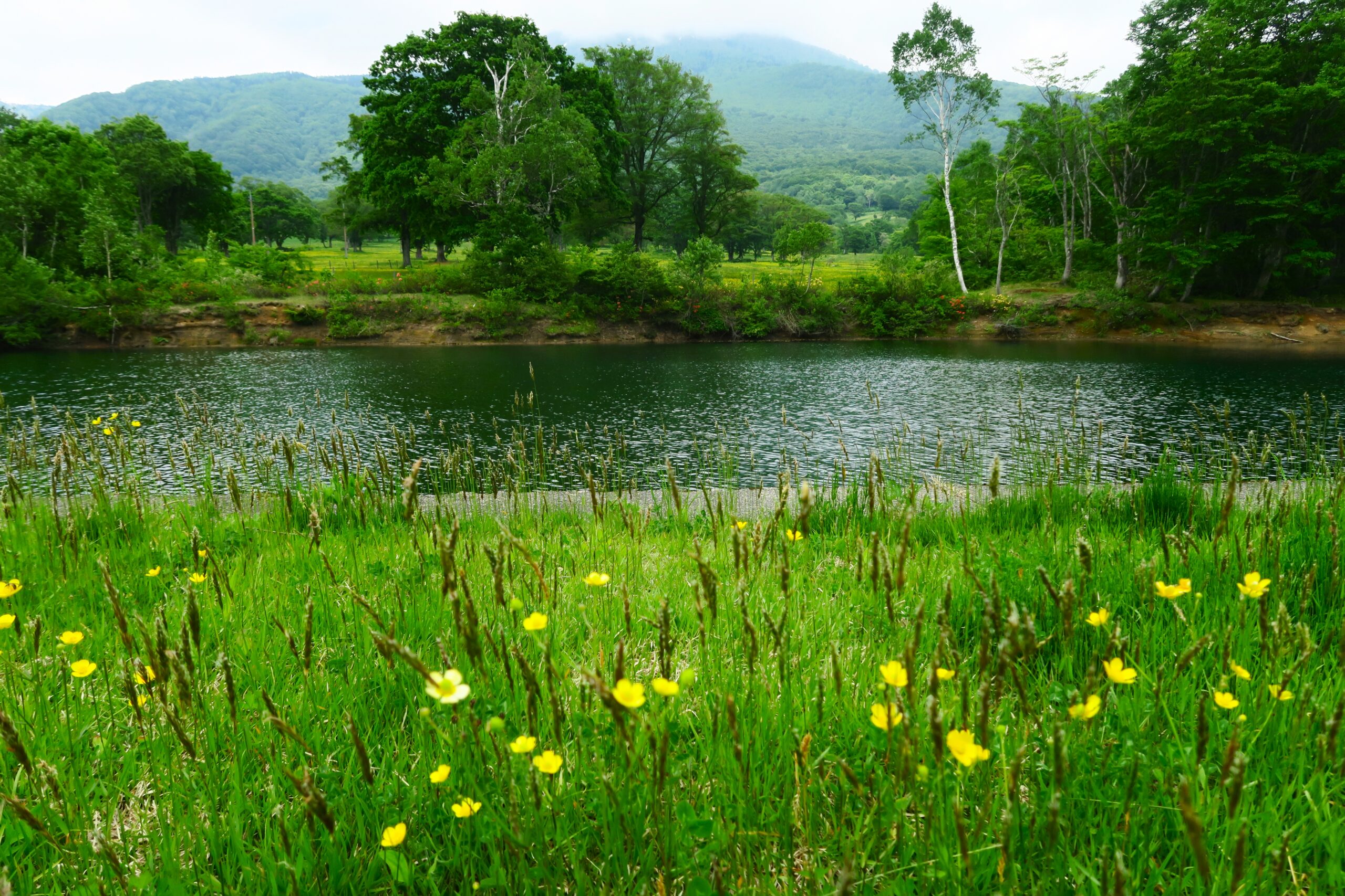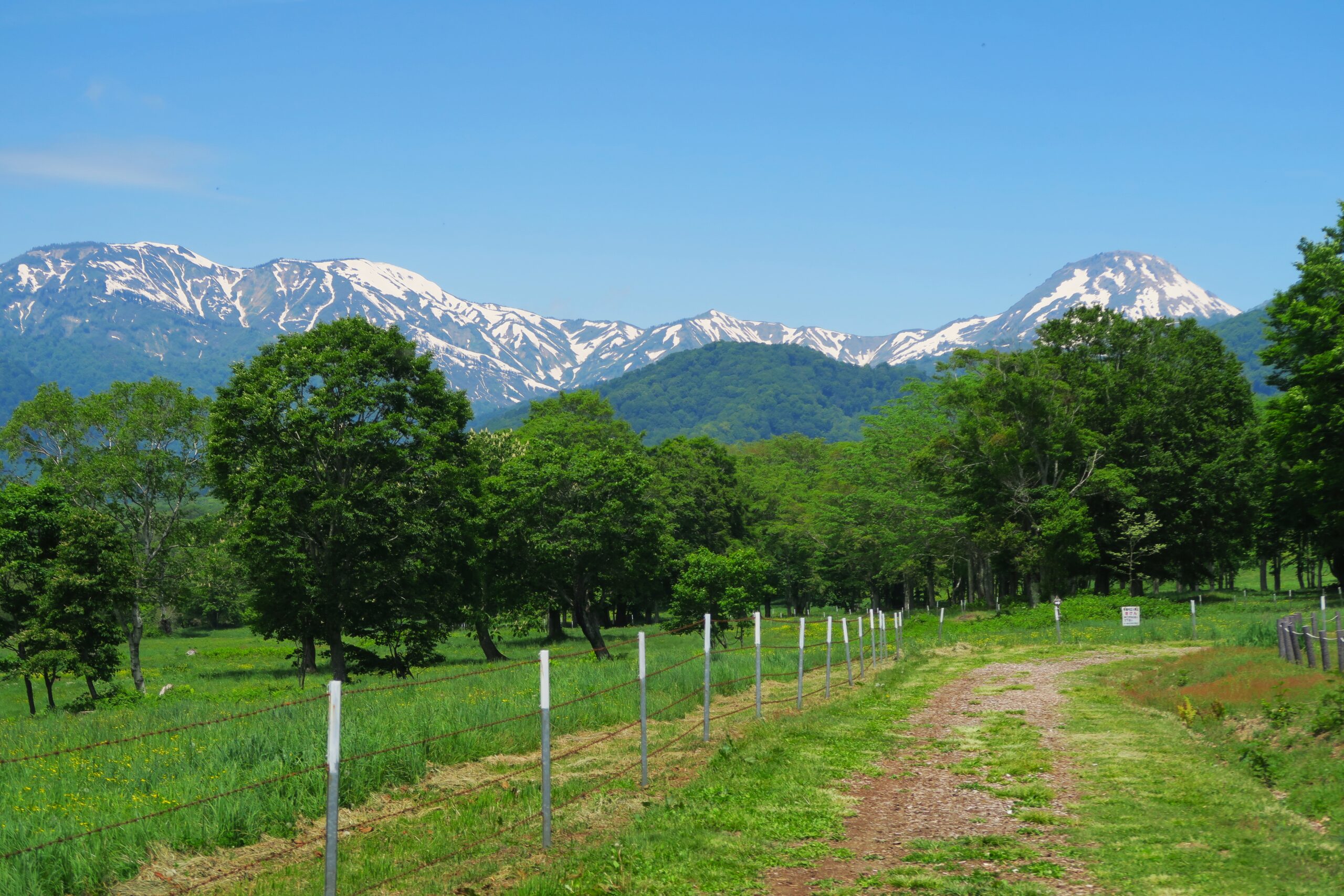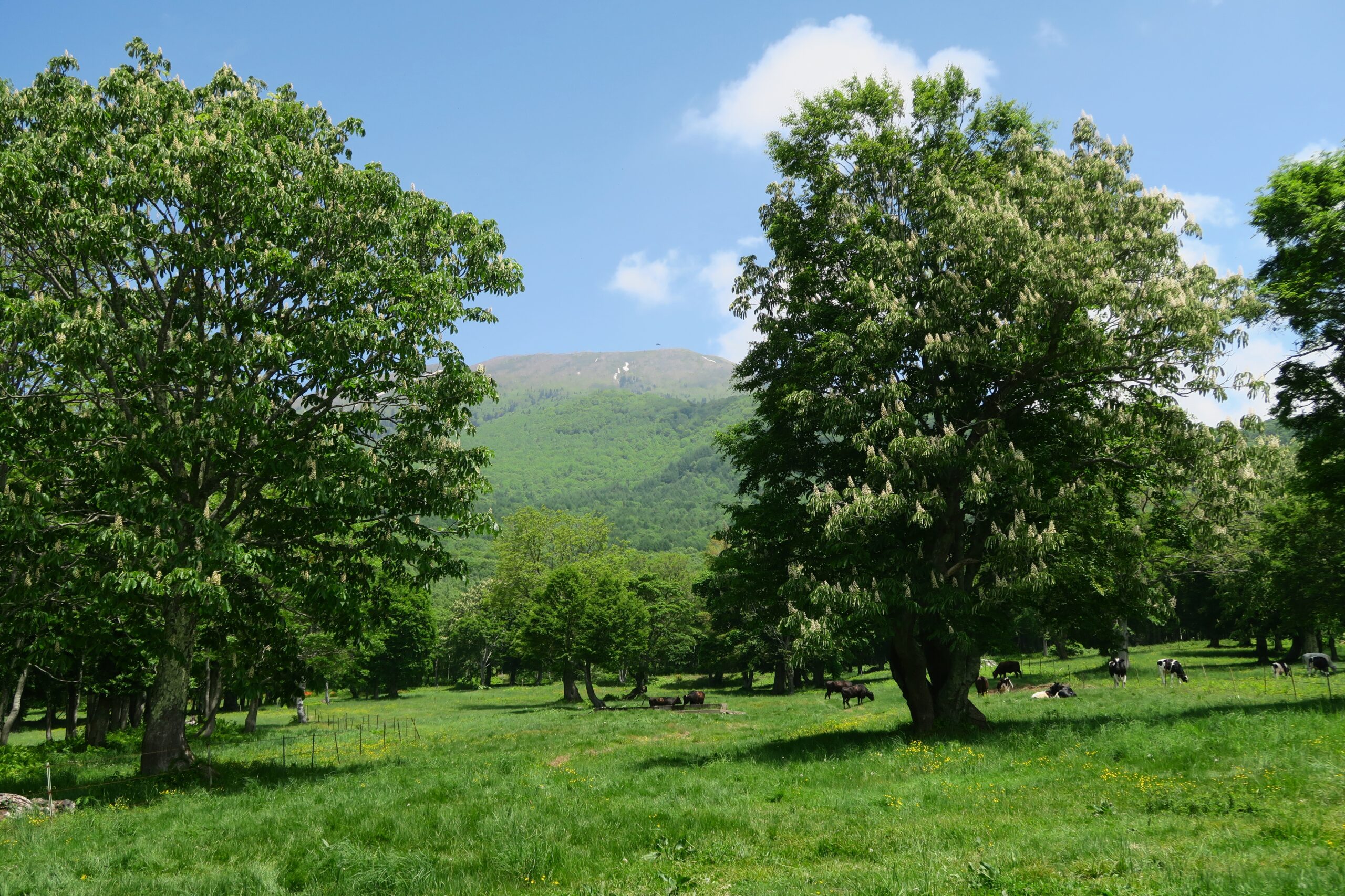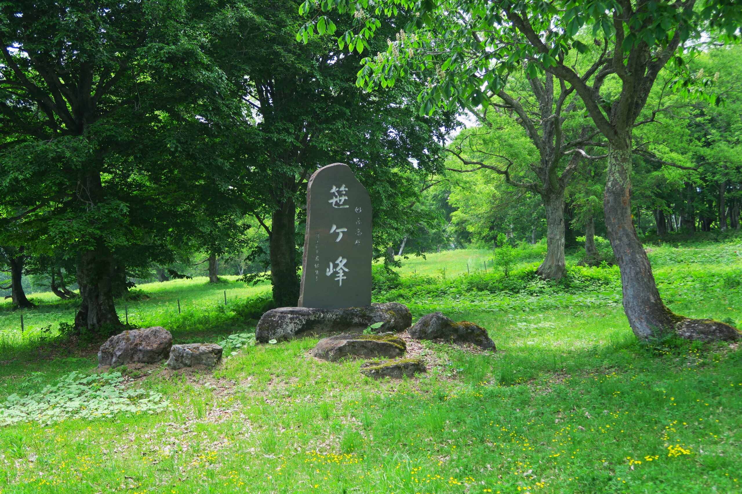 笹ヶ峰高原には日本百名山「火打山」をバックに、笹ヶ峰牧場を中心として広大な草原、巨大なハルニレの木が点在し、ヨーロッパ的な雰囲気を思わせる景観が広がります。牧場一帯には季節ごとに花々が咲き彩を添えてくれ、その中でゆっくり草を食む牛に思わず「オハヨー」と声をかけたくなります。この時期はキンポウゲの黄色い可憐な花が咲き誇っています。