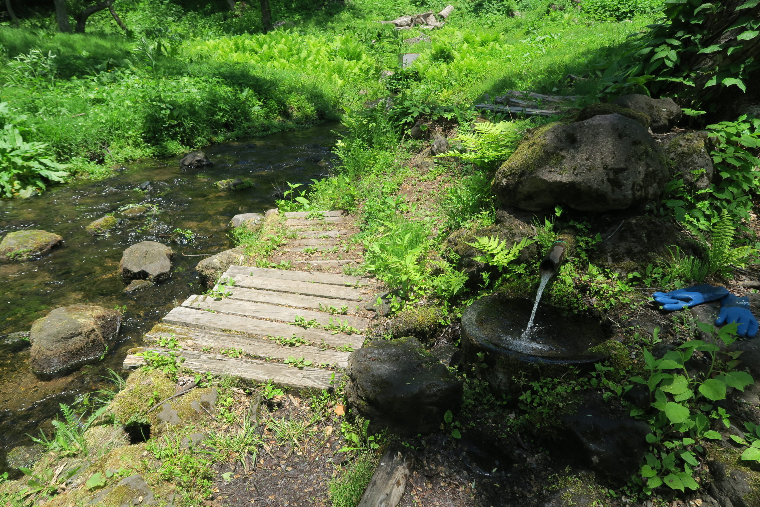 途中、高原の名水として知られ、平成の名水百選にも認定された「宇棚の清水」に出会えます。ここでは一日あたり4000トンもの水が湧き、周辺から湧き出た水が瞬く間に集まり小川となっていく様子を見ることがでます。宇棚というのは、傾斜の急なところから緩やかになる場所のことで、四季を通じて水量豊富な水辺には、桟橋や水汲み場も設置されています。飲用することができ、少し硬めの冷たい水が喉を潤してくれます。きれいな水場にしか生育しない野生のクレソンの姿も見ることもできますよ。