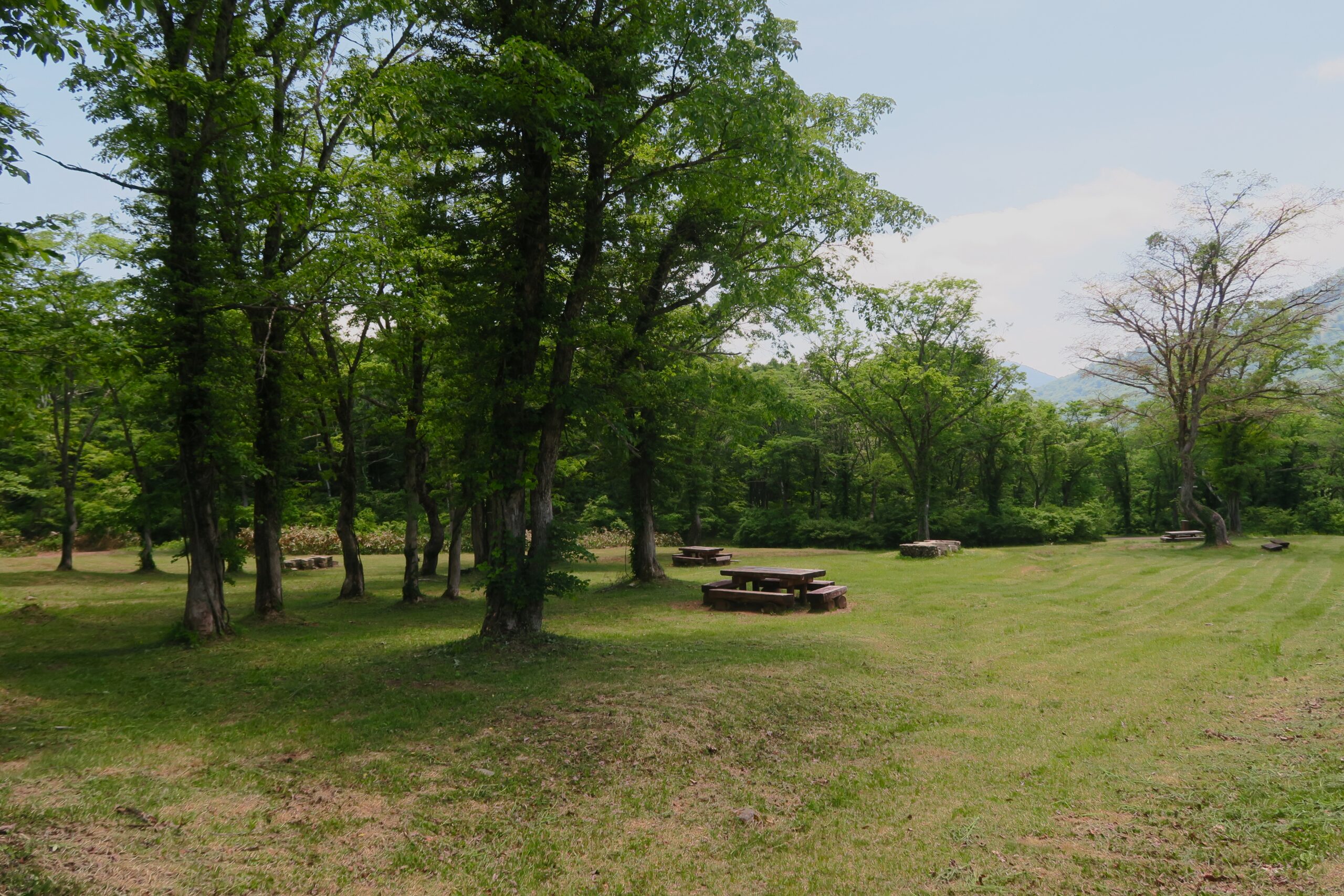 火打山登山口近くにあるのが「笹ヶ峰キャンプ場」です。広さは国内最大級のキャンプ場でサイト内には子供も安心して遊べるトクサ川が流れ、水遊びや生き物観察ができます。木々の木陰には木製のテーブル席が設置されているので、トレッキングの合間の昼食や休憩には最適の場所です。昼食をここでとり次に乙見湖を目指します。