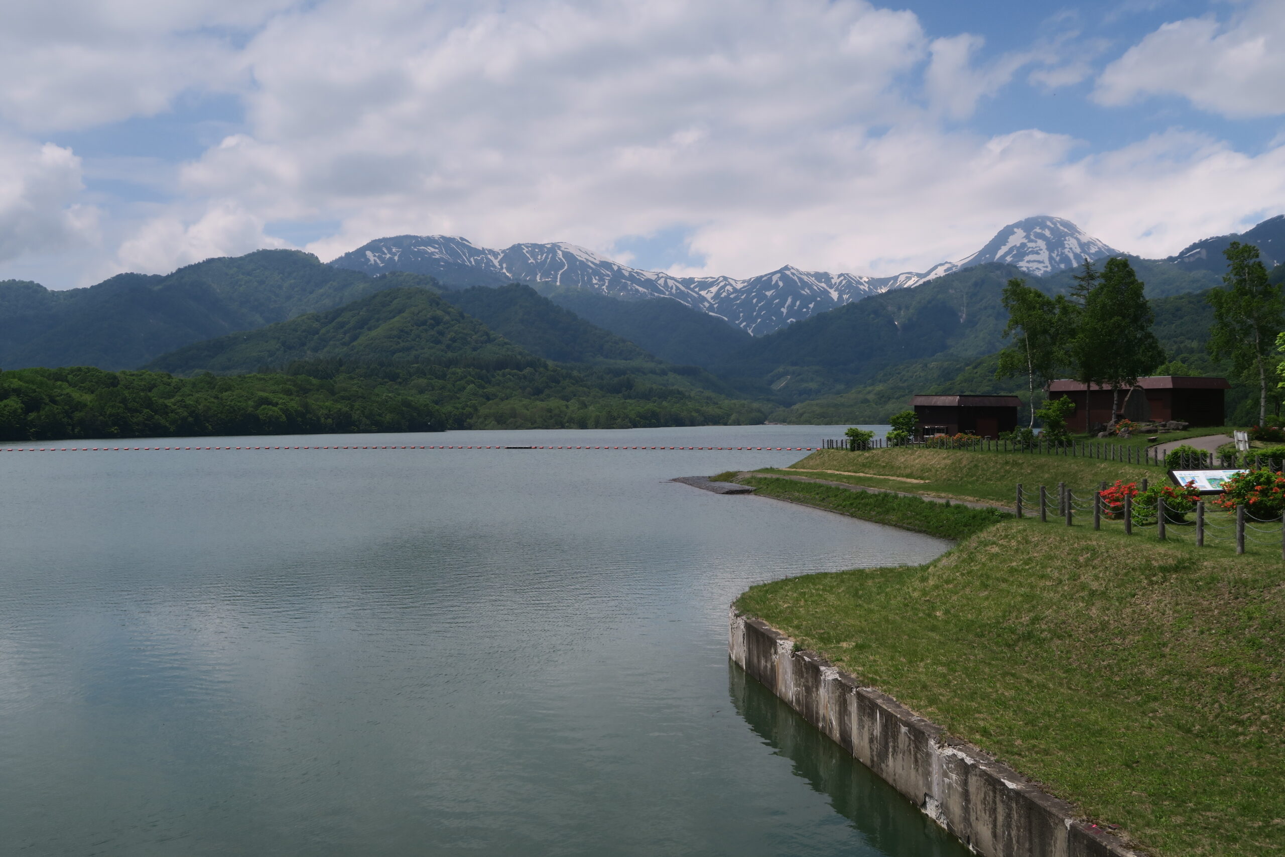 「笹ヶ峰ダム」は、高さ48.6m、長さ318mのロックヒル式ダムで関川の上流、真川とニグロ川の合流点を堰き止めて造られました。農業用水を目的に作られた東北電力管轄のダムで、そのダム湖の名前が乙見湖です。湖の向こうに焼山や火打山などの山々が見渡せ、湖からのそよ風が気持ちいいです。管理事務所ではダムカードも配布されています。(※現在、カード配布は中止)堤頂は歩道になっていて、別の森林セラピーロード「夢見平遊歩道」へと続いています。