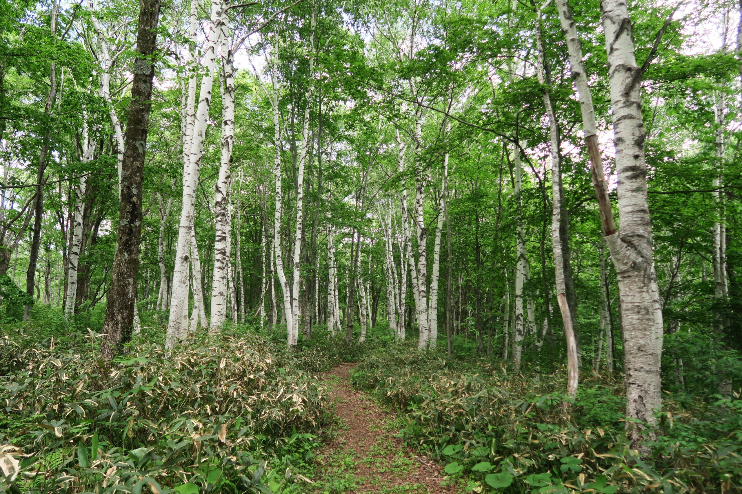 出発地点である笹ヶ峰グリーンハウス近くの駐車場に車を止めて出発します。JR妙高高原駅からは季節運行ですが直行バスも出ています。コースは約5kmの距離ですが高低差もなく、ブナやシラカバさらに高いところではダケカンバの樹林帯の中に整備された遊歩道を歩きます。