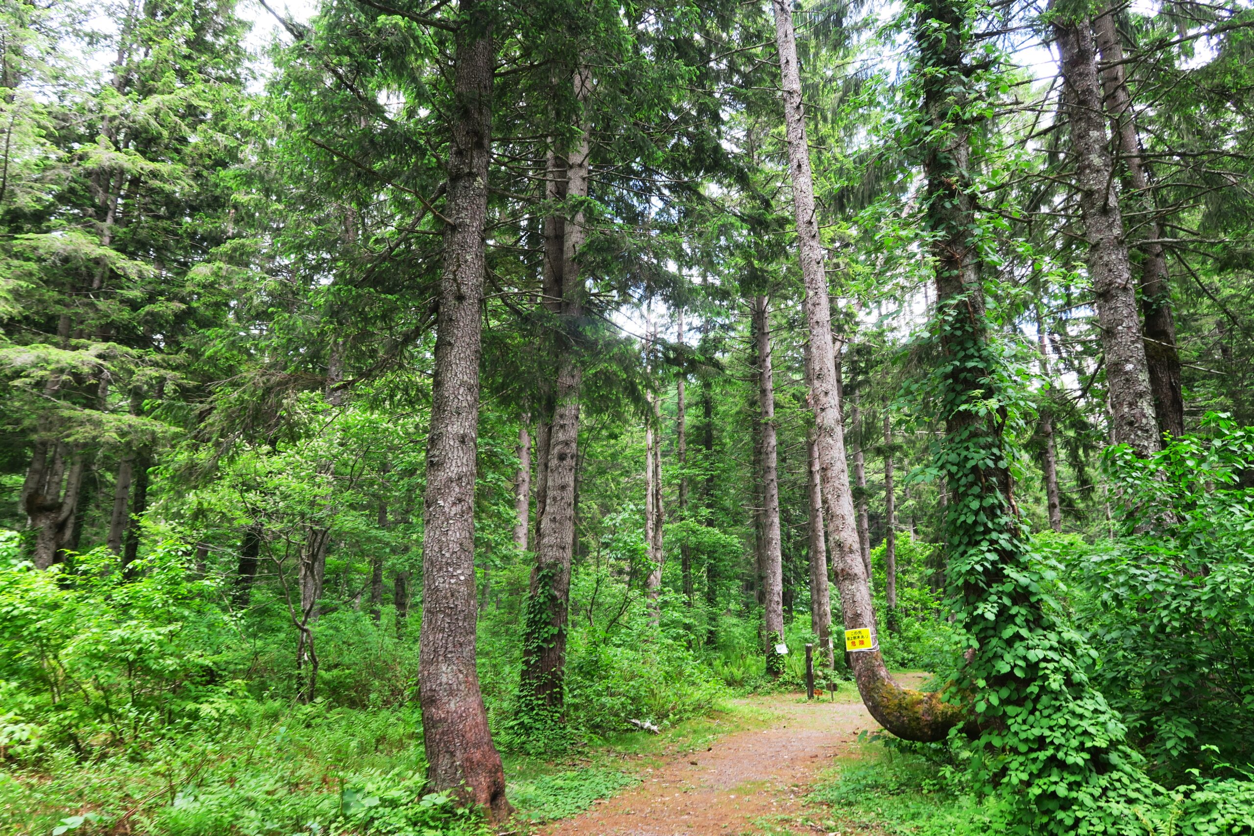 ここからゴールの「笹ヶ峰グリーンハウス」までドイツトウヒ林の中を歩いていきます。日本最大のドイツトウヒ林は、平均樹高約20mのドイツトウヒ約1万本が54haにわたり生い茂り、まるでヨーロッパの森を歩いているかのような気分になれます。クリスマスツリーとして利用されることの多いドイツトウヒの木々が作る林の中は、森林セラピー効果満点です。