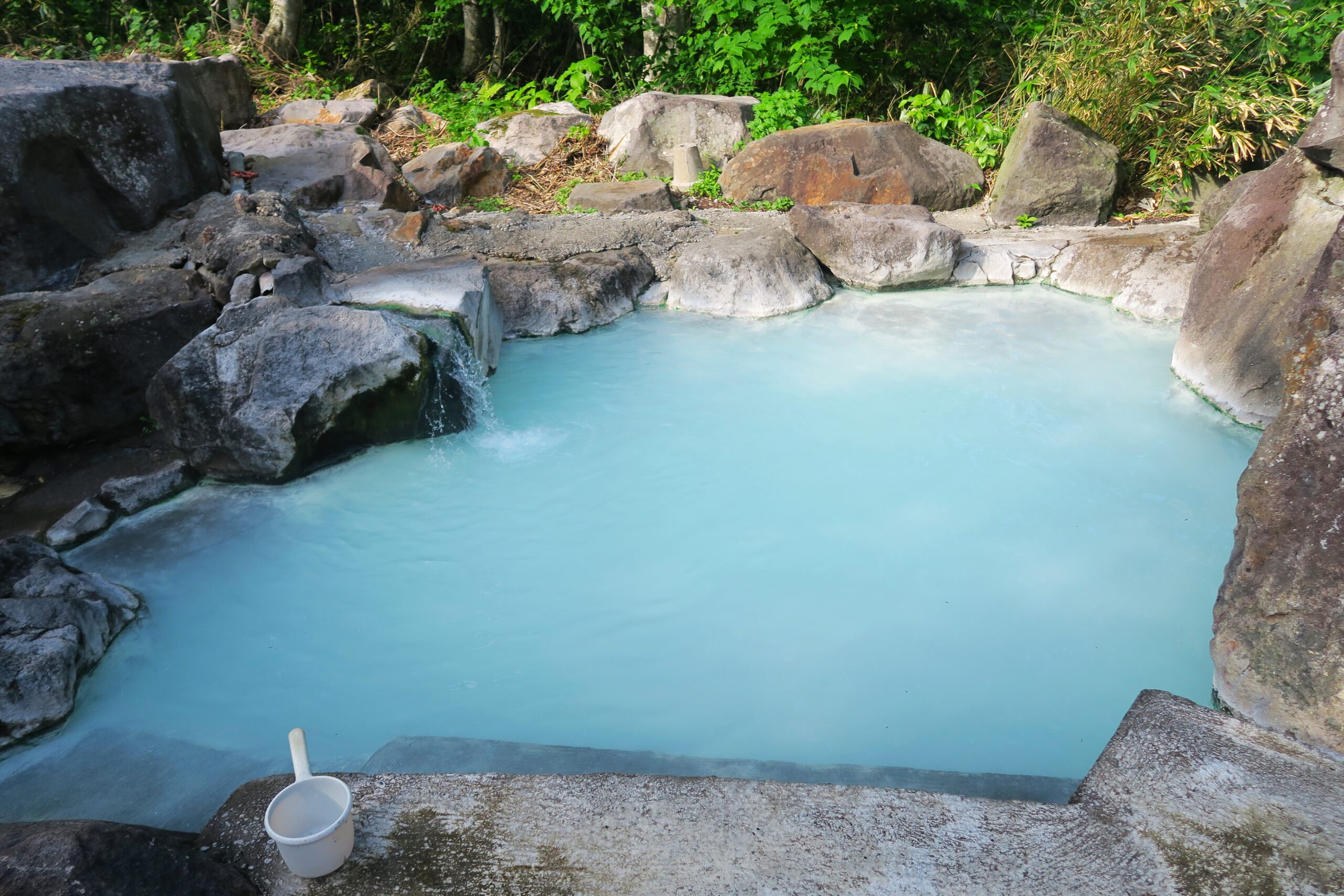 男女別の脱衣小屋と岩組みの露天風呂があり、解放感抜群です。泉質は含硫黄ーナトリウム・カルシウムー炭酸水素塩・硫黄塩・塩化物泉で白い湯の花がたくさん舞っています。