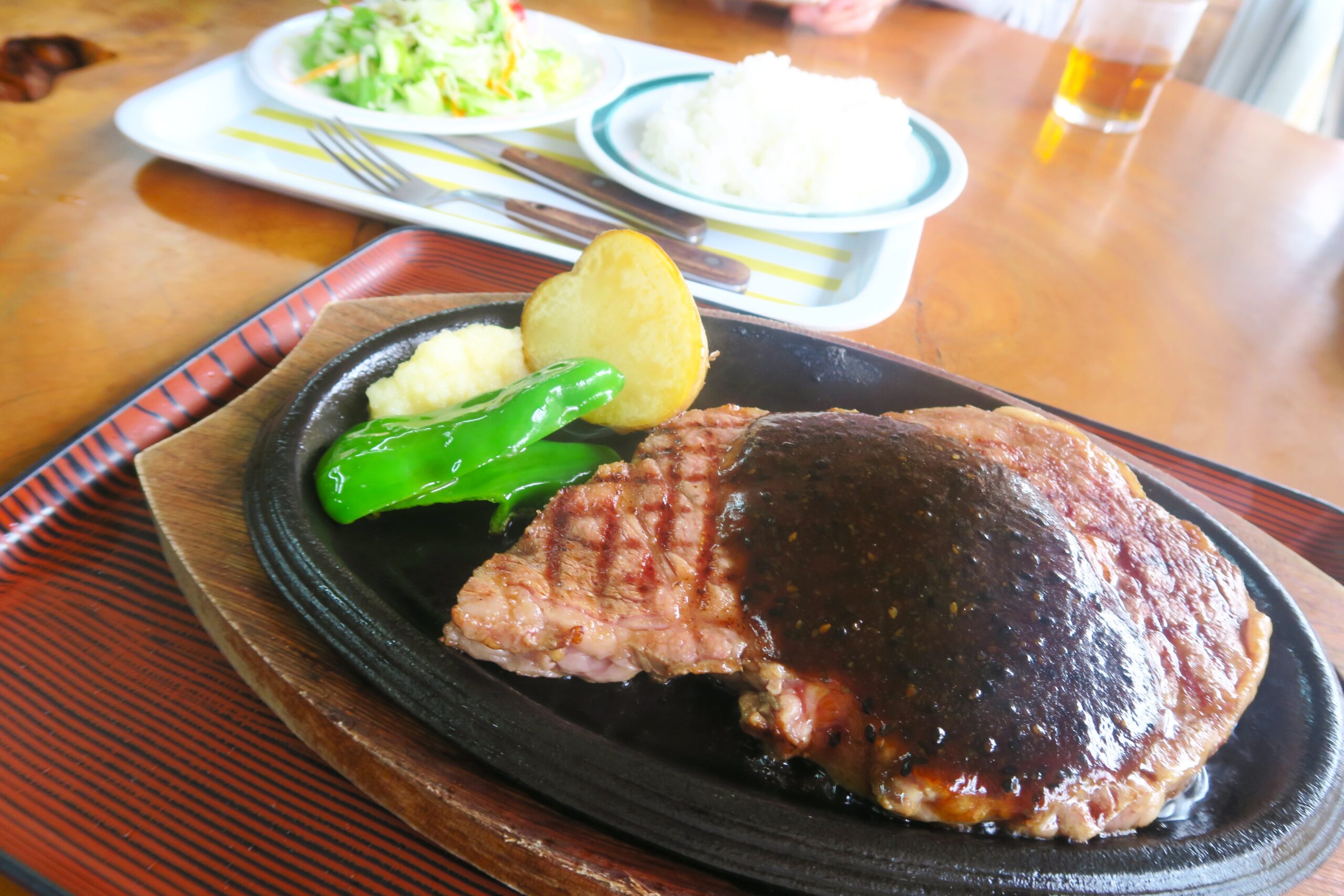 2階のレストランでいただける新潟県産牛のステーキはここの名物です。わらじのように大きいステーキセット200g4990円。熱々の鉄板に少し甘めの昔ながらのソースがかかったステーキは柔らかくジューシー。ソースの焦げた香りが食欲をそそります。