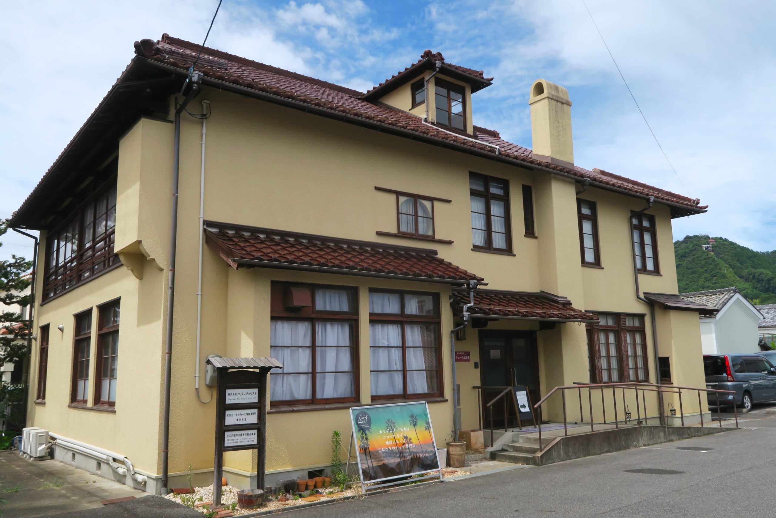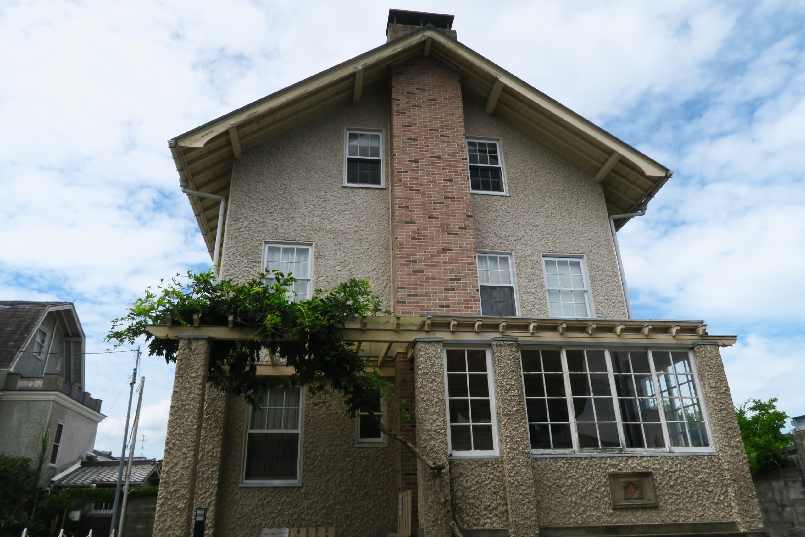 手前のもう一棟、ウォーターハウス記念館も大正2年(1913)に建てられたヴォーリズ最初期の建物。広い窓や青いドア、明るい壁色のデザインからはアメリカンな雰囲気が漂います。