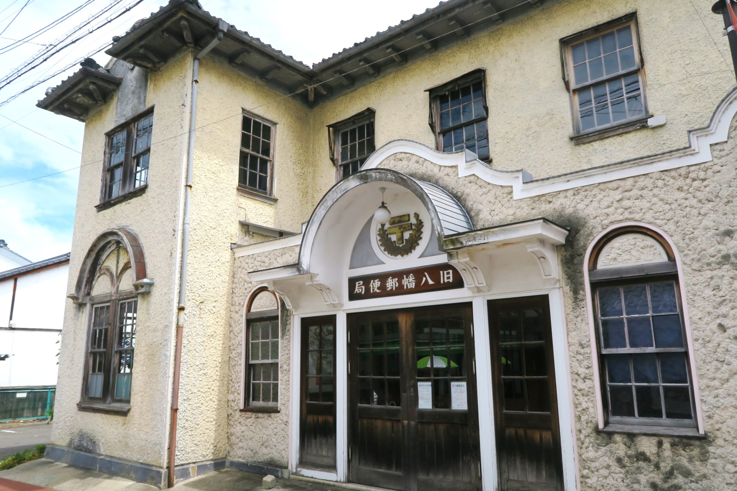 旧八幡郵便局も大正期の初期ヴォーリズ建築です。近江八幡に郵便局が開設されたのは明治27年(1894)のこと。古い建物を活かしながら、前半部を改築して大正10年(1921)に建てられました。玄関ポーチの上には半円形のアーチの入口屋根と両脇の窓のアーチ型の飾りが愛らしい。ガラス窓はいずれも大きくとられ、純洋館と思うと、屋根には和瓦が載っていて、外観は和様折衷の妙。かつて1階は郵便局業務、2階が電話交換室として使用されていました。館内は暗いと思いきや明かりとりの窓や天窓がふんだんにあり明るい部屋を作りだすヴォーリズの設計です。2階にはヴォーリズに関する資料や満喜子夫人との仲睦まじい写真などが展示されています。八幡山方向に歩けばバス停「八幡堀八幡山ロープウェー口」まで徒歩2分です。