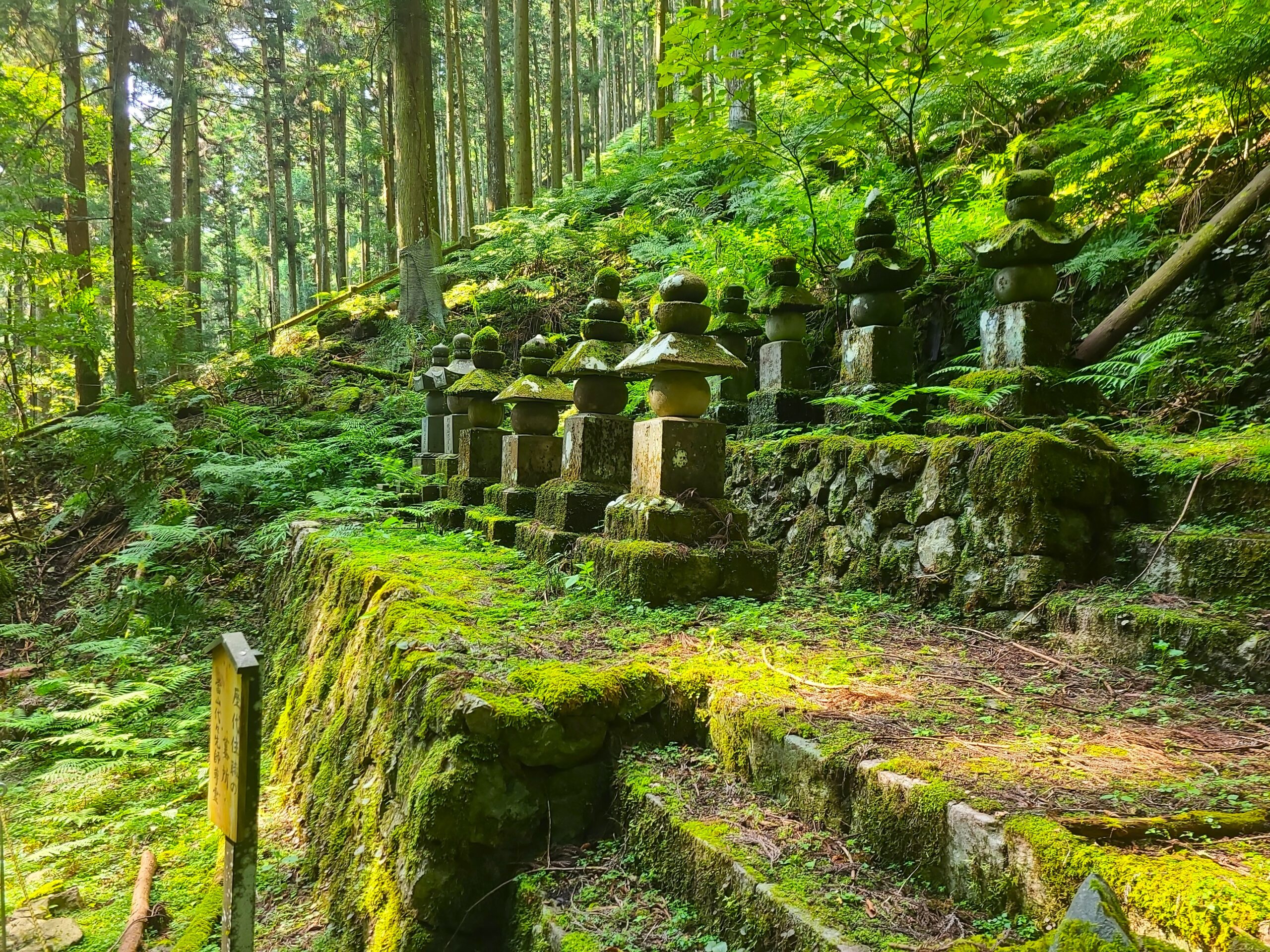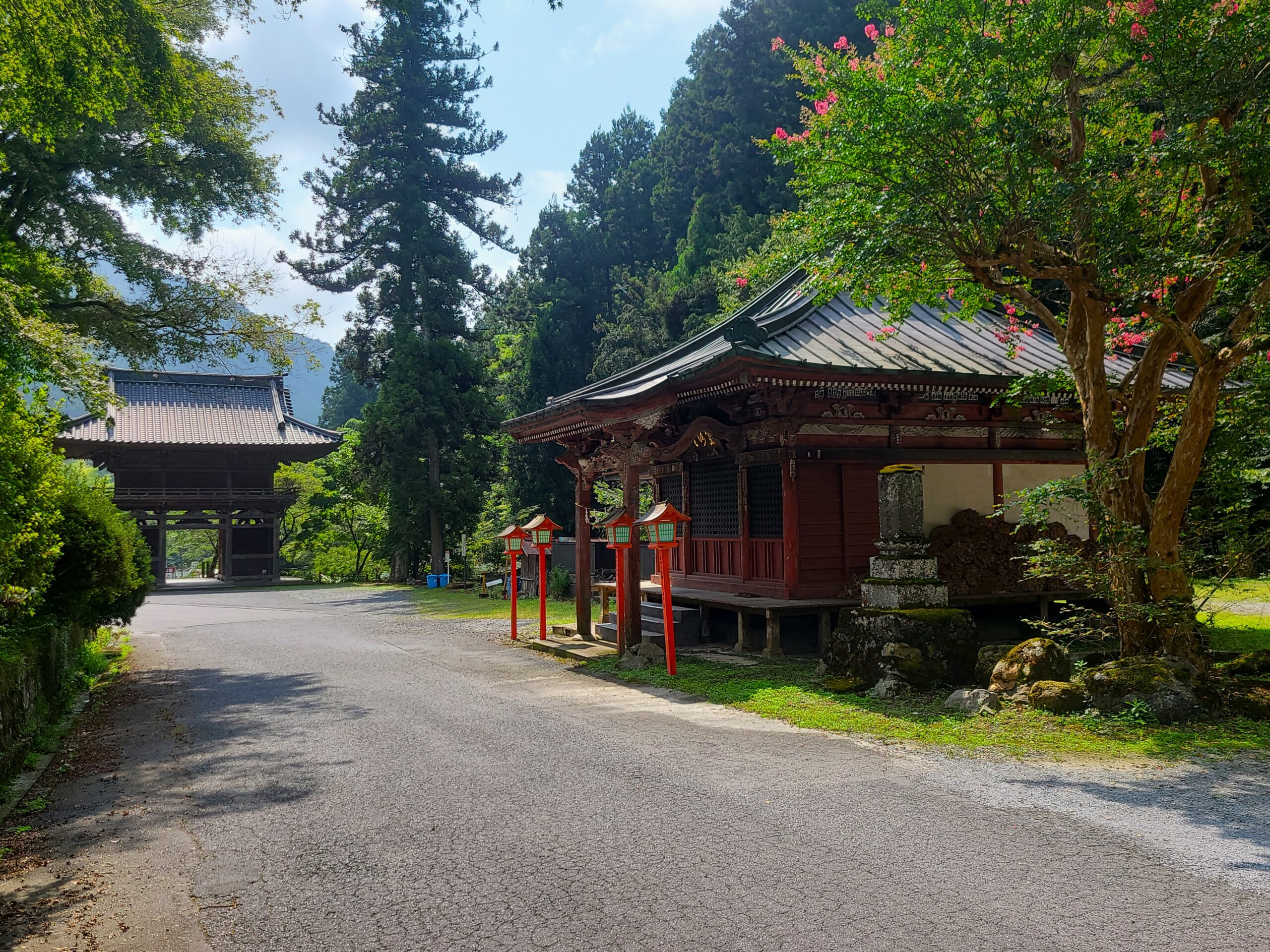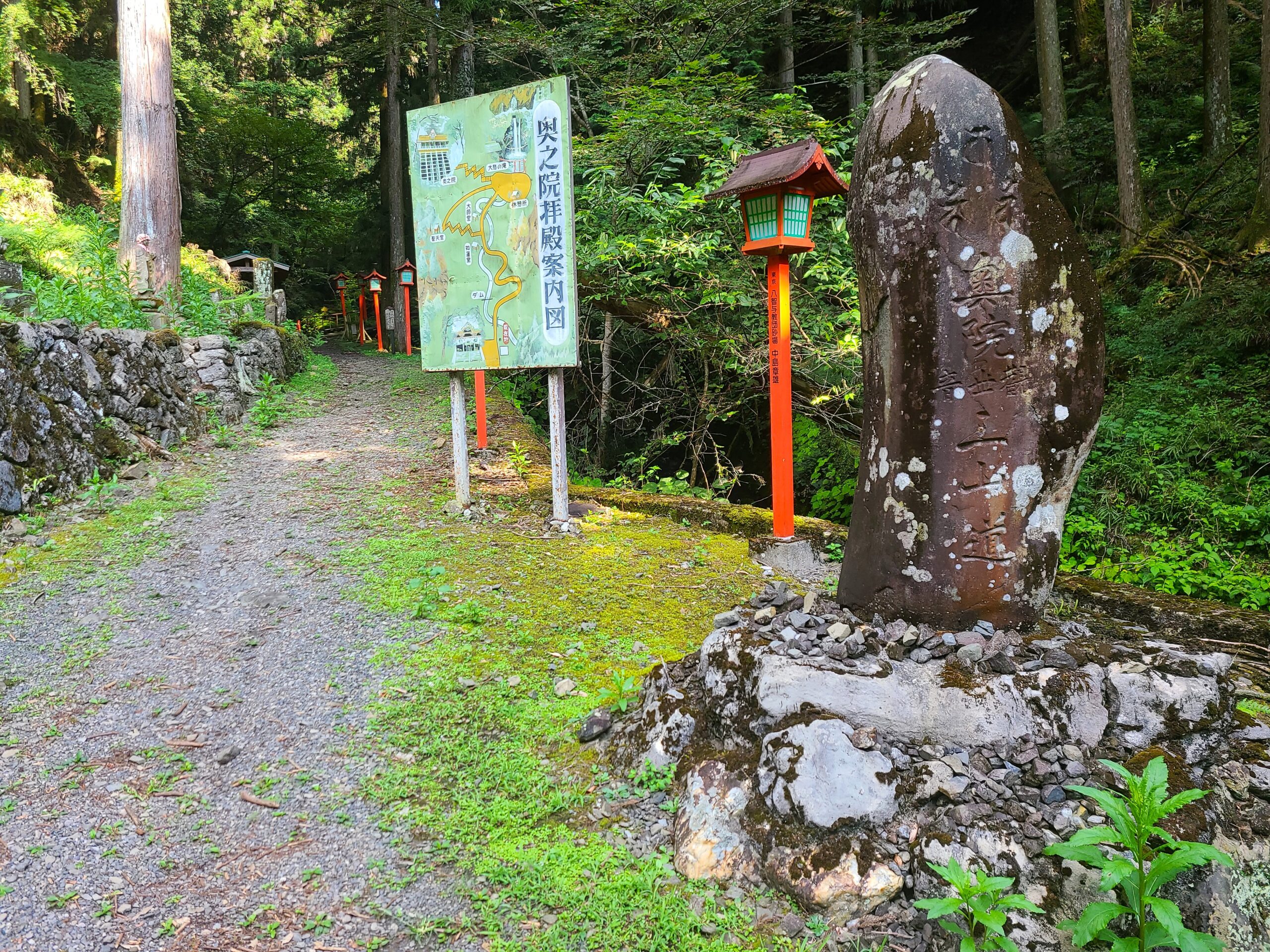 本堂から1kmほどの山道を歩いた先に奥之院があります。写真は御沢の清流に沿って続く奥之院への入口です。
