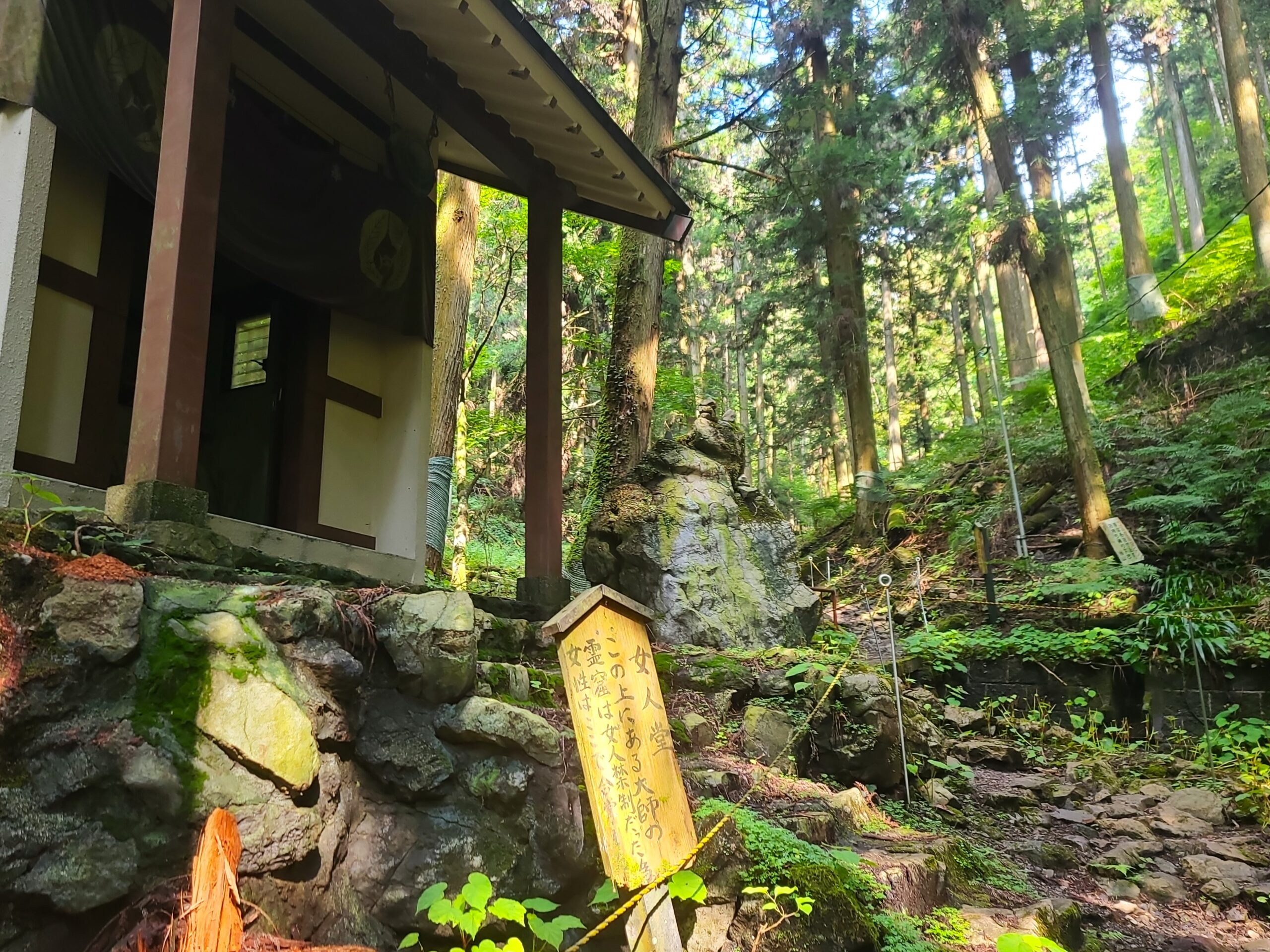 途中には、如漣堂や聖天堂、女人堂があり往時の隆盛を物語っています。明治の頃、日本鉄道・日光線(現JR東日本・日光線)開通後に衰退した満願寺を、成田山のお不動さまのお告げでやってきた松丸女漣尼という人が出流山の霊験あらたかなことを伝えたことが大きく、復興に尽力したとのこと。弘法大師をご本尊とする女人堂は、奥之院の参道沿い「大師の霊窟」の真下にあります。昔はここから「大師の霊廟」に入れない女性の信者は、ここで同行の男性信者の帰りを待っていたそうです。「大師の霊窟」は弘法大師が当山を訪れた際に禅定したとされる霊窟です。
