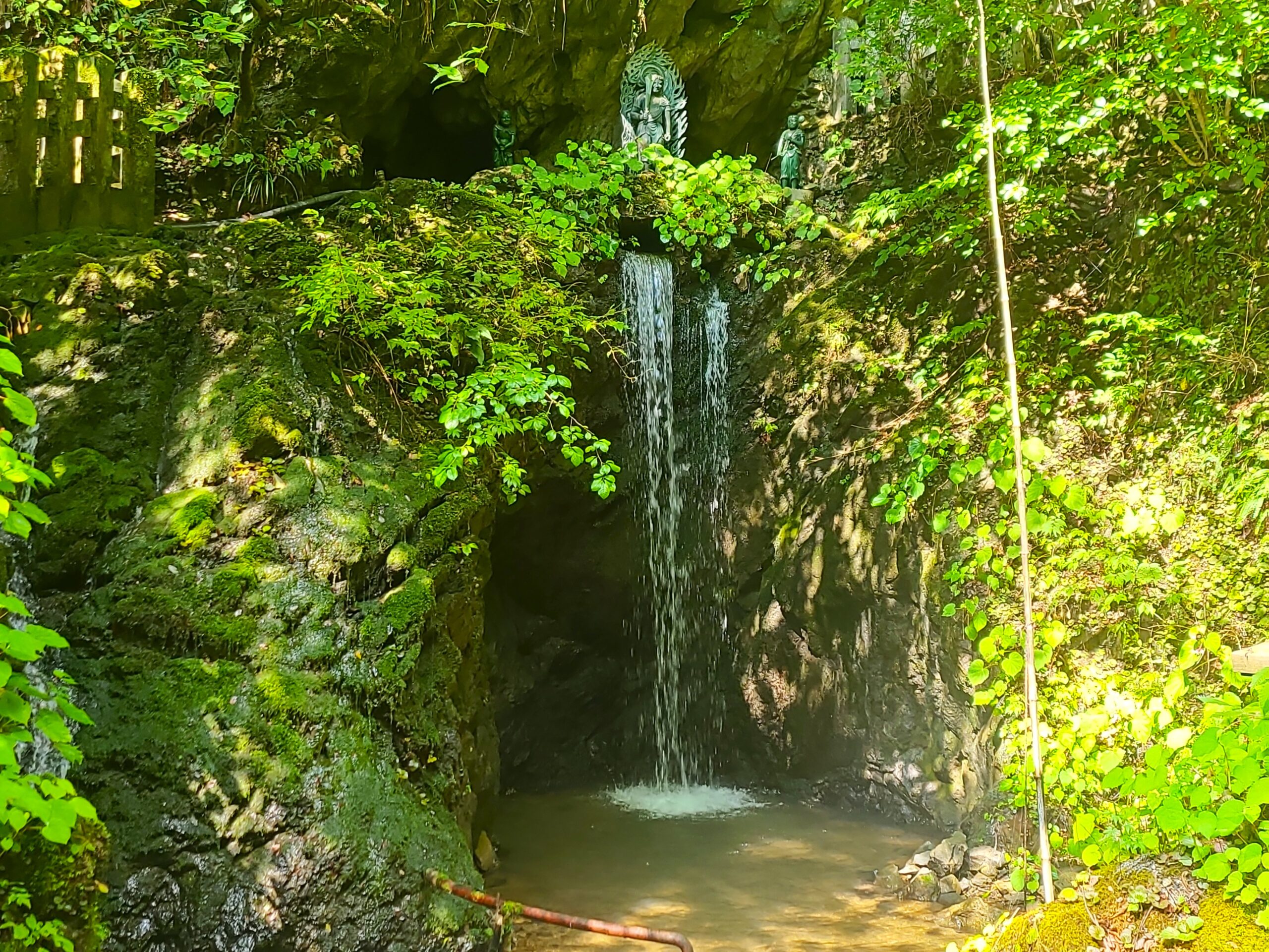参拝道の行き止まりには、出流川の源泉である「胎内くぐり」の鍾乳洞の湧き水が直接流れ落ちる落差8mの大悲の滝があります。滝行が行われる場所で岩場の上から不動明王などの3体の仏像が見守っています。ここで滝行をすれば、観世音菩薩の大慈悲に浴するということから「大悲の滝」と呼ばれています。大悲の滝から荒れた参道をさらに上がると「大日の霊窟」があり、釈迦如来、勢至菩薩等に見立てた鍾乳石があるそうです。