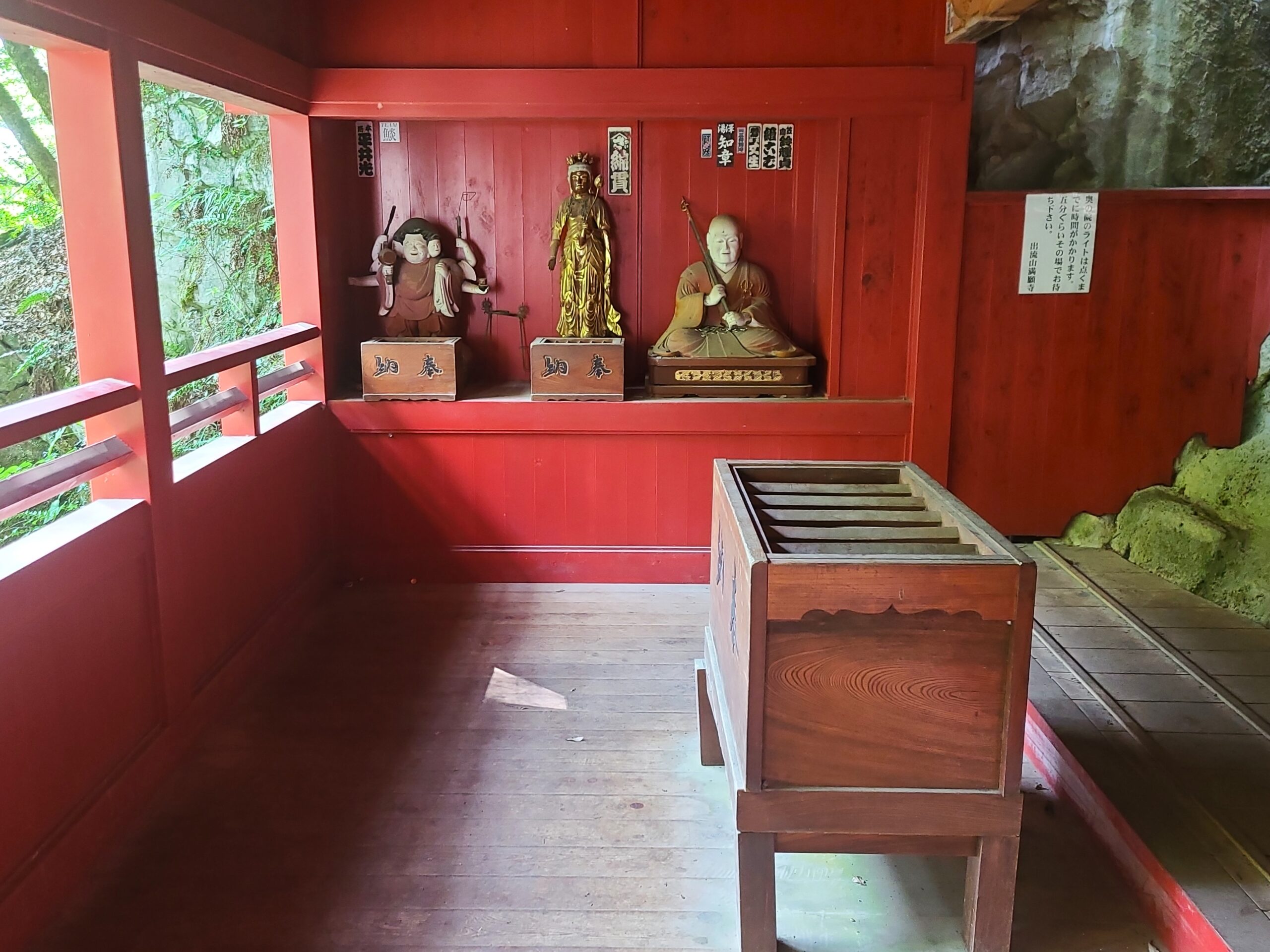 大悲の滝から急な石段を100余段上ると「観音の霊窟」の拝殿に昇殿します。高さ4m余りのこの拝殿が鍾乳洞の入口になっています。拝殿奥には三面六臂の大黒天、十一面観世音菩薩、勝道上人の像が置かれています。