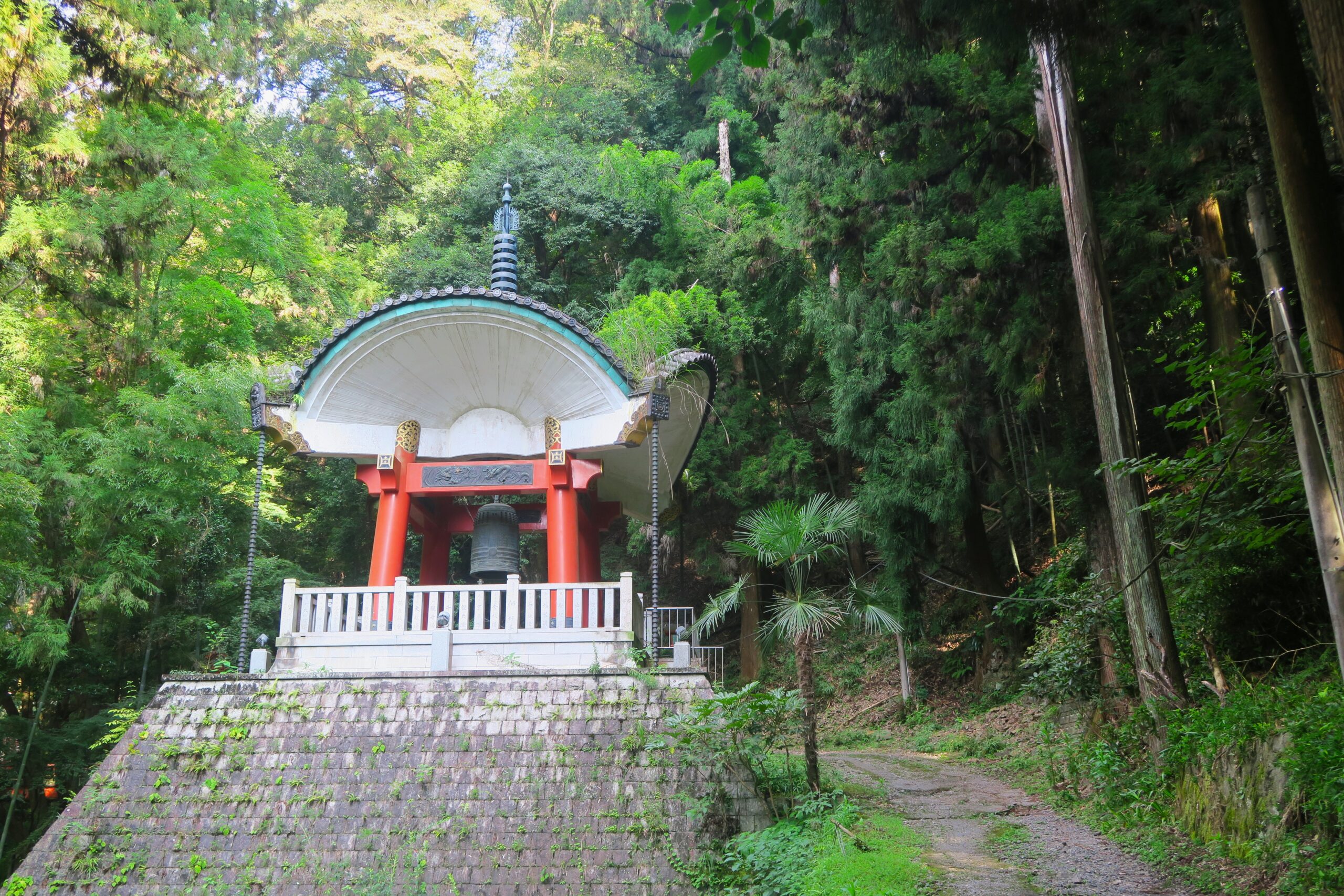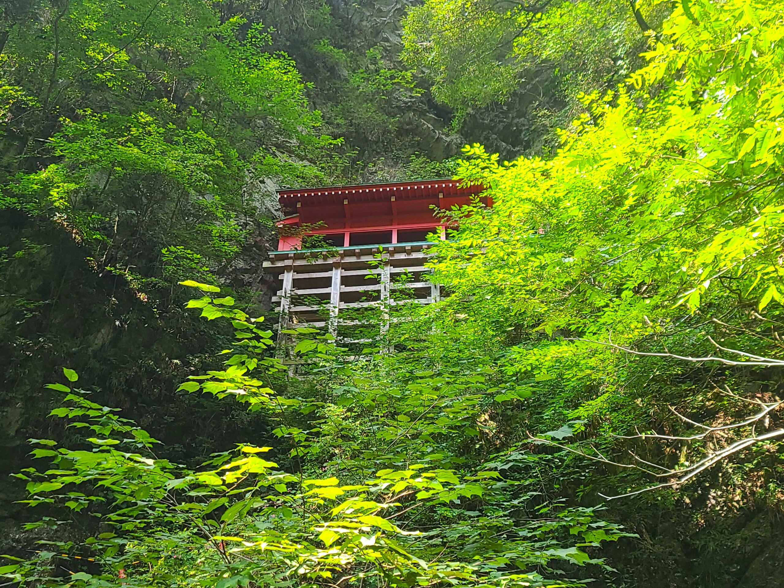 ここから左方を見上げると崖の中腹、岩壁に張り付くように立つ奥之院が現れます。山道を歩いた者しか辿り着けないパワースポットです。