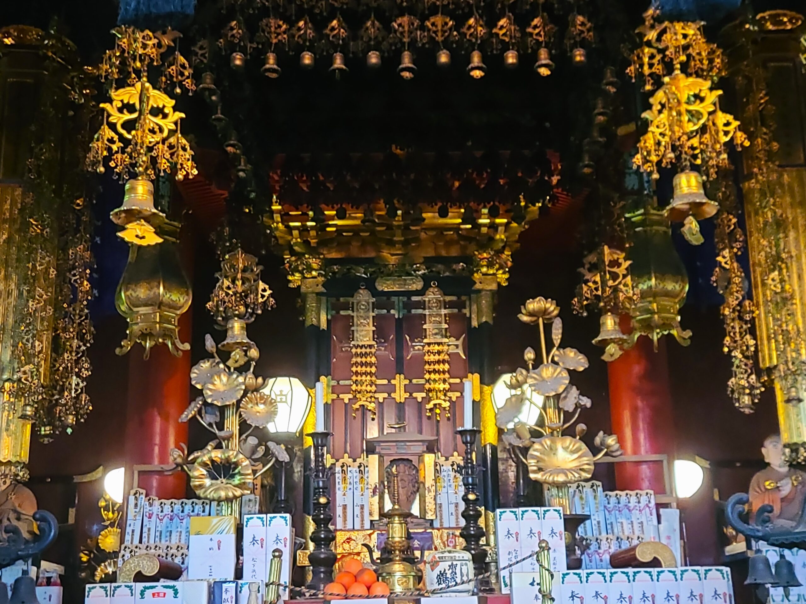 八間四面入母屋造り、銅板葺き、外壁は真壁造り板張り、正面に3間の唐破風向拝が付いています。三手先に竜の彫刻が施され、建物全体が朱色で着色され、精巧な彫刻には極彩色で彩られています。筑波山の大御堂、奈良の興福寺大御堂とともに日本三御堂のひとつと称されています。特に本堂の軒を支える三手先には見事な龍の彫刻がなされています。