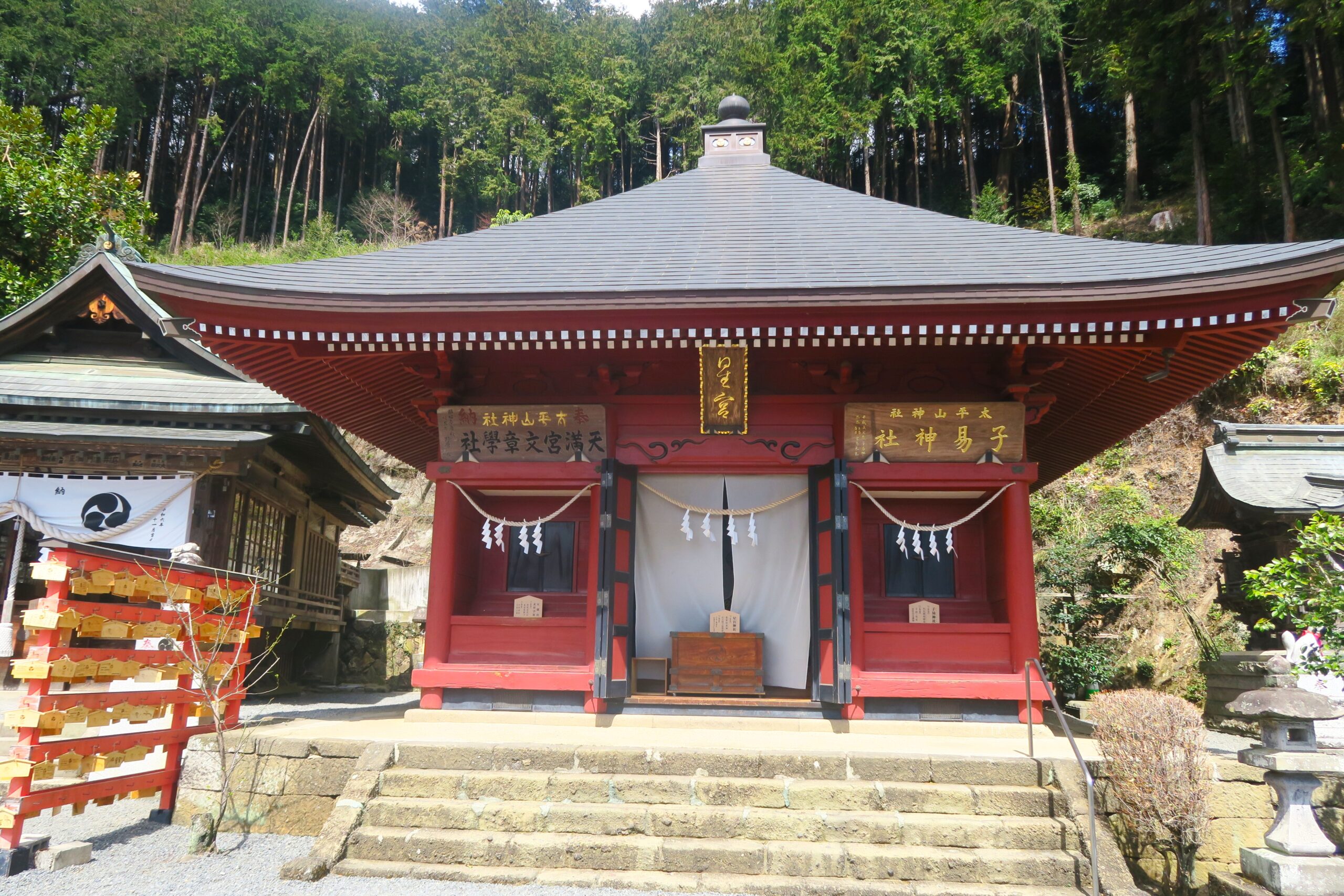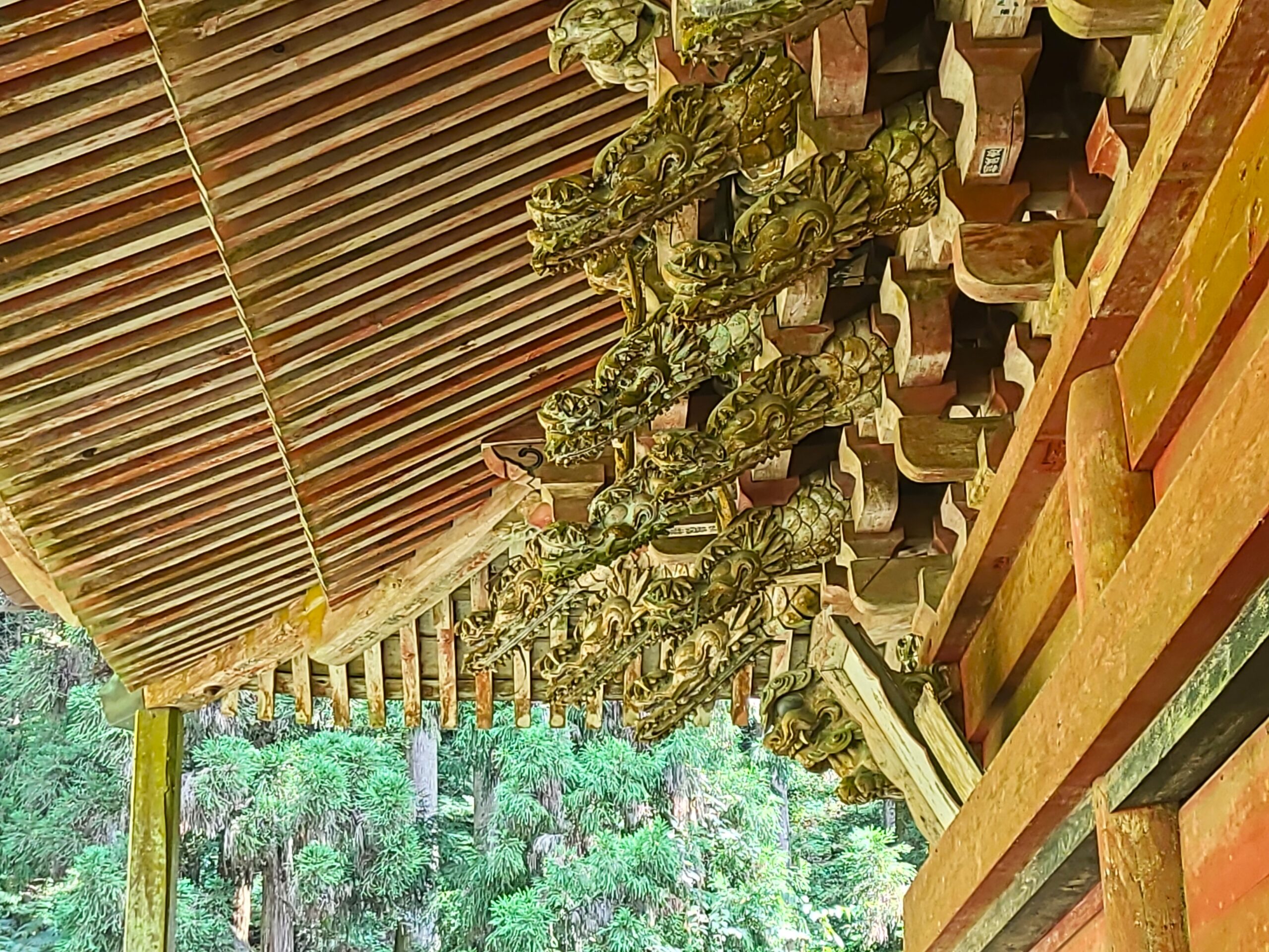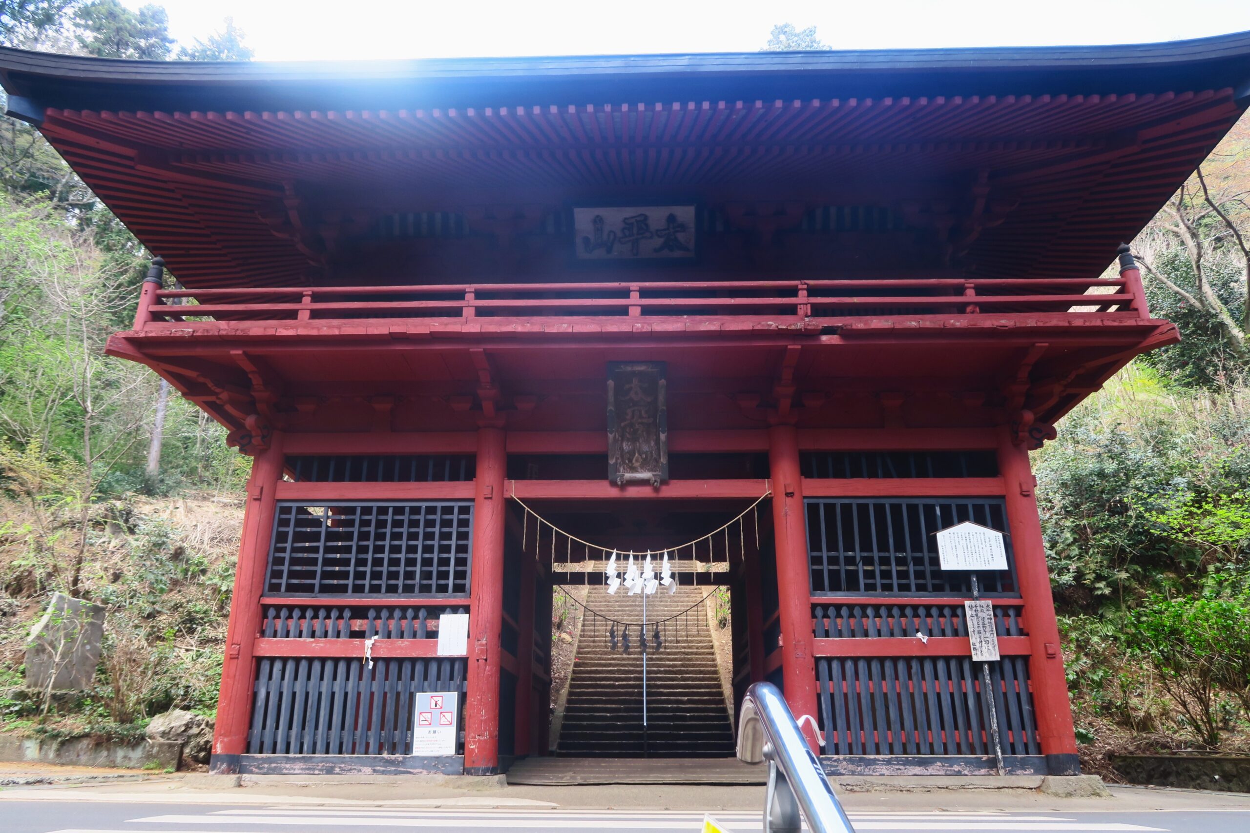 序盤から息を切れますが、樹齢1000年を超える杉の御神木など坂の途中の見どころも多く、楽しみながら上ると、随身門が迎えてくれます。享保8年(1723)徳川吉宗の寄進により建立。前に左右大臣、後に仁王の守護神を配したもので太平山が寺院の山として栄えていたころの名残です。廃仏稀釈後に仁王門が随身門となり仁王と神像の安置場所がかわったわけで、神仏混淆時代の記念物です。建て方は単層入母屋造り扇垂木で俗に傘(からかさ)天井といい、天井絵の龍図は天保3(1832)雪舟の弟子磯辺等隋の作です。