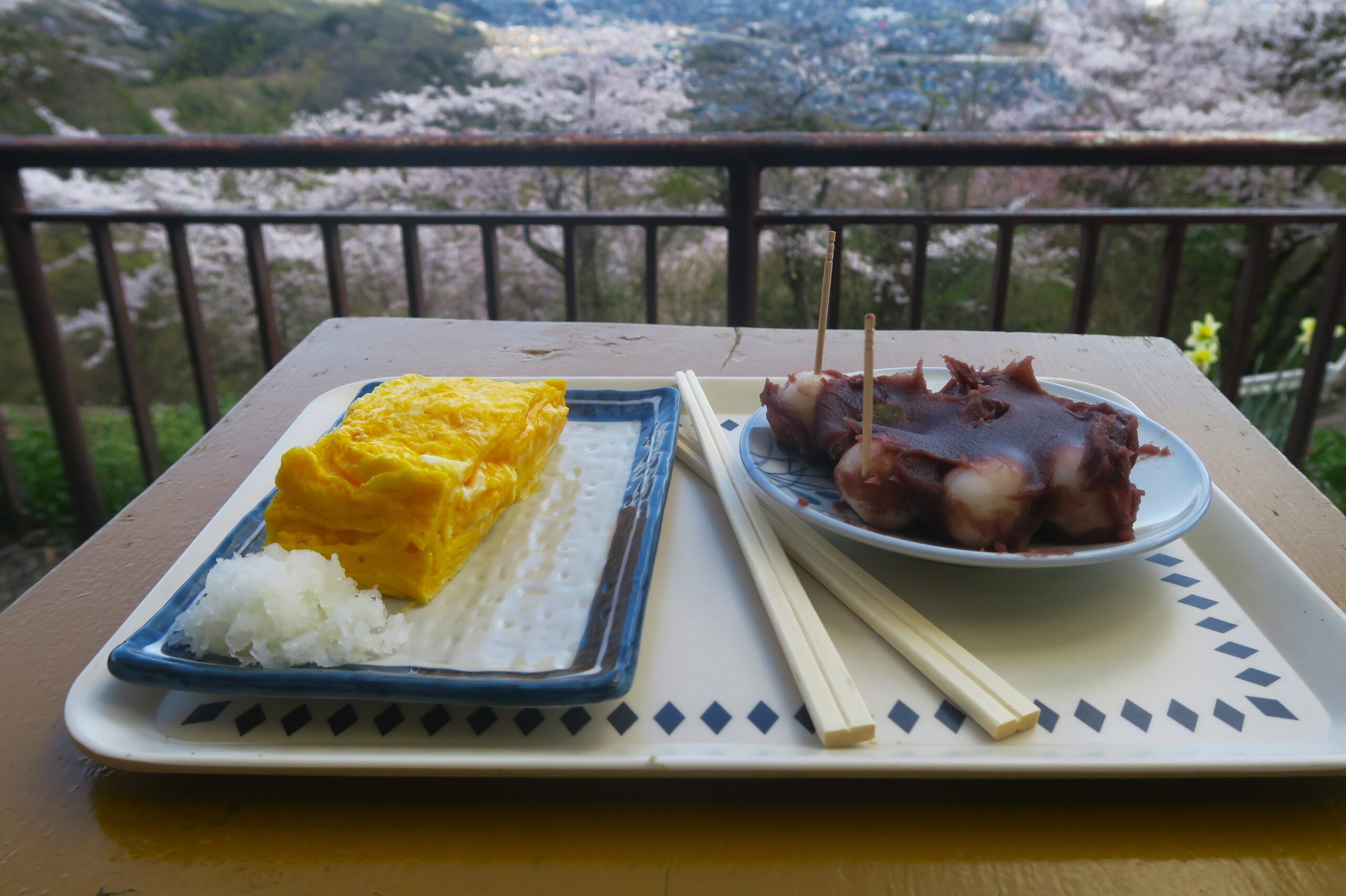 謙信平から眉剣坂を歩いて5分の太平山神社までの道沿いには、太平山名物の焼き鳥、玉子焼き、太平山だんごが看板メニューの茶店が並びます。昔夜鳴きするニワトリは災難を招くとして太平山に奉納する風習がある、奉納されたニワトリの卵を集めて「玉子焼き」、肉を「焼き鳥」にして功徳したのがきっかけです。また五穀豊穣を願い毎年たくさんの穀類が奉納され、奉納された米を分けて頂き粉に挽いて「太平だんご」となりました。柔らかく焼かれた玉子焼きに少し醤油を落とした大根おろしを乗せて口に入れると玉子焼きの甘さと大根おろしの苦みが口の中に広がります。目の前に広がる関東平野の風景をこの時期桜越しに見ながら食べる名物は格別です。