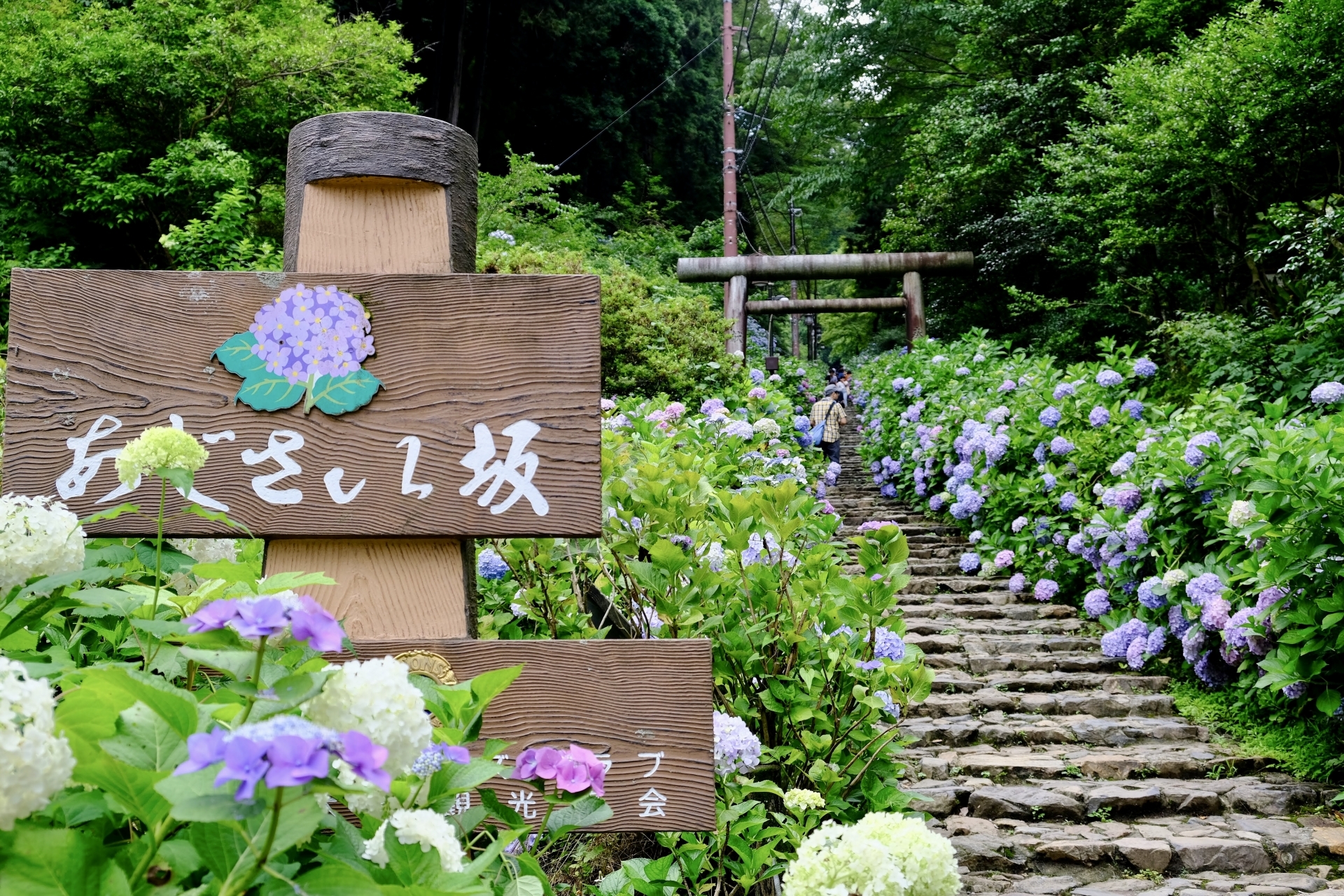 迂回ルートの二つ目は、あじさい坂駐車場から徒歩で山頂の大平山神社を目指します。あじさい坂駐車場に車を停めて麓から随身門に至る約1000段の石段「厄除けの石段」・あじさい坂を登るほうがゴールした時の感慨も深いものがあります。石段の両側に、西洋アジサイや額アジサイ、山アジサイなど約2500種株が植えられていて、6月下旬から7月上旬には一斉に咲き競います。石段はこの山で産出する石を使った「野面積み」で、信徒の労力と寄進によるもので、雨の日は黒く光り格別に美しい。約30分の行程です。