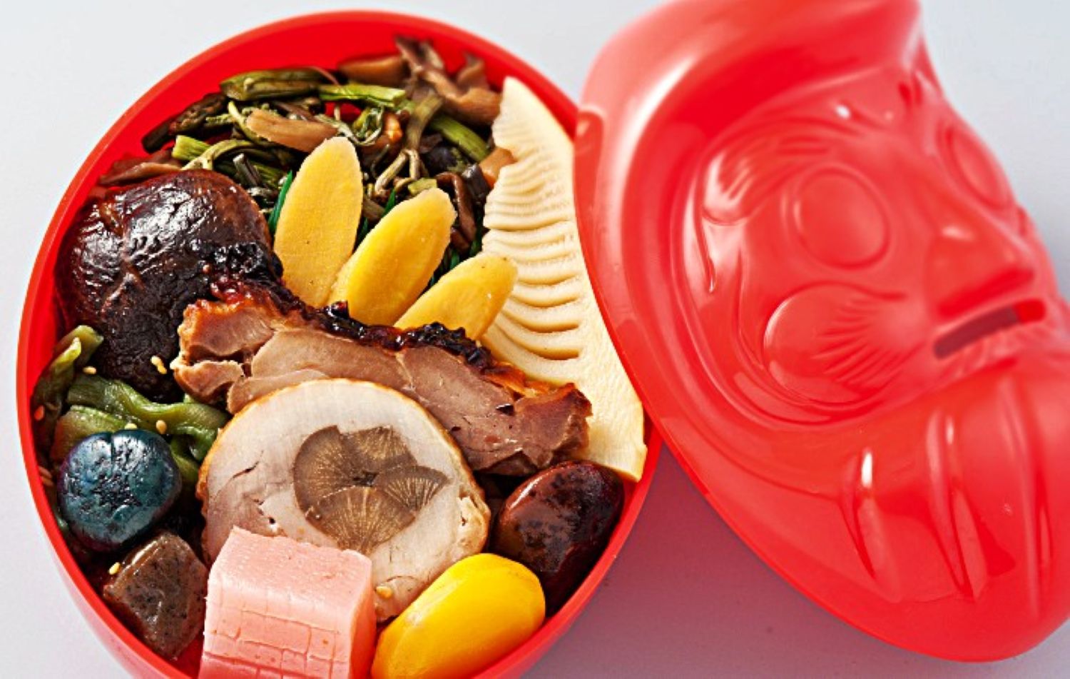 少林山達磨寺を出発し、中山道に沿って歩き街道の風景を楽しむ旅もJR高崎駅で終わります。最後は高崎駅の人気駅弁「だるま弁当」を購入します。昭和35年(1960)に発売されただるまの形をした真っ赤な容器は、達磨寺で開かれる「だるま市」にあやかったもの。プラスチック製の容器は食後に貯金箱として使えます。赤いフタをパカリと開けると、群馬の自然を思い起こさせる山の幸がふんだんに盛り付けられています。滋味豊かな「山菜きのこ煮」、歯触りが食を楽しくする「穂先竹の子煮」や「山くらげ」「椎茸煮」。群馬名産「こんにゃく」の食感も赤と黒の彩りとともに参加している。そんな中で、控えめながらも満足感を引き出しているものが「鶴八幡巻」「コールドチキン」。甘味として栗や花豆も添えています。ごはんは「茶飯」で口の中にほんのりと醤油の風味が漂う、軽やかな味付けです。添えられた「小ナス漬け」が、薄味に調えられた料理たちをキリッと引き締めている。全体的に達磨寺の普茶料理をベースにしたヘルシーな弁当を味わいつつ家路につきます。