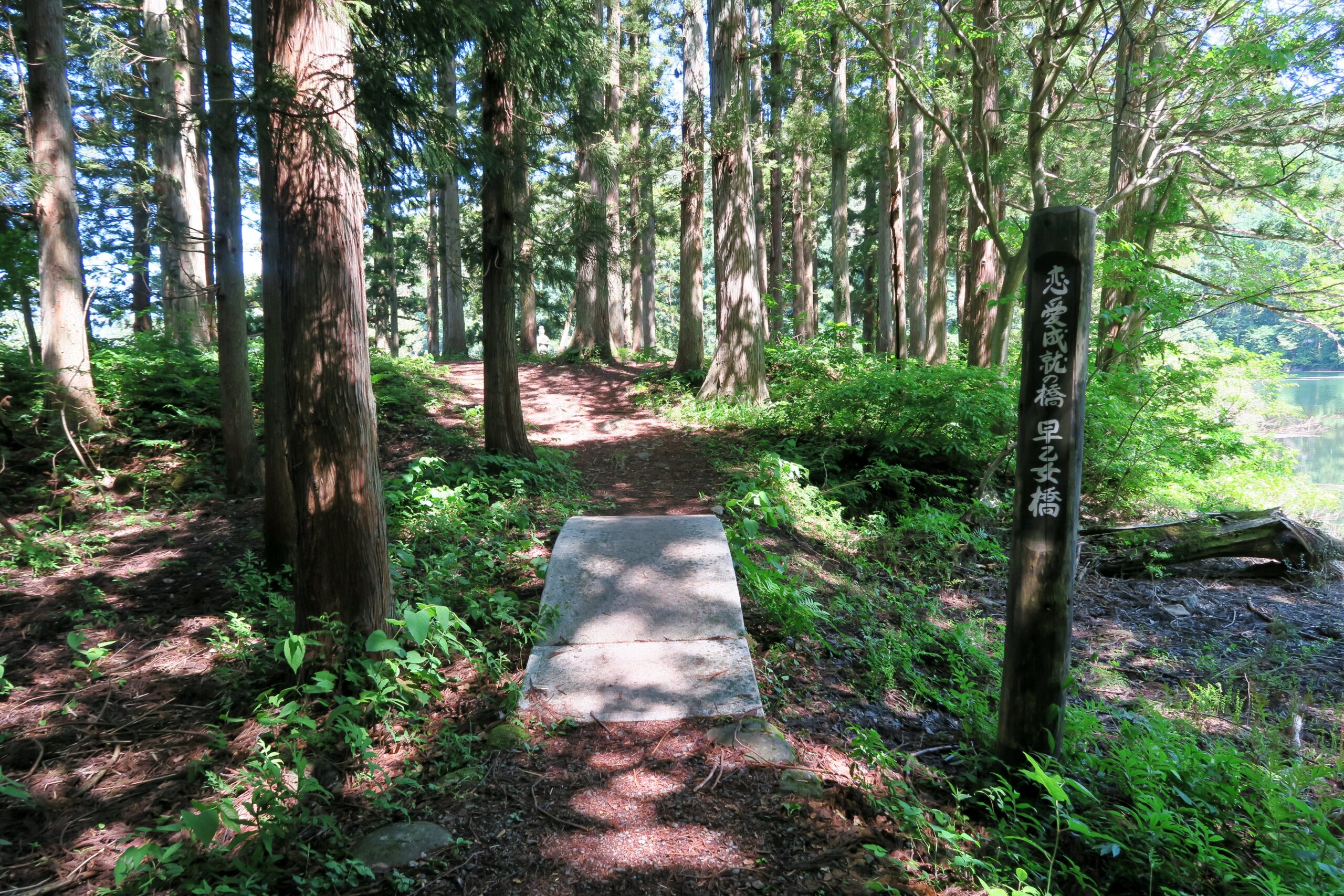 湖畔の桜並木を通り、杉林を縫う散策道を抜けるとハート型の湖面にキューピッドの矢が刺さったように突き出した弁天島に降りる歩道があります。石の七福神の前に“恋の絵馬掛け”がありますので絵馬はここ奉納しましょう。晴天なら妙高山がよくみえます。