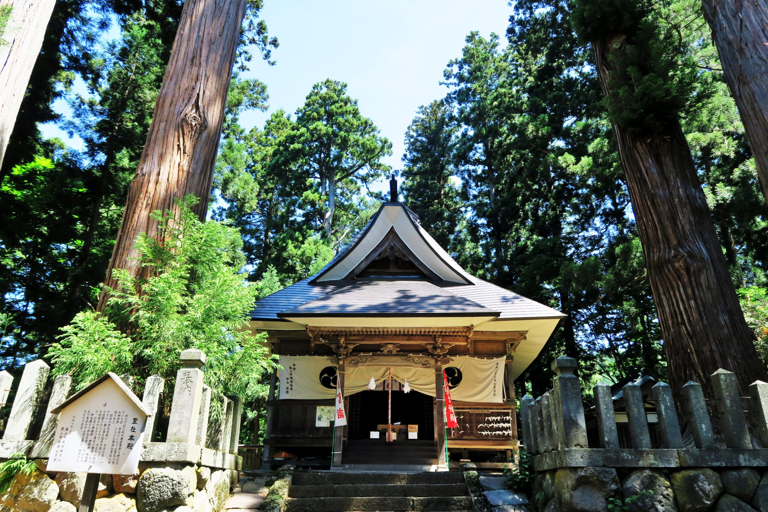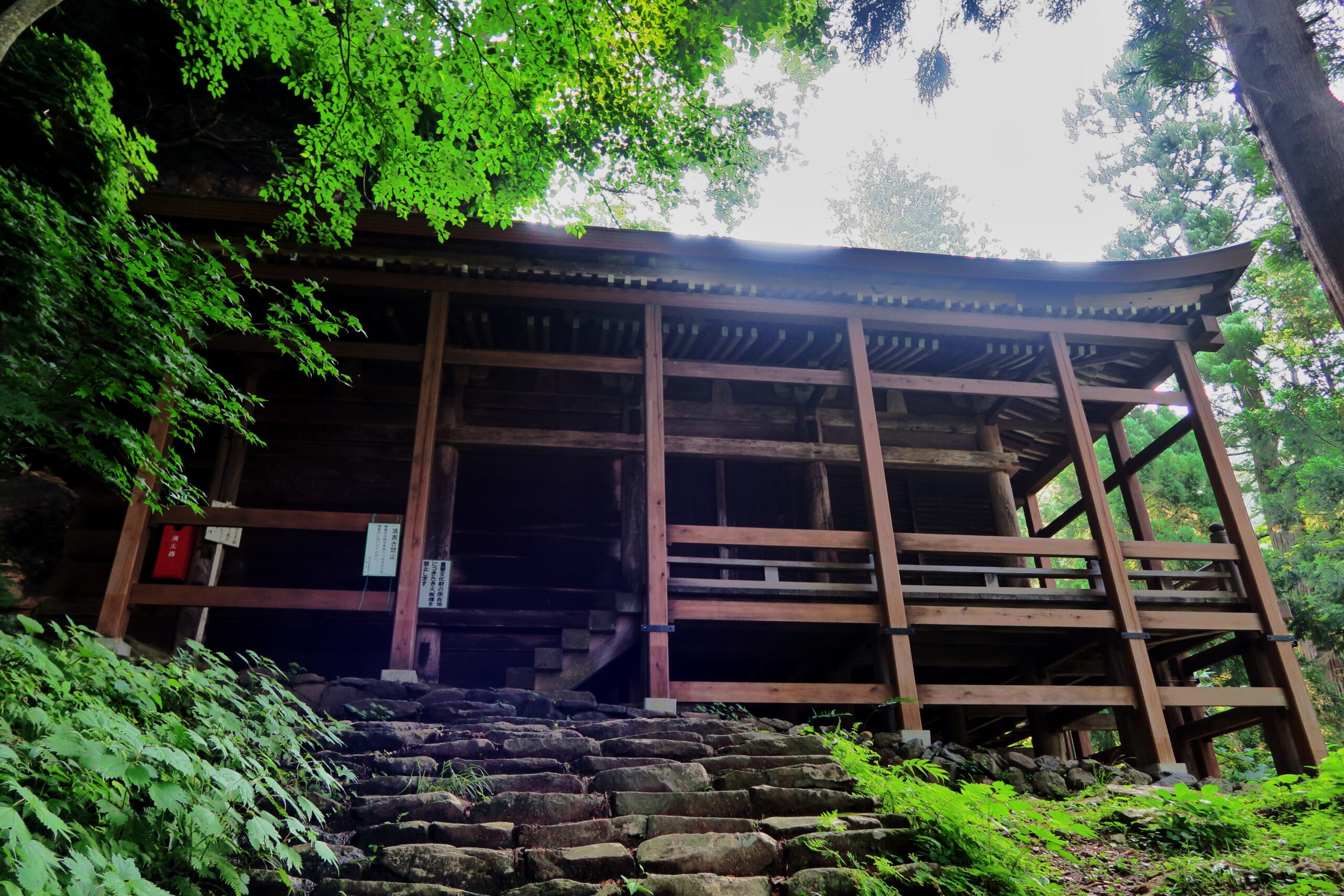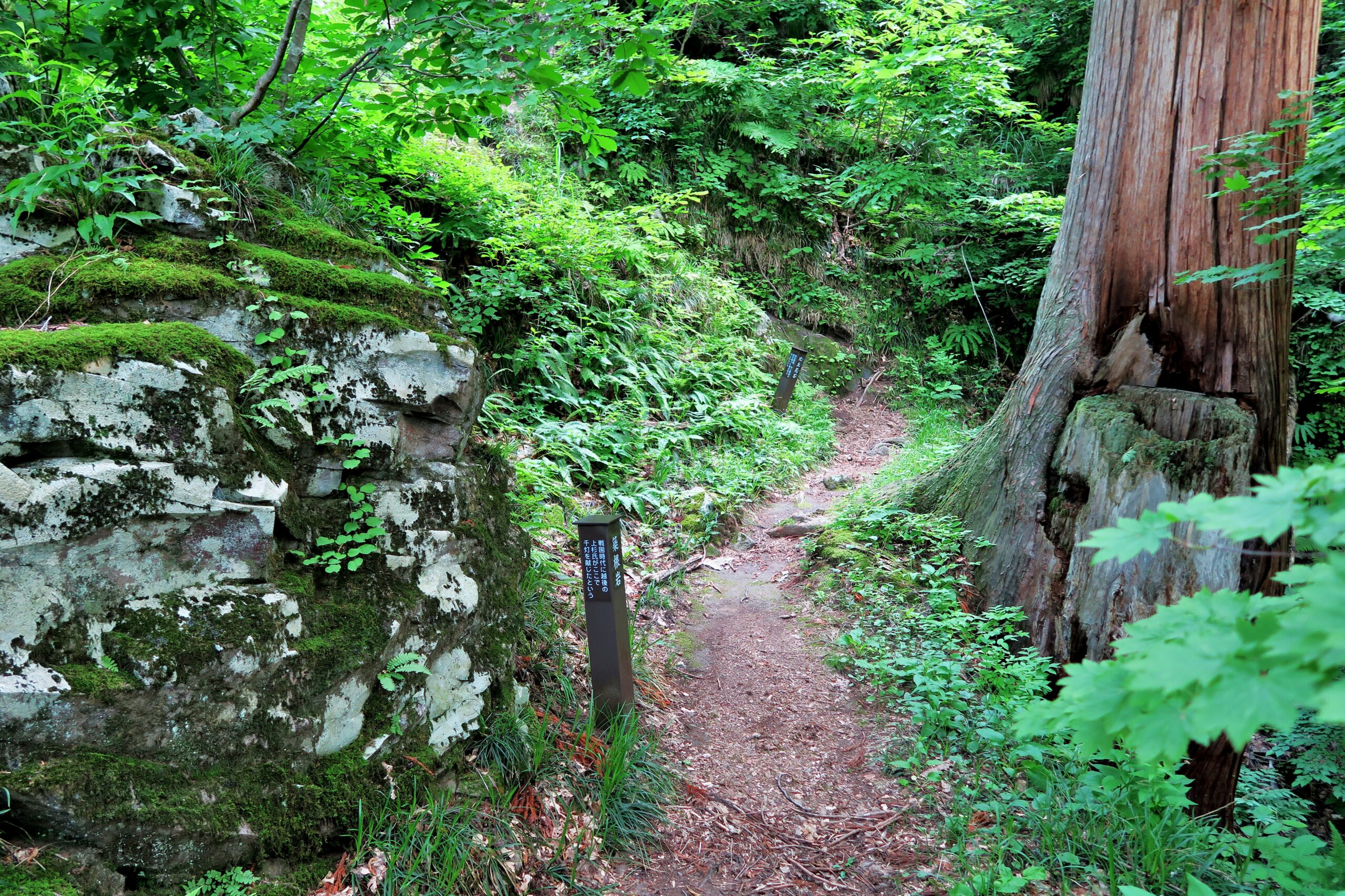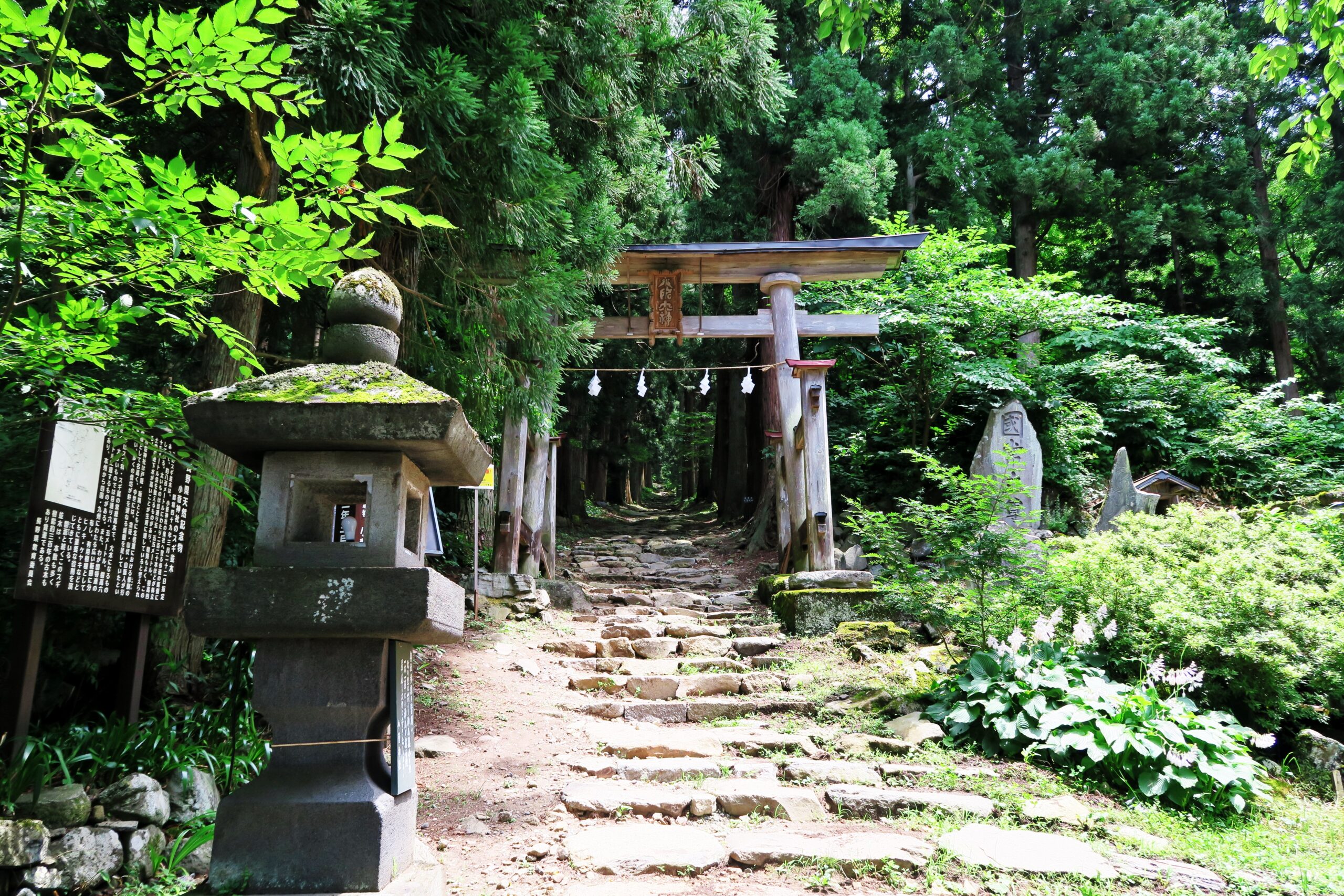 登りきると戦国時代越後の上杉氏がここで千灯を献じたという「築根岩」があり、更に女人禁制を破った者が石になったという「比丘尼岩」がころがる最後の急な坂をひと登りすれば奥社手前の社殿小屋に到着です。