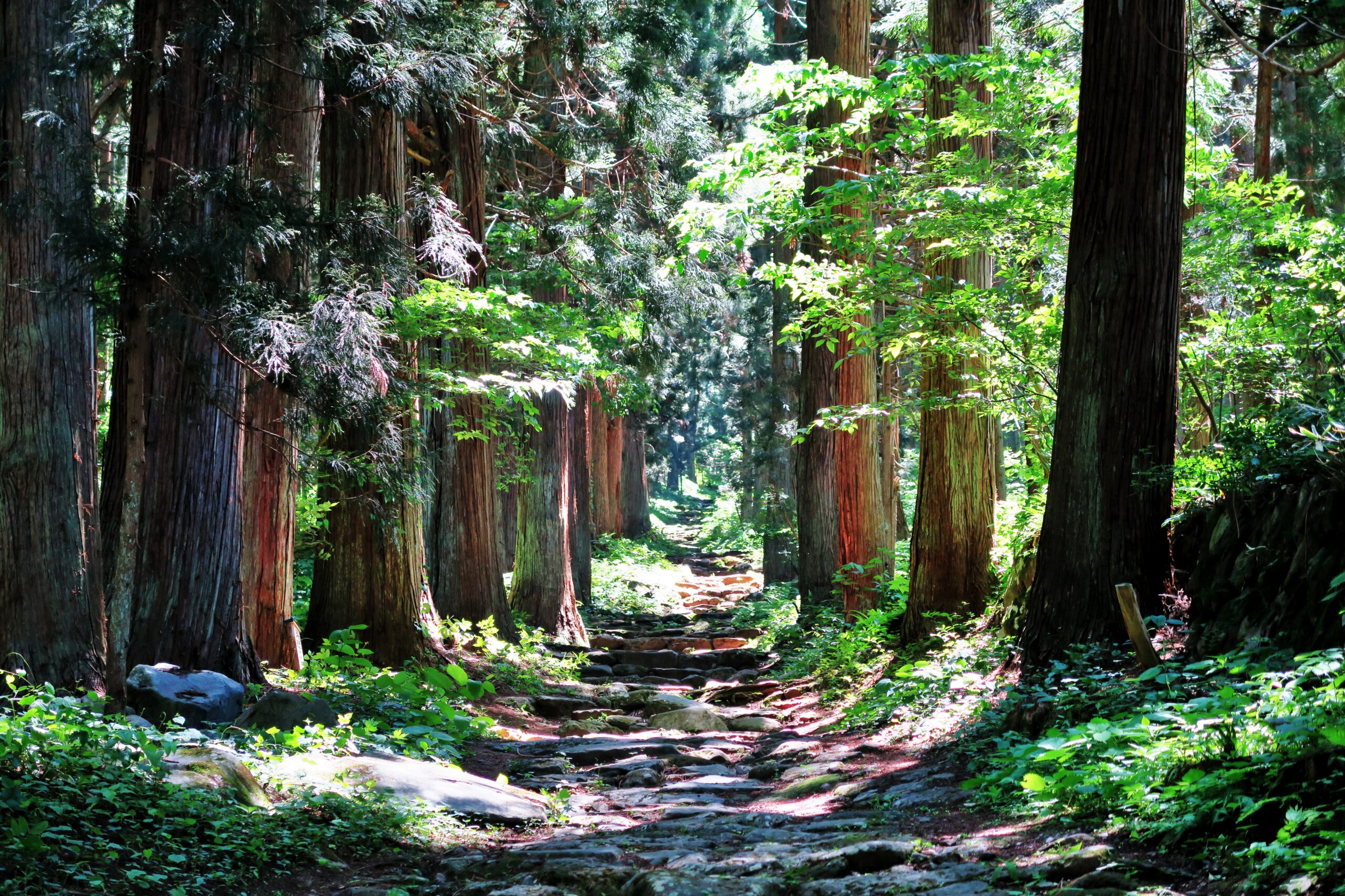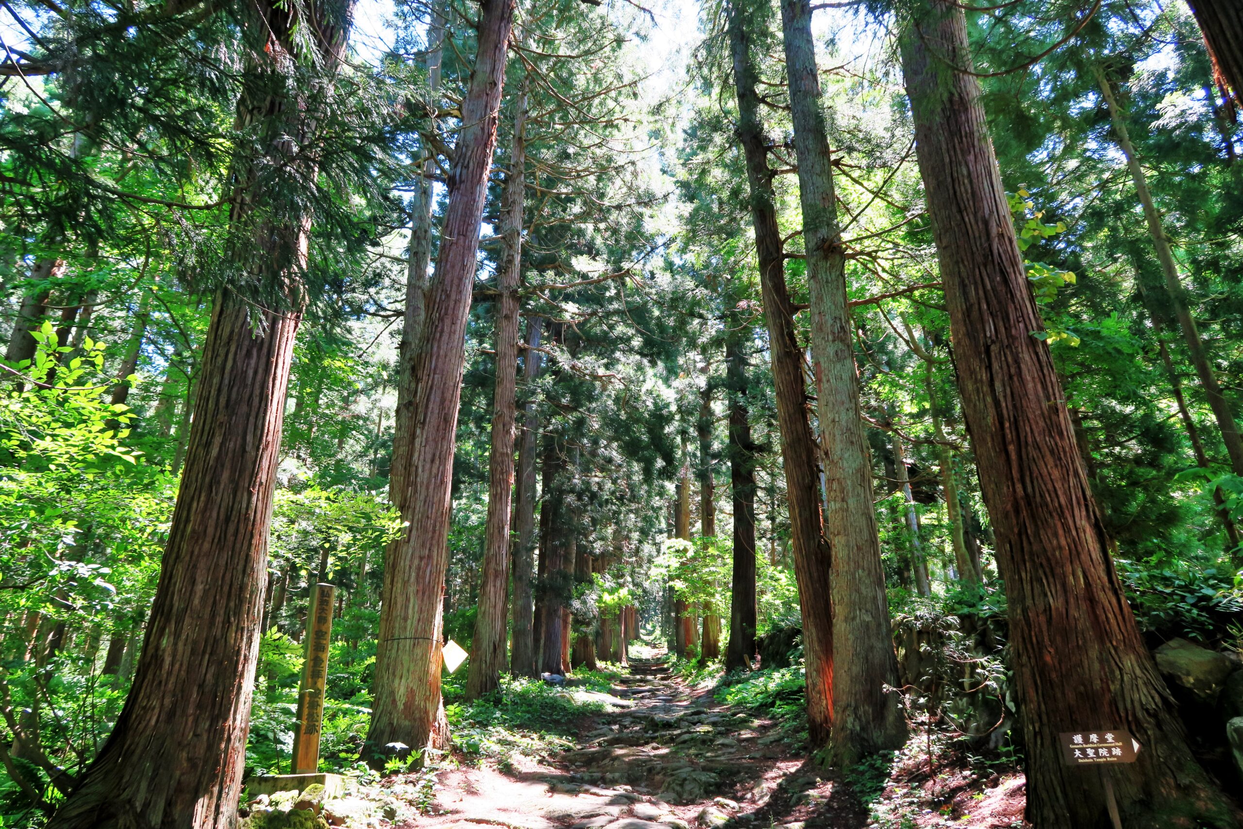 三の鳥居から奥社へ登る参道の両脇に約800mにわたり、樹齢300年と言われる220本もの杉の大木が並木を作っています。太いものは目通り5.55m、樹高45m余を数えるものもあります。杉並木の参道は木の根と石が階段のように折り重なり、修験の地と呼ぶにふさわしい荘厳な空気が漂っています。奥社までは徒歩で約1時間、弘法大師や幾多の修験者が通った古えの道はひんやりとした空気に包まれています。