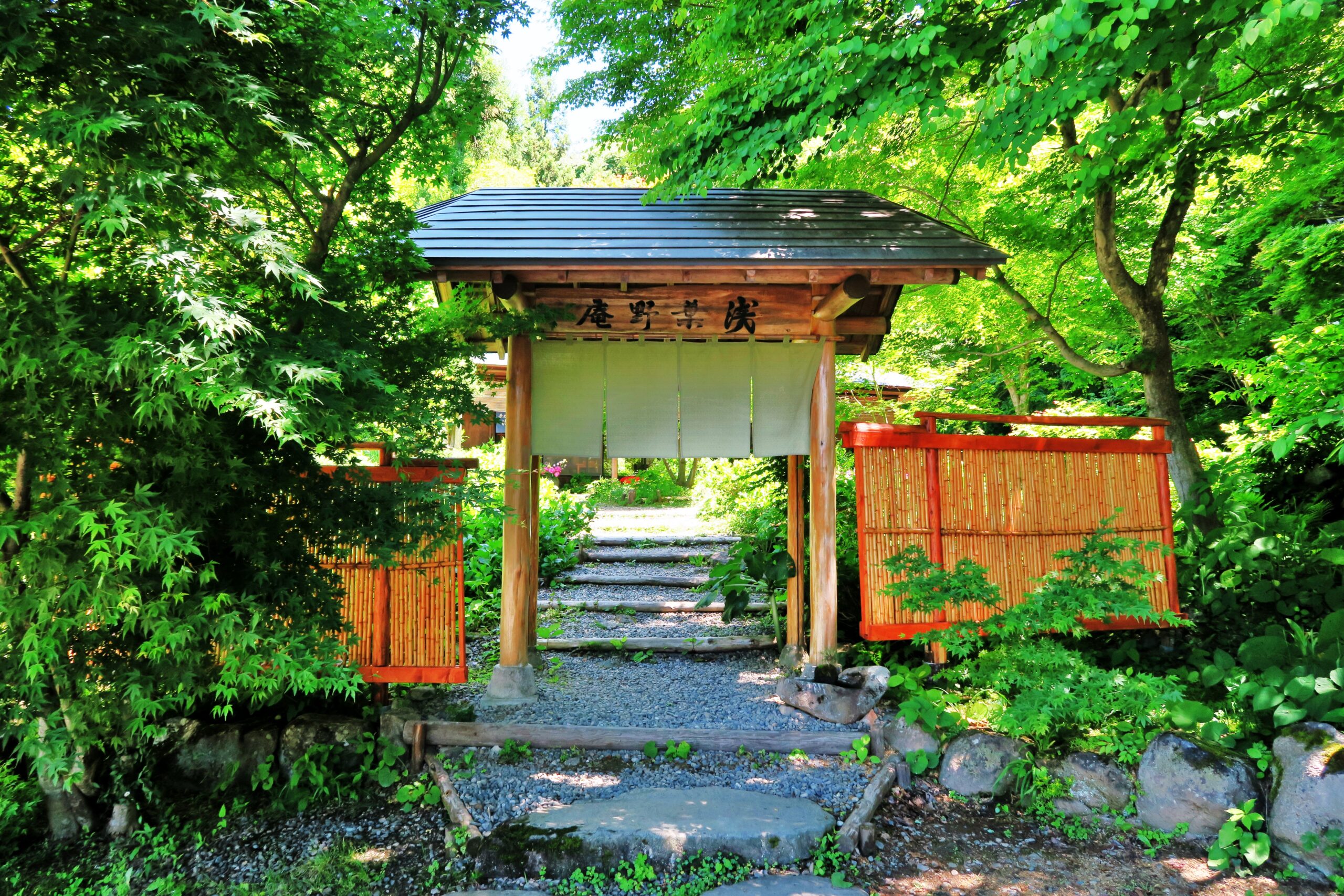 浅葉野の里に佇む茶処「浅葉野庵」で一息はいかが。万葉集にも詠まれたほど美しい自然が息づく風光明媚な場所が、小菅山の浅葉野の里です。“浅葉野”とは平安時代、宮廷の和歌に多く歌われた枕詞で、美しい里を指す言葉だといわれています。そんな浅葉野の里、小菅神社奥社への参道入口に佇むのが「浅葉野庵」です。まず迎えてくれる京都のような木々に囲まれた趣のある門をくぐります。玄関までの小径に植えられたたくさんの緑や山野草を眺めながら店内入ります。