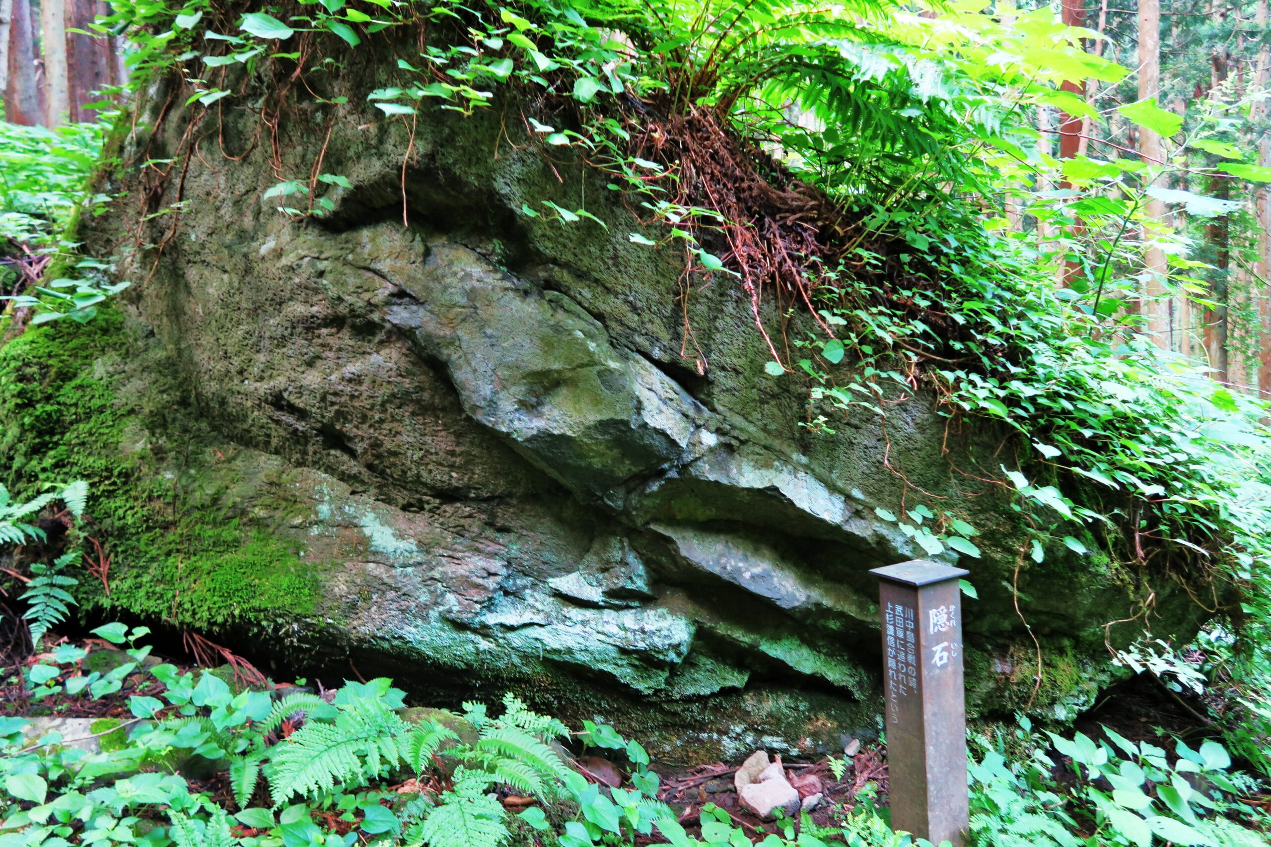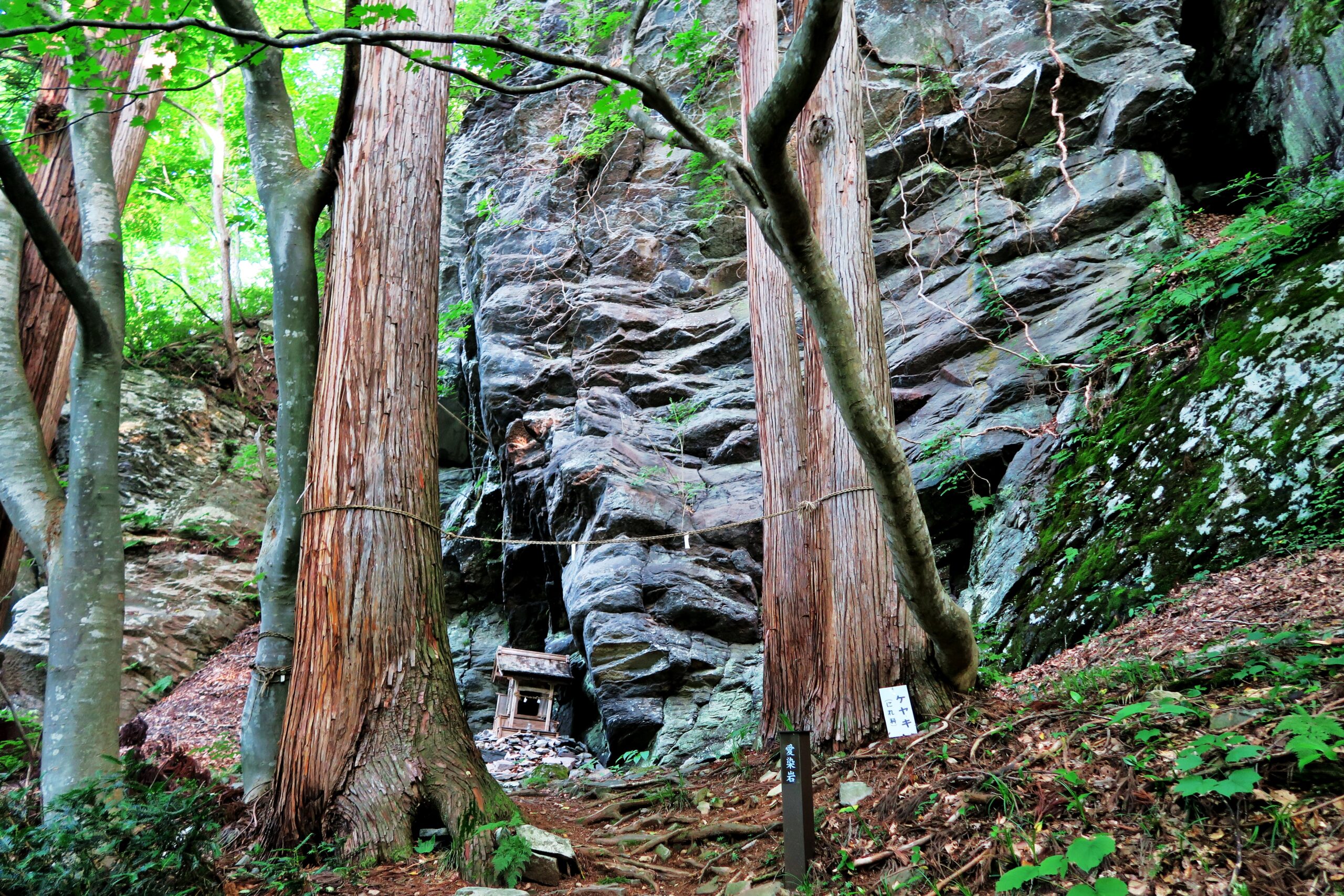 奥社までの参道沿いには、伝説とロマンに満ちた奇岩が連続して現れ楽しませてくれます。三の鳥居から200mにある旧観音堂跡のすぐ近くにあるのが「鐙石」。岩の側面に鐙型のくぼみがあることから呼ばれています。さらに約250mのところにあるのが、川中島合戦の際、上杉謙信が追手から隠れたとされる写真の「隠れ石」です。武田信玄は小菅の里まで追ってきたのですが、山鳴りと共に突然大岩が崩れ落ち、大木が倒れて来たため、小菅権現の神威に恐れをなして、逃げ帰ったと言われています。
