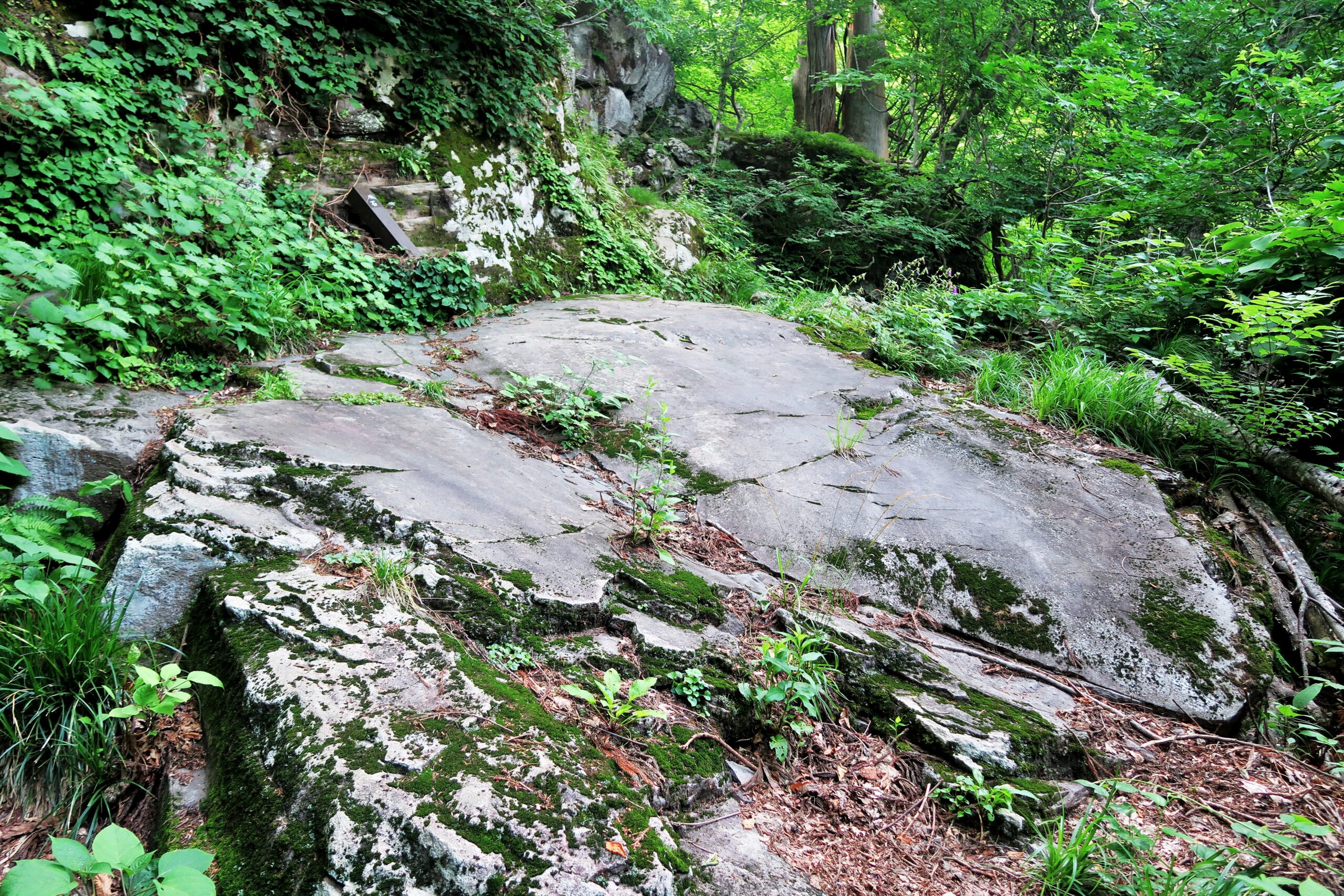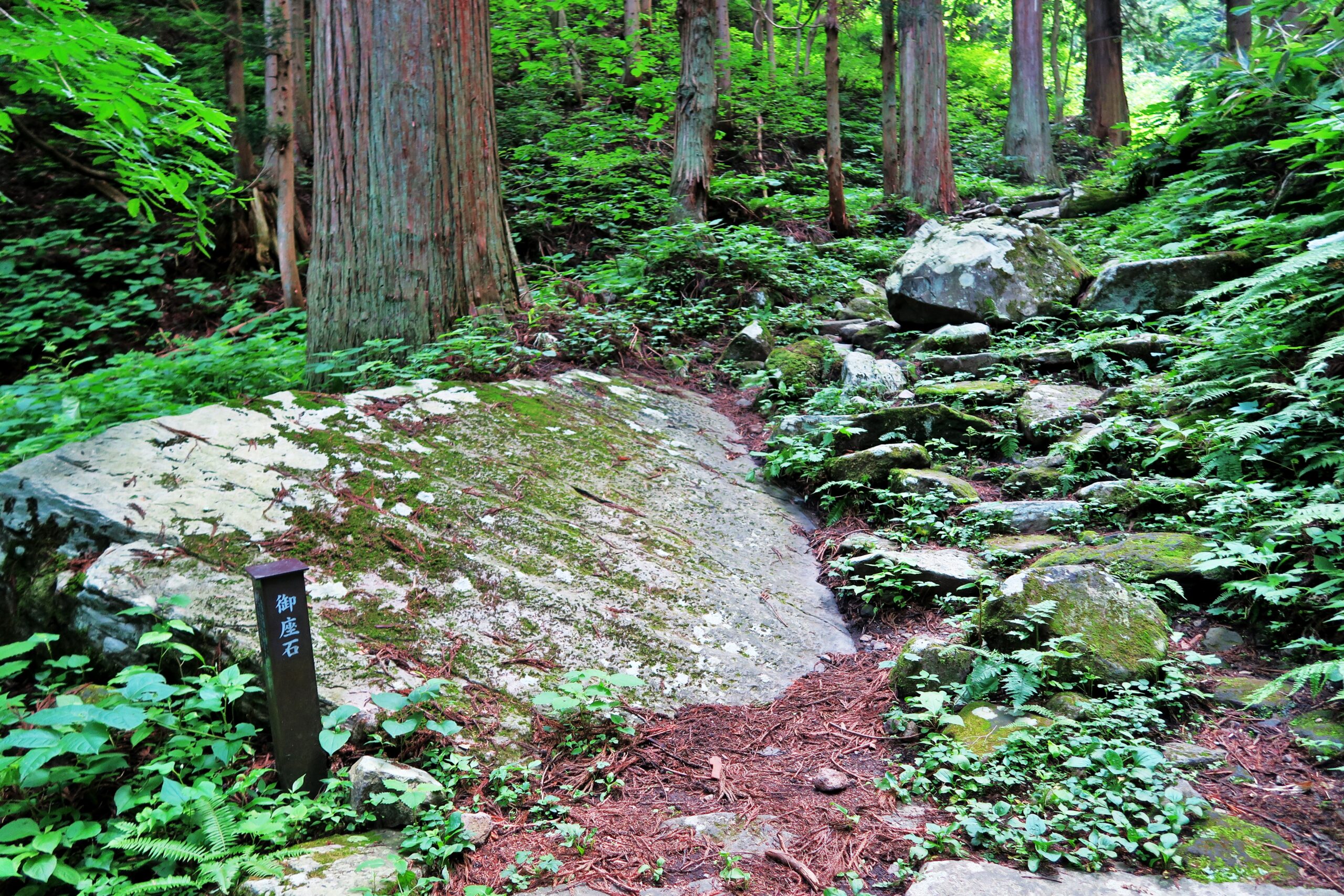 さらに50m歩くと弘法大師が参拝の折に座ったという「御座石」があります。小さなくぼみは、大師が持っていた杖の先がめり込んだものと言われています。このあたりからいよいよ溶岩性の岩石が露出する急峻な登山道になりますよ。