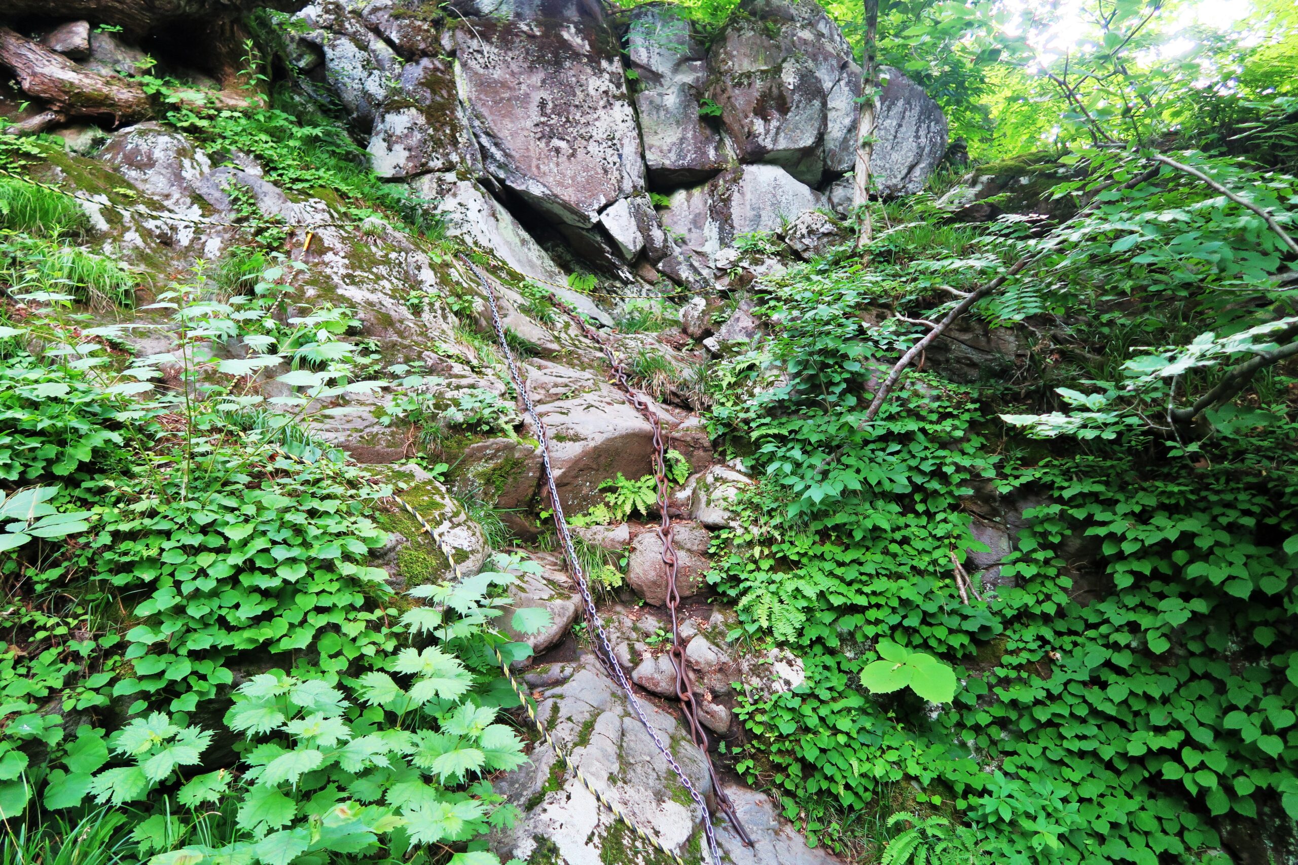 その先には鎖場があり、4mほどの絶壁ですがしっかり掴んで足場を確保しながら登ってください。