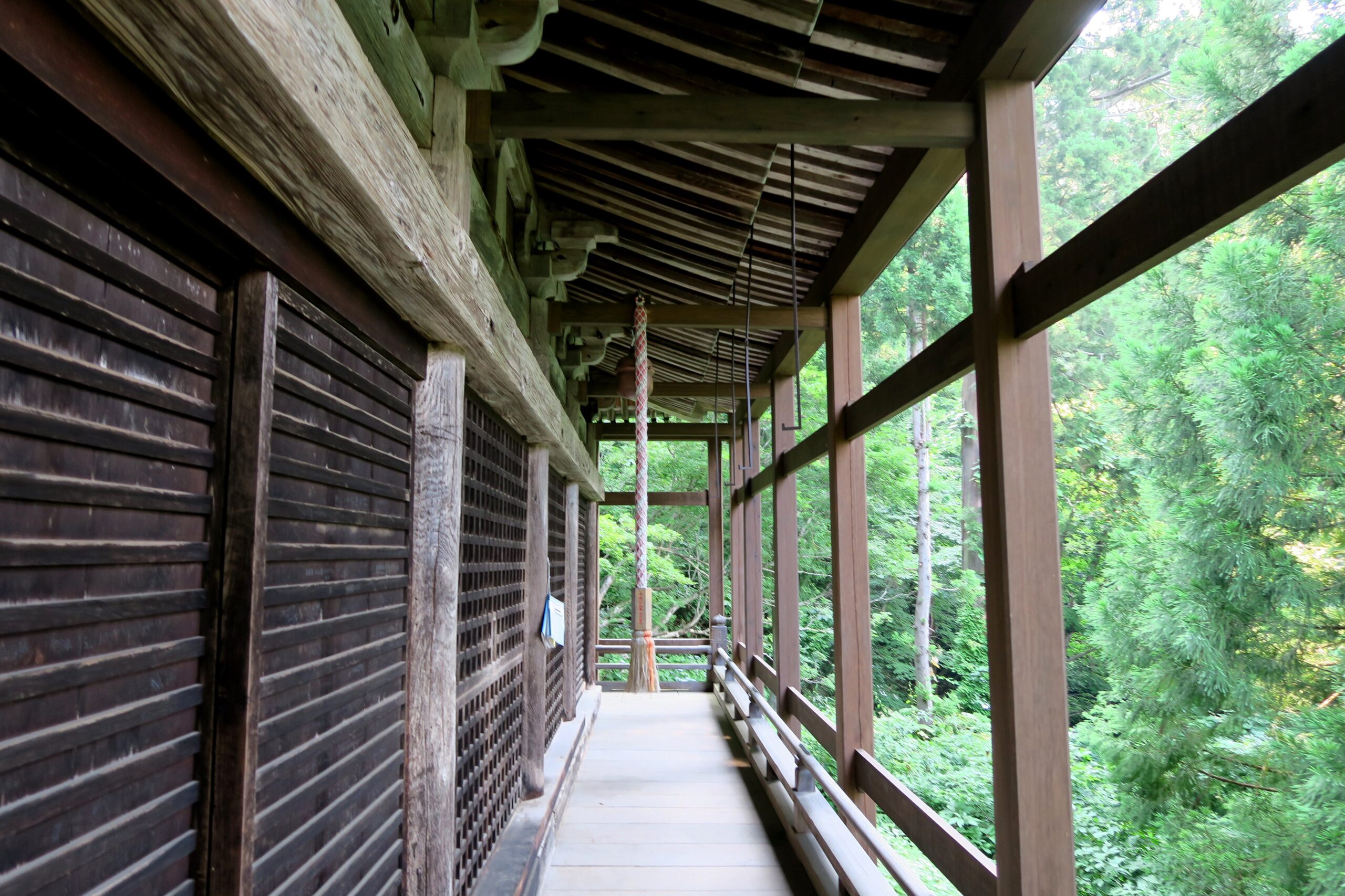 小菅山(標高1047m)の山腹(標高900m)に建つ奥社である小菅神社の本殿に到着。現在の建物は、天正19年(1592)の修復記録があり、小菅神社の祭神8柱を祀り、ご本尊は馬頭観音。52.8㎡の建物は、南側を正面にして北面に岩窟を背にした懸崖造り、妻入りの入母屋造りの本殿と附属宮殿は室町時代中期のものであり、昭和39年(1964)に国の重要文化財に指定されている。庇は北側にはついておらず、西側の階段から社殿に上るようになっています。
