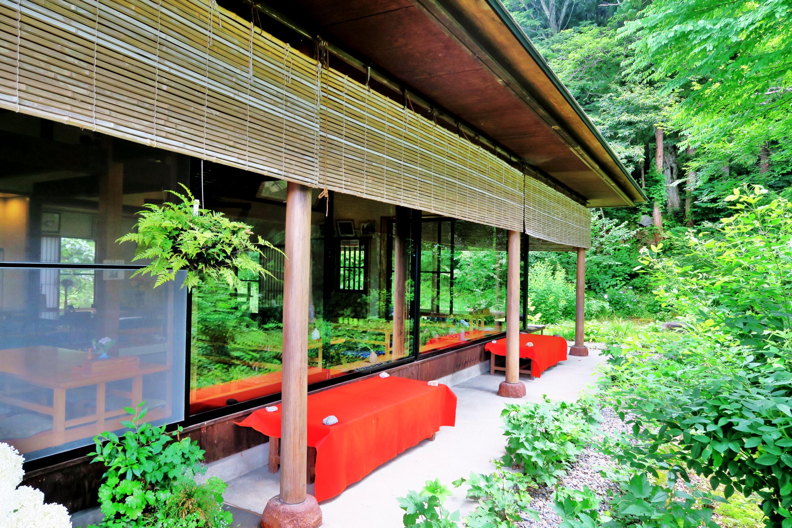 大きな窓ガラスを配した店内は、自然の光が差し込み、室内のどこからの席からも庭の緑あふれる景色を眺めることができます。晴れた日にはぜひ庭の緋毛繊が敷かれた縁台で、山野草を眺めながら、お茶をいただきたいものです。ゆっくりと時間の流れる茶処は、癒しのおすすめスポットです。