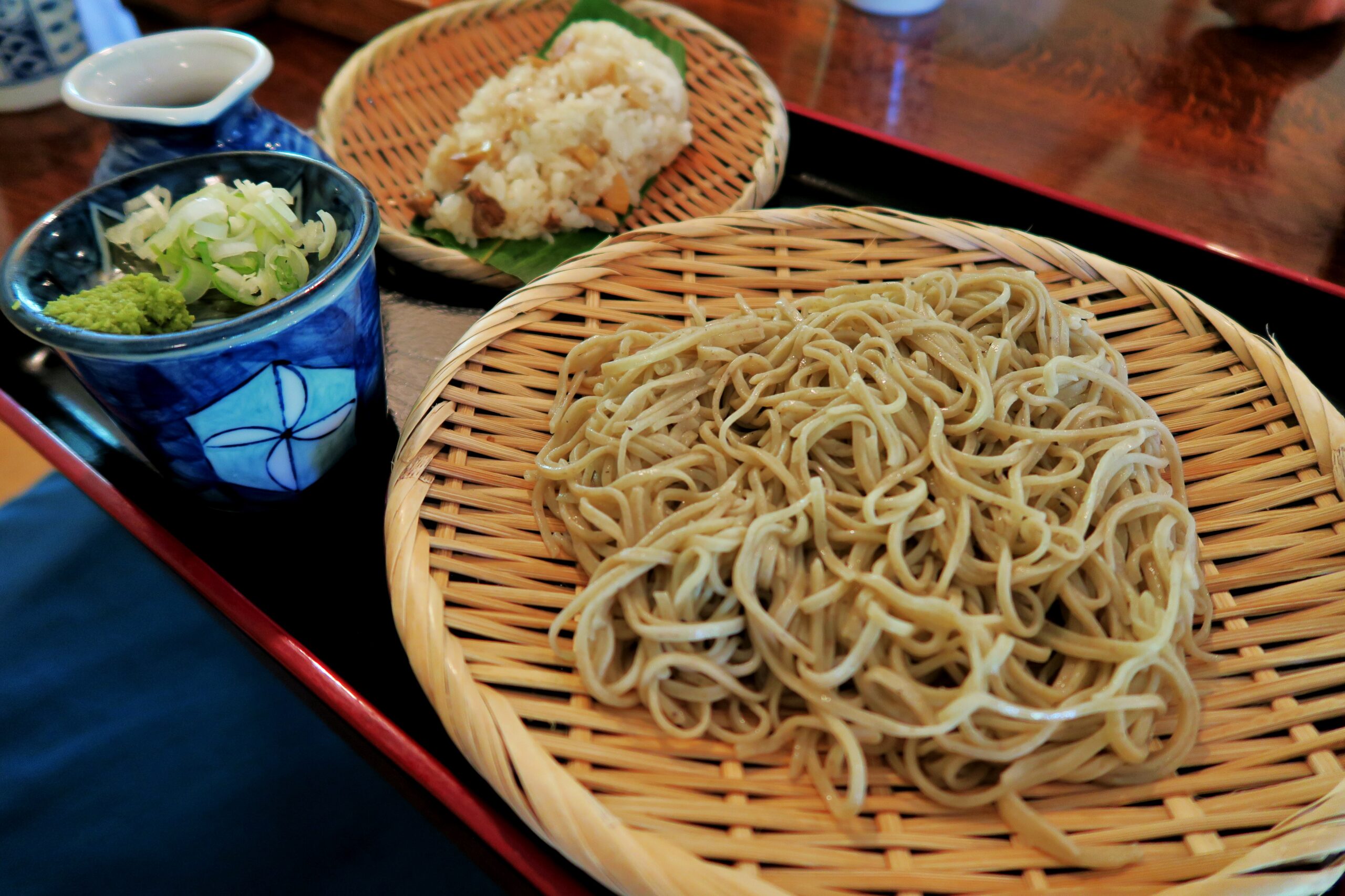 写真は『ざるそばとおこわ(1100円)』で、喉越しの良いおそばに笹の葉にのったもちっとしたおこわがセットになっています。信州らしい手打ちそばやおやきのほか、歩き疲れた身体を休めるあんみつや抹茶セットなど喫茶メニューも充実しています。