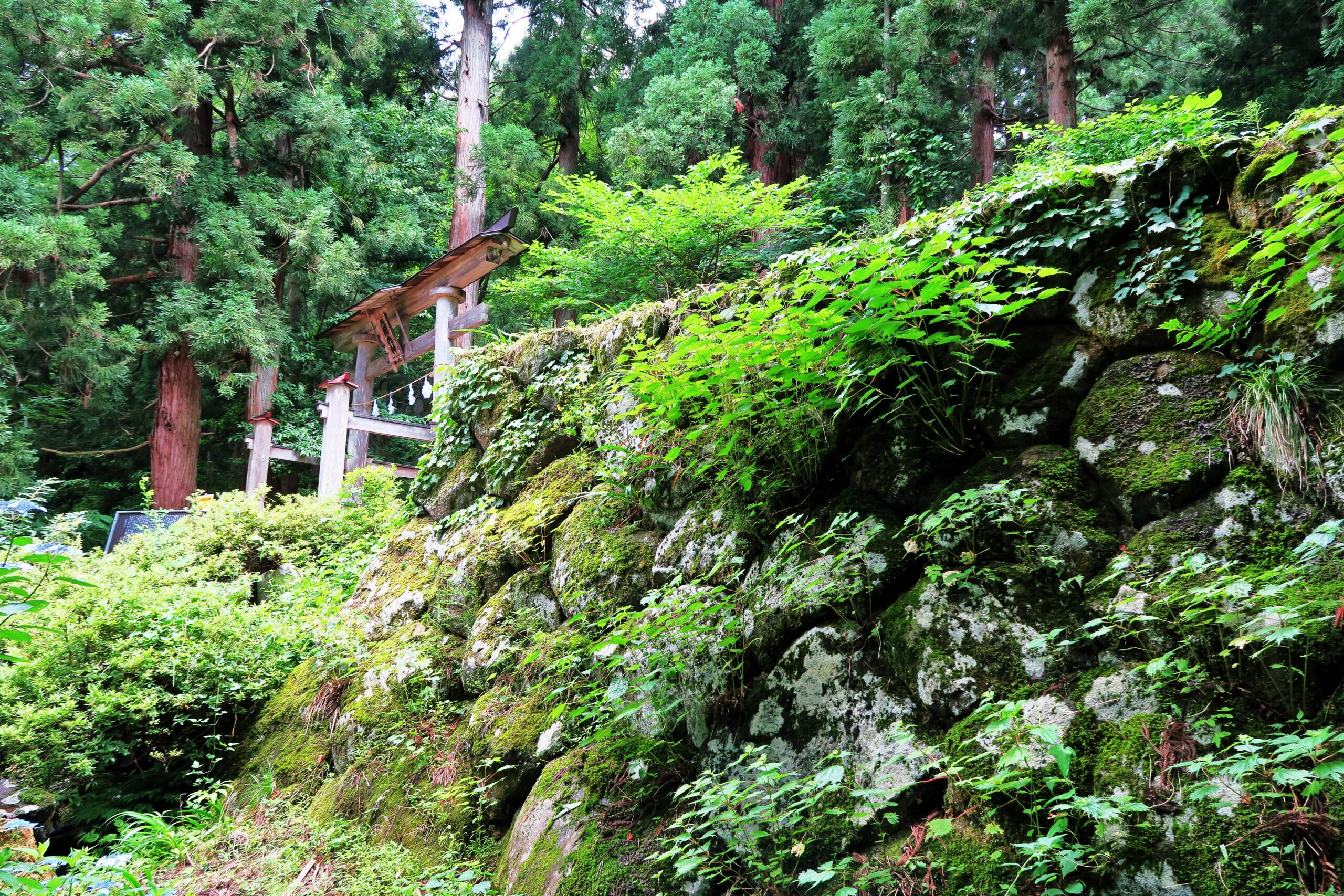 中近世には現在の参道(カイド)から妙高山(写真奥)に向かう軸に、それぞれ修験霊場が構成されていました。かつて栄えた賑わいをもう見ることはできませんが、集落には院坊が並んだ石垣と平場による地割が今もその姿をとどめ、特徴的な風景をつくりだしています。