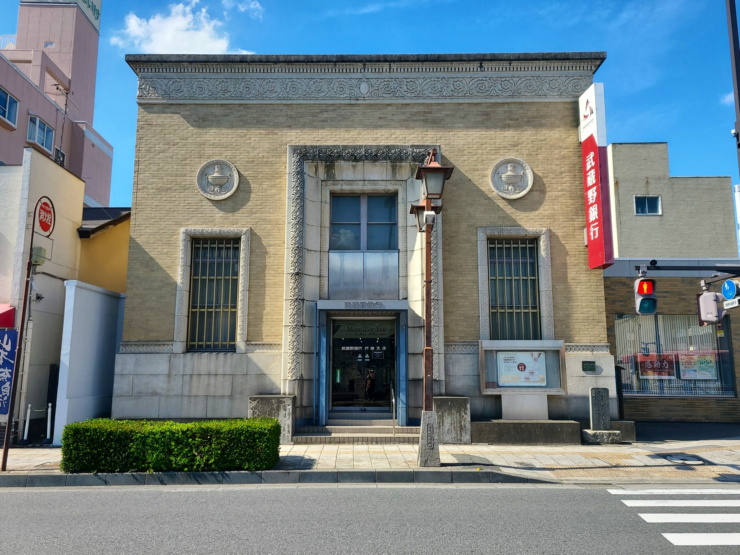 武蔵野銀行行田支店店舗は足袋産業を支えた忍貯金銀行が昭和9年(1934)に竣工させた彫りの深い近代復興式の鉄筋コンクリート造2階建ての本格的銀行建築の店舗。外壁は当時流行のスクラッチタイル貼りで、本格的な歯飾りの軒蛇腹、繊細な装飾、格子の入った縦長の窓、その上に付けられたレリーフの入った円形の羽目板などが特徴的です。戦後は足袋会館(足袋組合事務所)となり、昭和44年(1969)より現在に至ります。行幸で昭和天皇も訪れています。