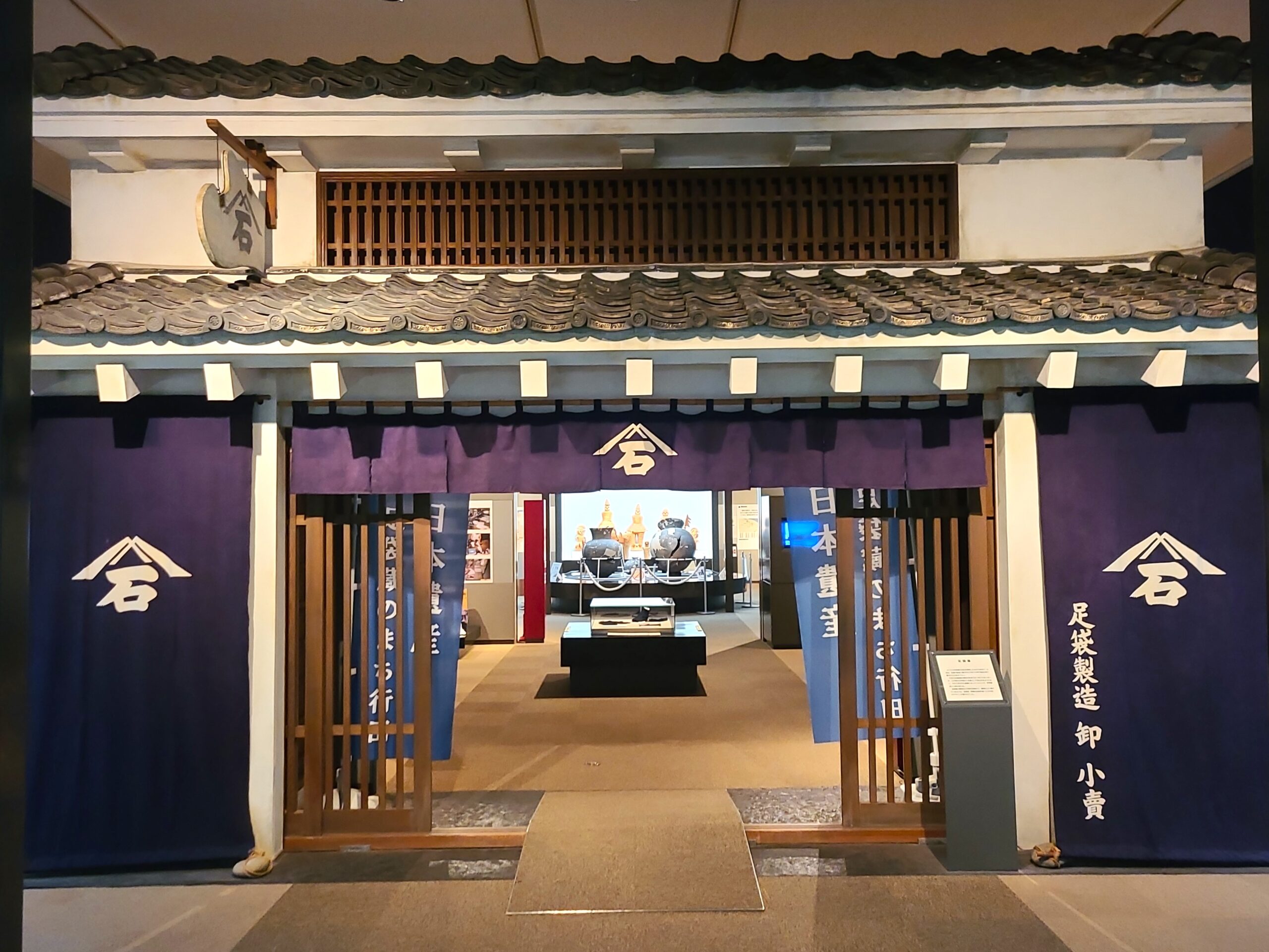 利根川、荒川の二大河川に挟まれた行田市一帯、熊谷以東の地域では、両河川の氾濫で堆積した砂質土、豊富な水、夏季の高温が綿花や藍の栽培に適していました。NHK大河ドラマ「晴天を衝け」で第一銀行を創業した渋沢栄一もこの地方での藍商人であったといいます。綿花の栽培は、明治時代中期まで盛んに行われ、これらを原料とした藍染の綿布生産が盛んになり、これを原料に行田のまちで培われた縫製技術を生かして足袋つくりが始まりました。行田足袋は「貞淳年間亀屋某なる者専門に営業を創めたのに起こり」との伝承があり、足袋は中山道の交通に目をつけた近隣の熊谷宿を中心に始まり、当初は旅装や武装としての手甲や脚絆などを制作する長物師が宿場町の需要を見込んで製造されました。享保年間(1716~1735)頃の「行田町絵図」に3軒の足袋屋が記され、忍藩主阿部豊後守正喬が藩士の婦女子に足袋づくりを奨励したことから下級武士や農家の婦女子の副業として家内手工業において盛んになり、天保年間(1830~1844)頃には27軒もの足袋屋が行田のまちに軒を連ねるようになりました。写真は行田市郷土博物館の足袋屋の店先を模した屋根瓦の展示室入口